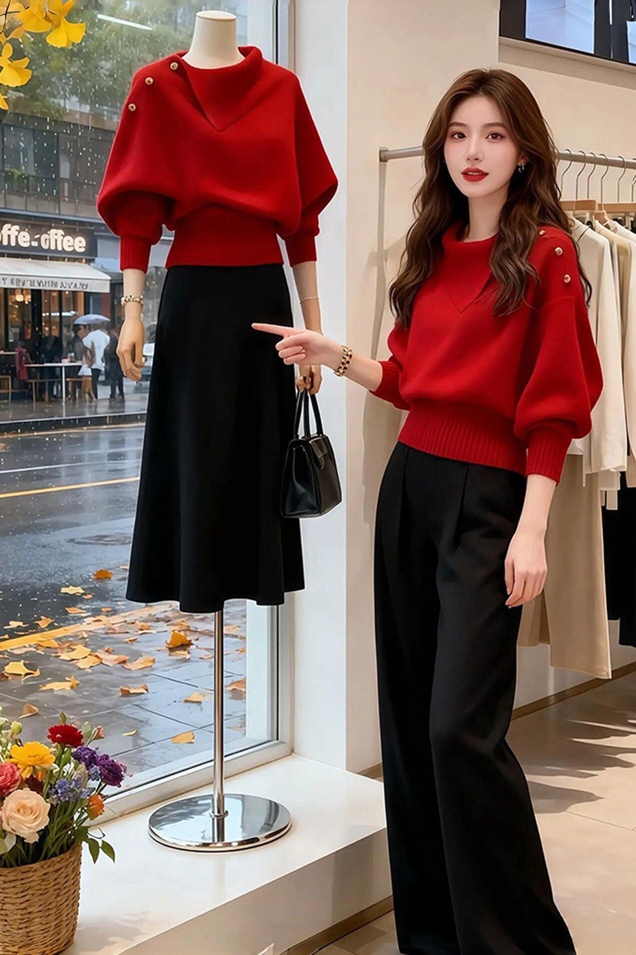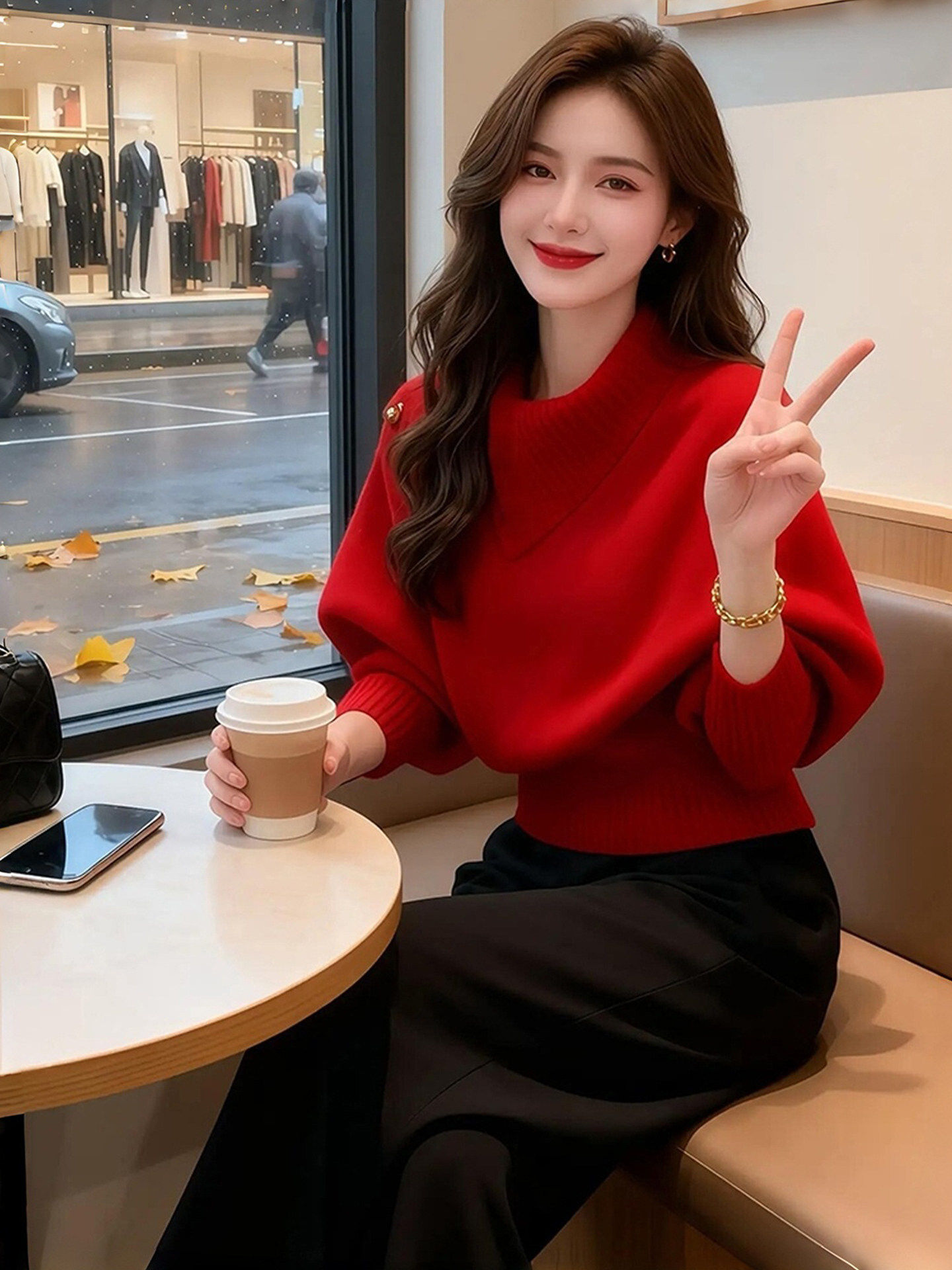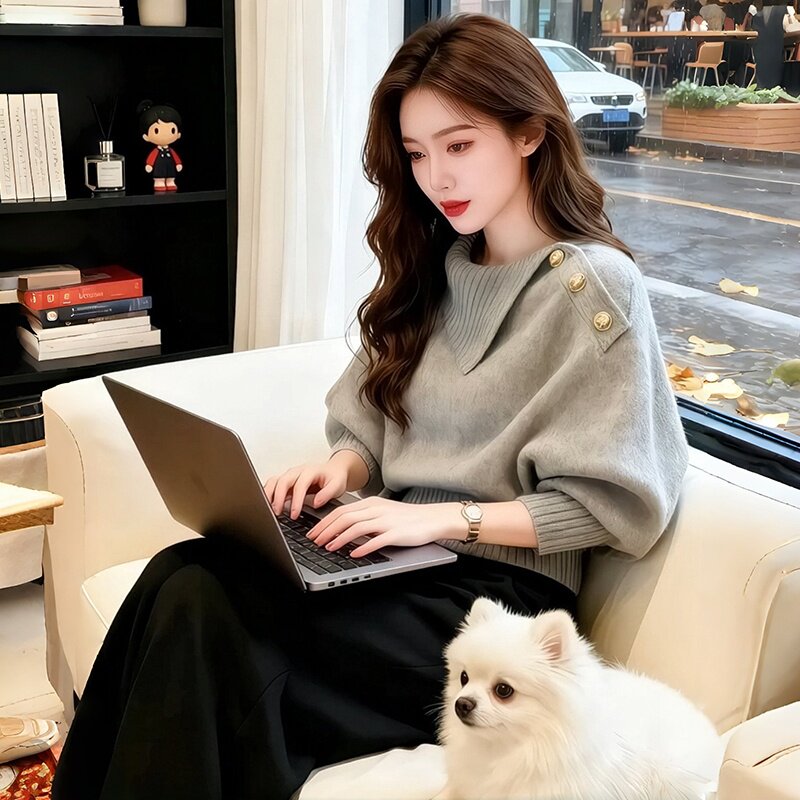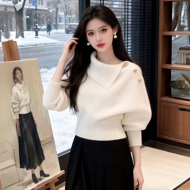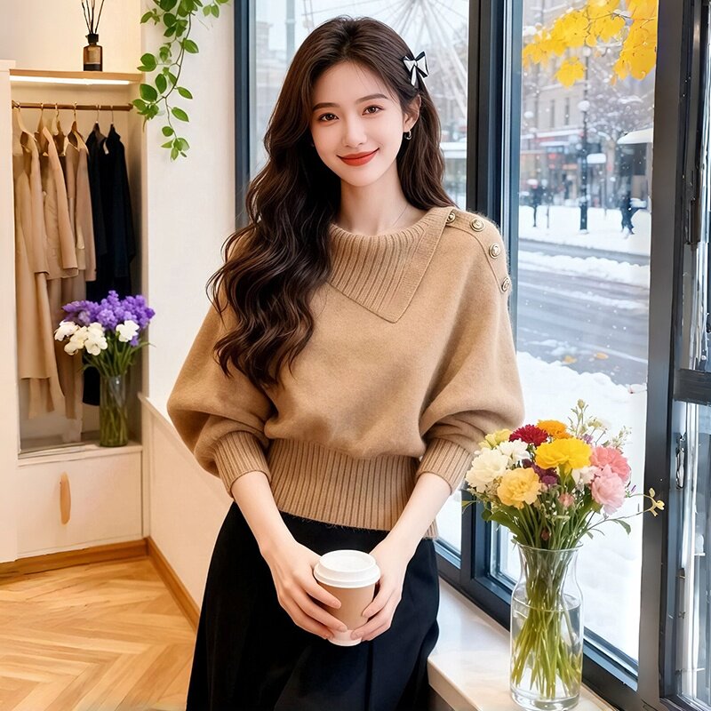 韩系宽松慵懒风高级感独特漂亮多巴胺红色不规则领针织衫毛衣女秋