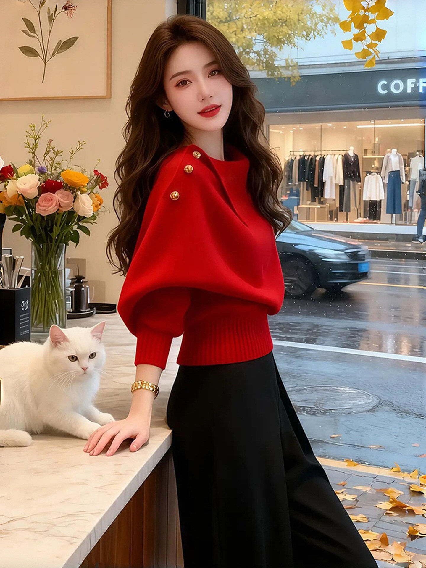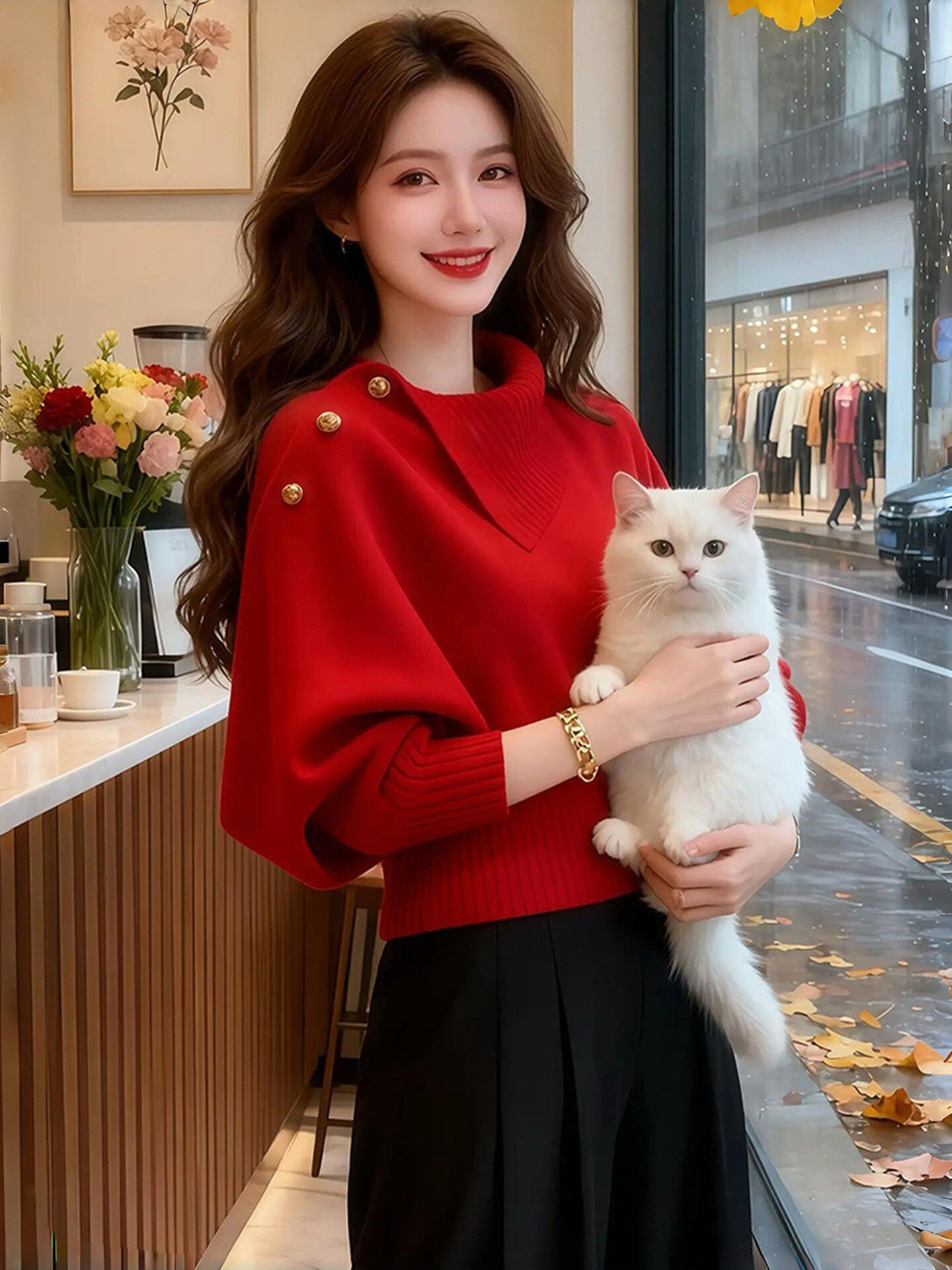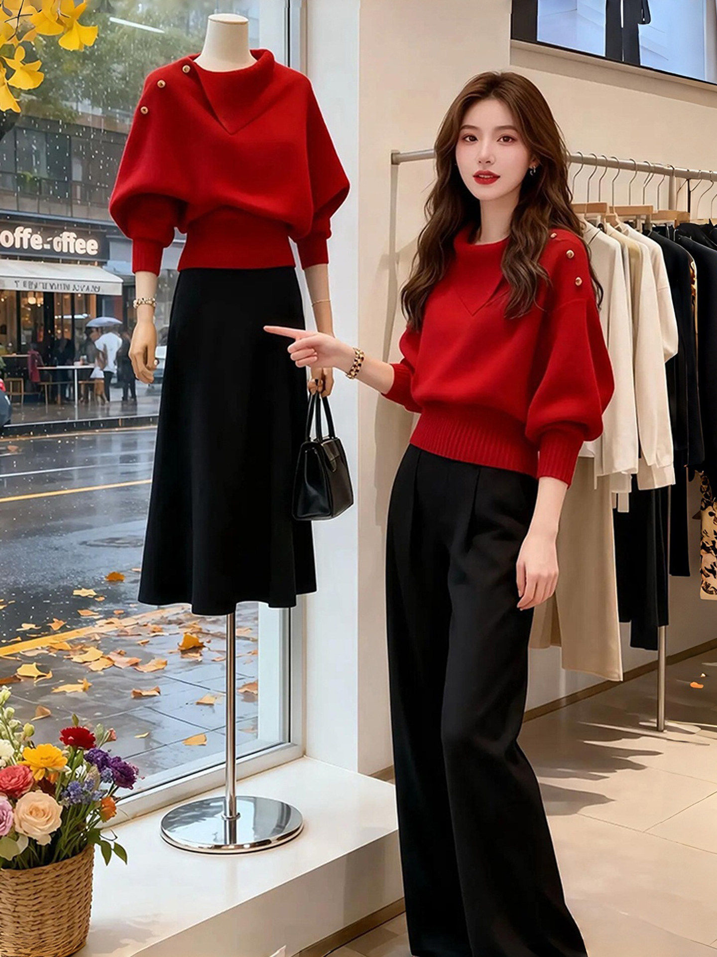 韩系宽松慵懒风高级感独特漂亮多巴胺红色不规则领针织衫毛衣女秋