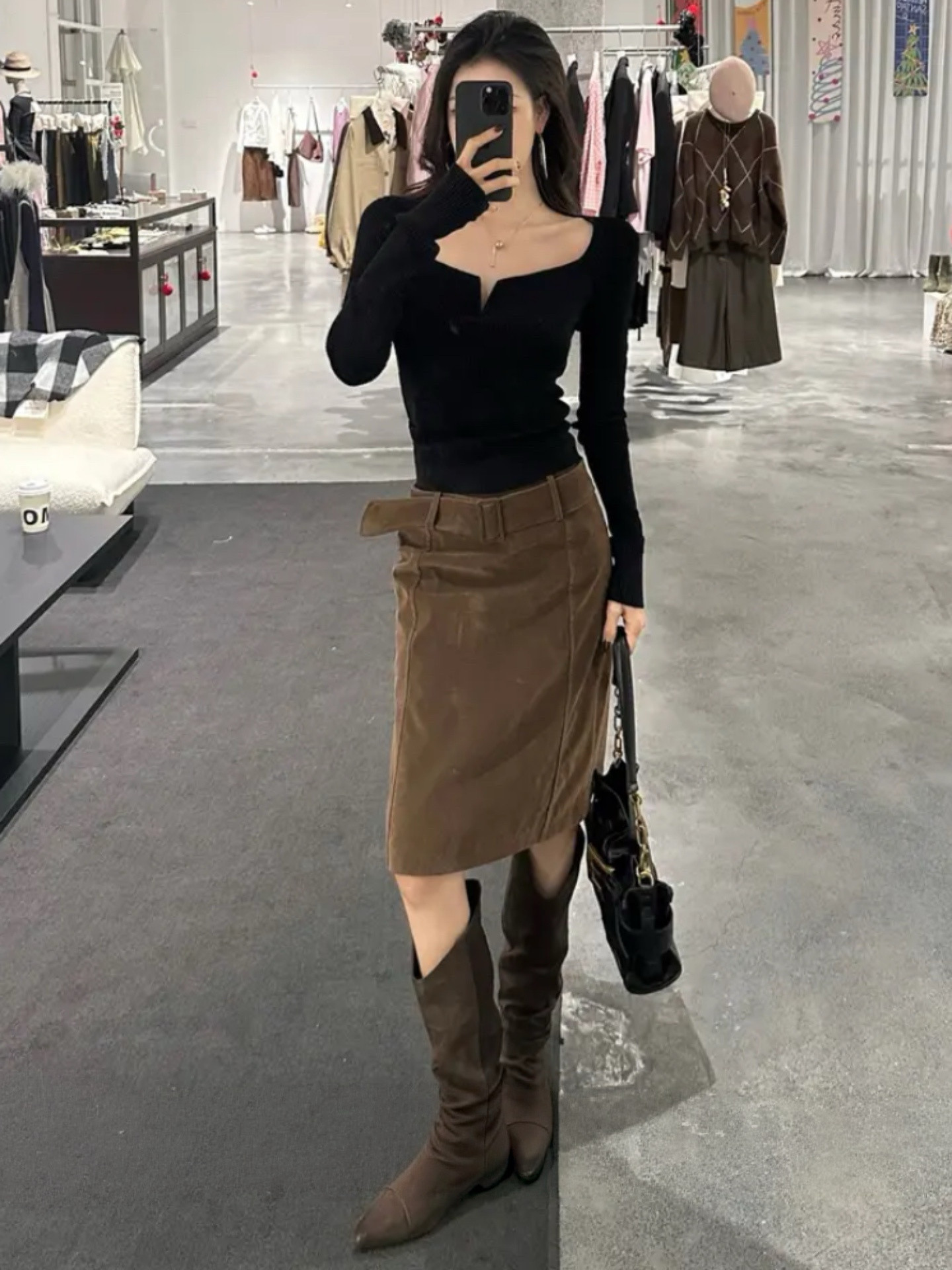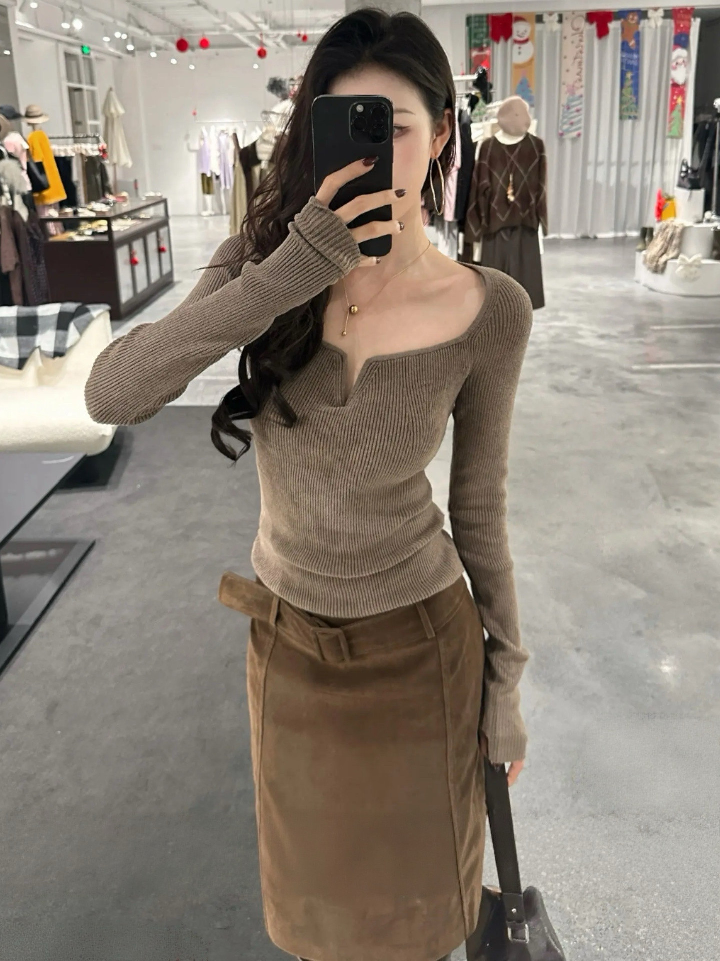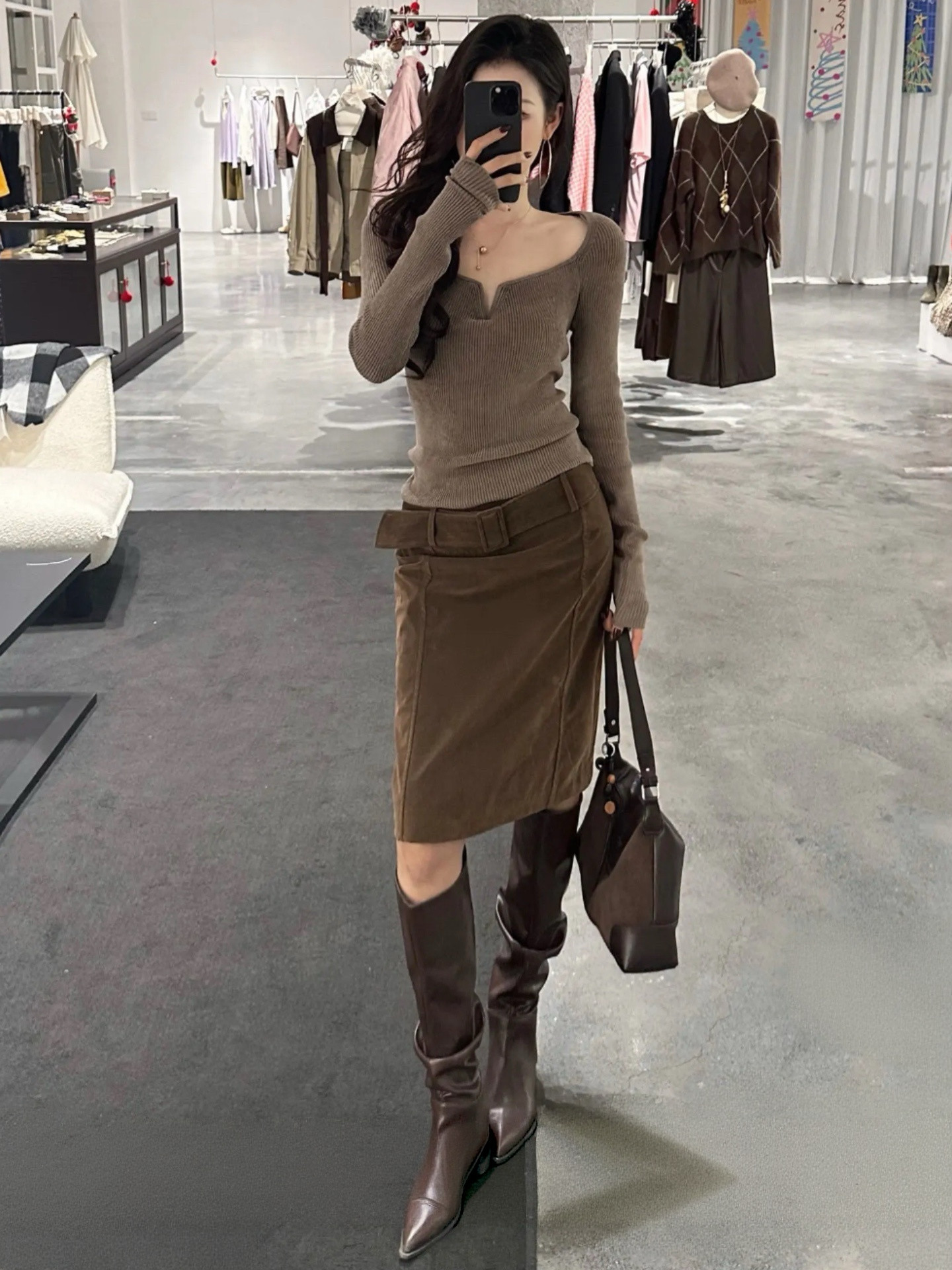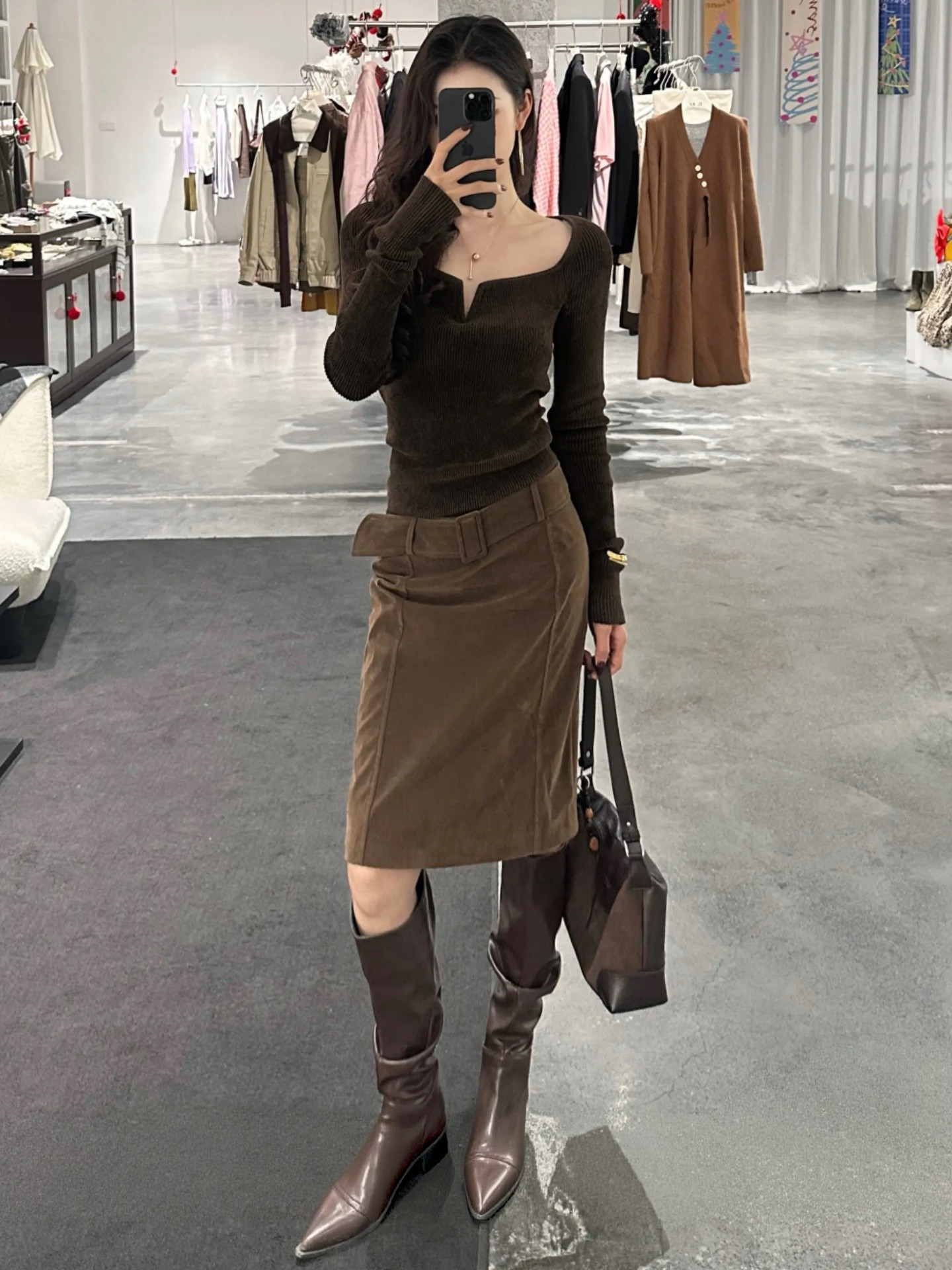 韩系冬装穿搭一整套女洋气高级感修身内搭针织衫上衣半身裙两件套