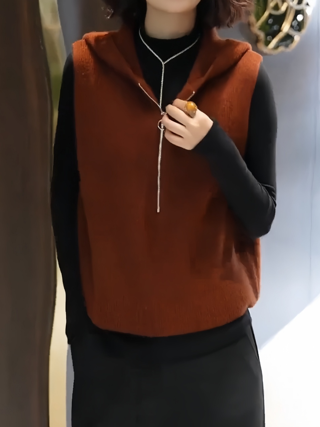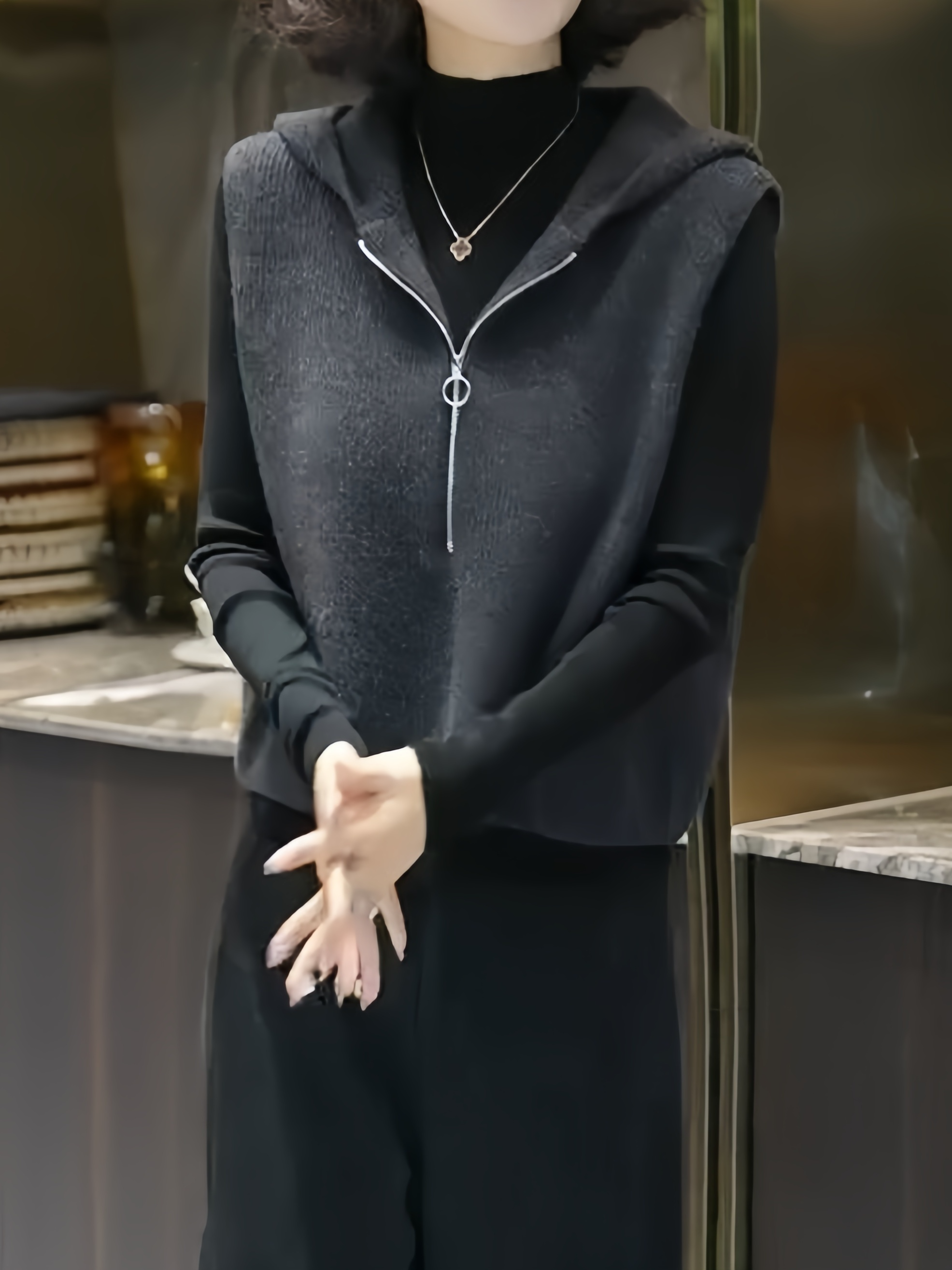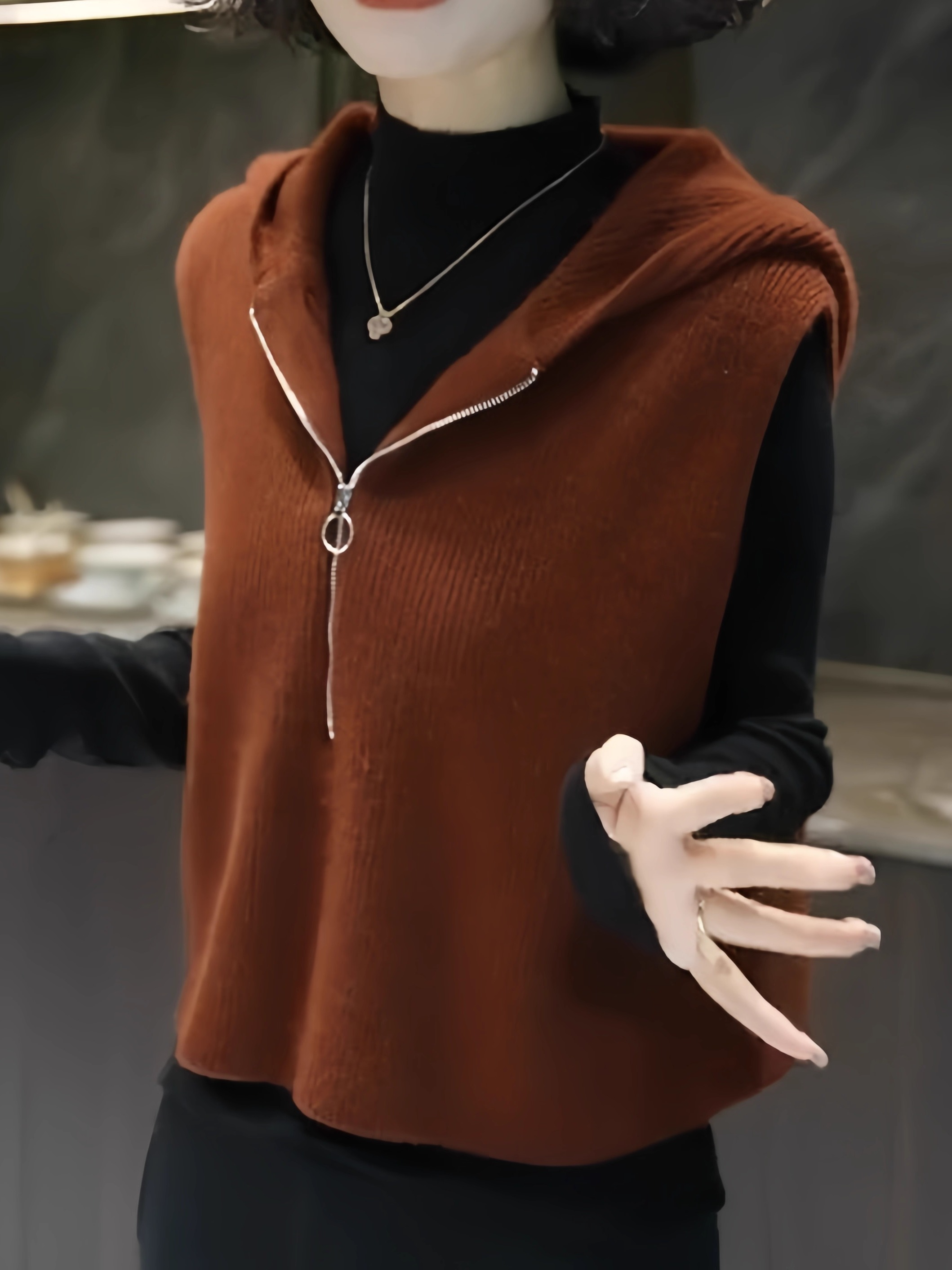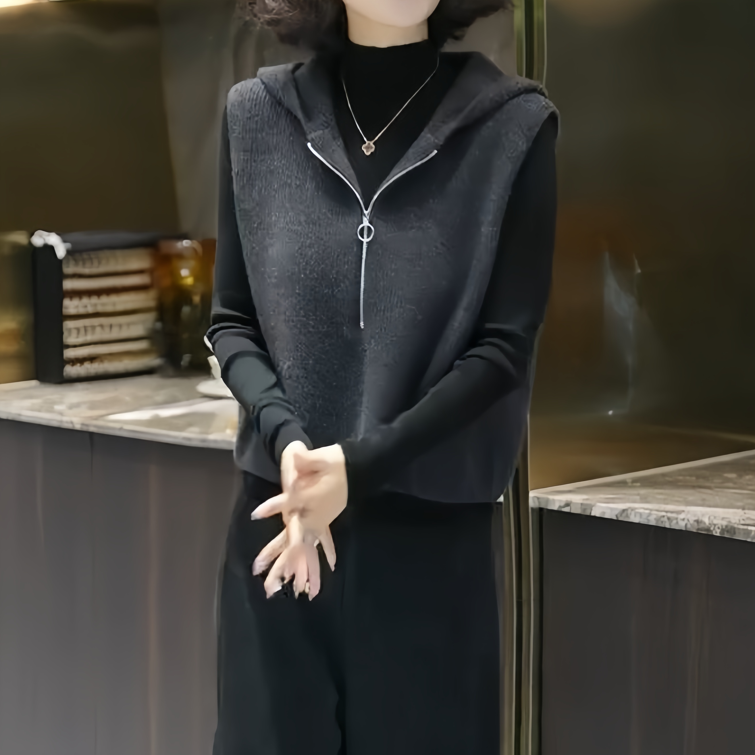 欧货高端时尚减龄纯色无袖针织马甲连帽设计感马夹上衣2025秋冬款
