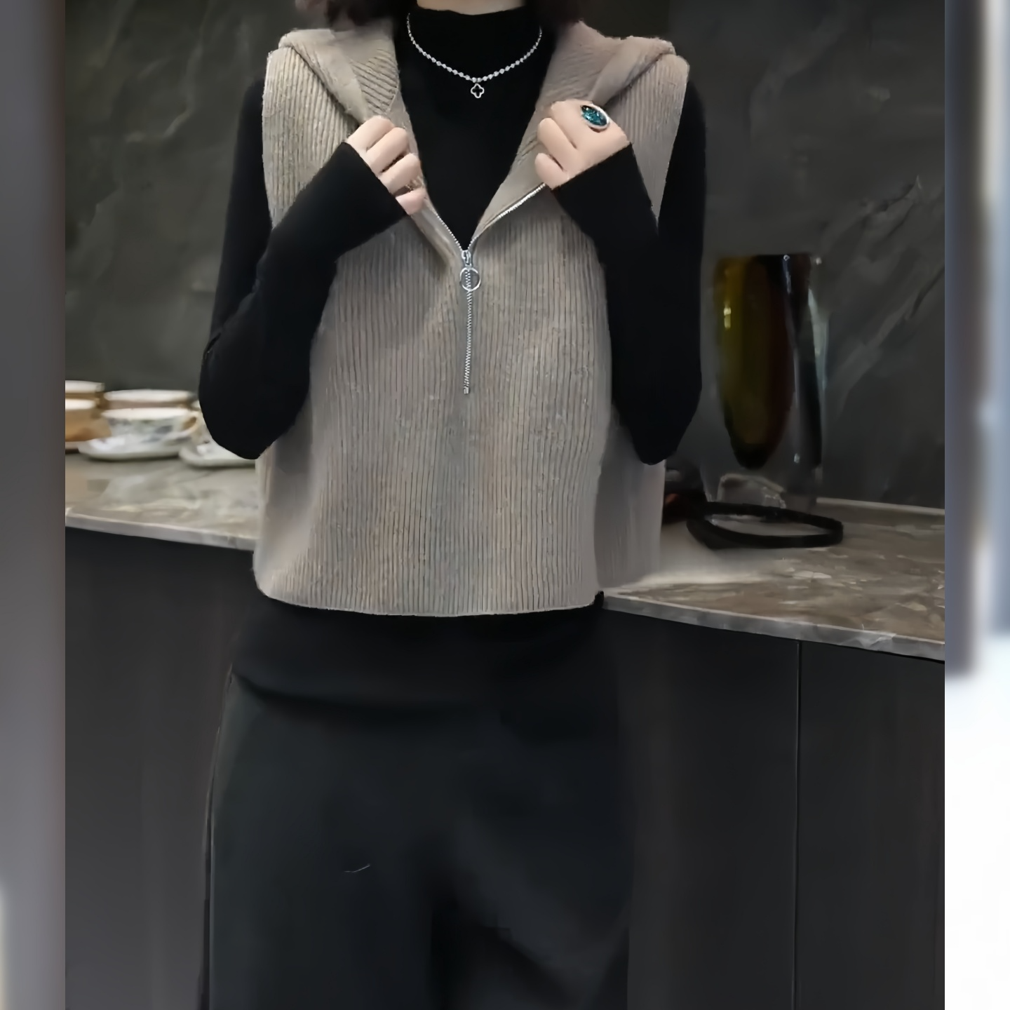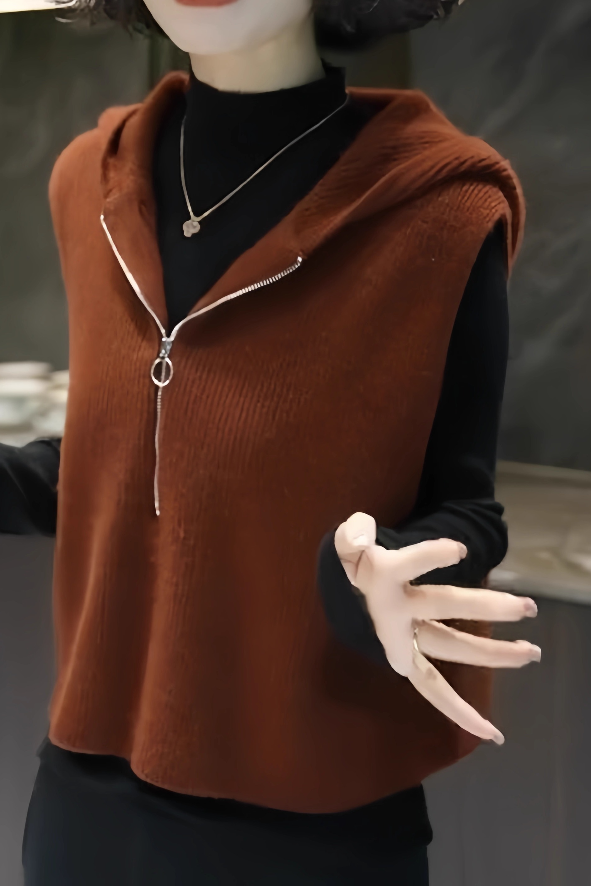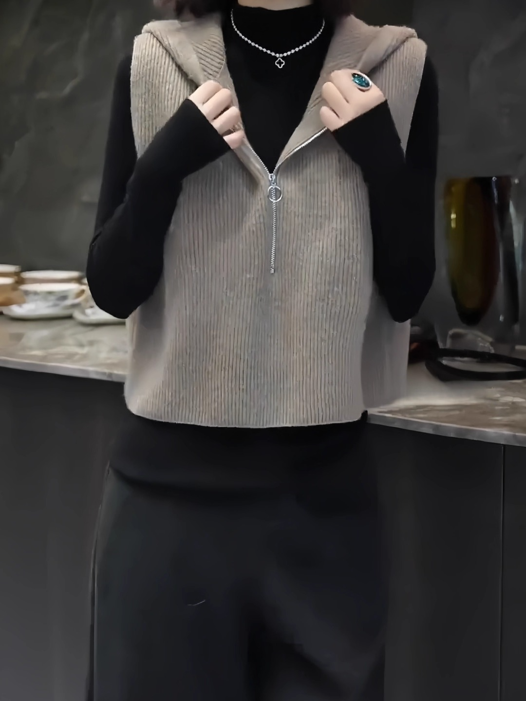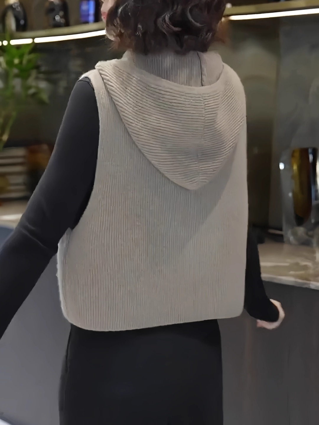 欧货高端时尚减龄纯色无袖针织马甲连帽设计感马夹上衣2025秋冬款