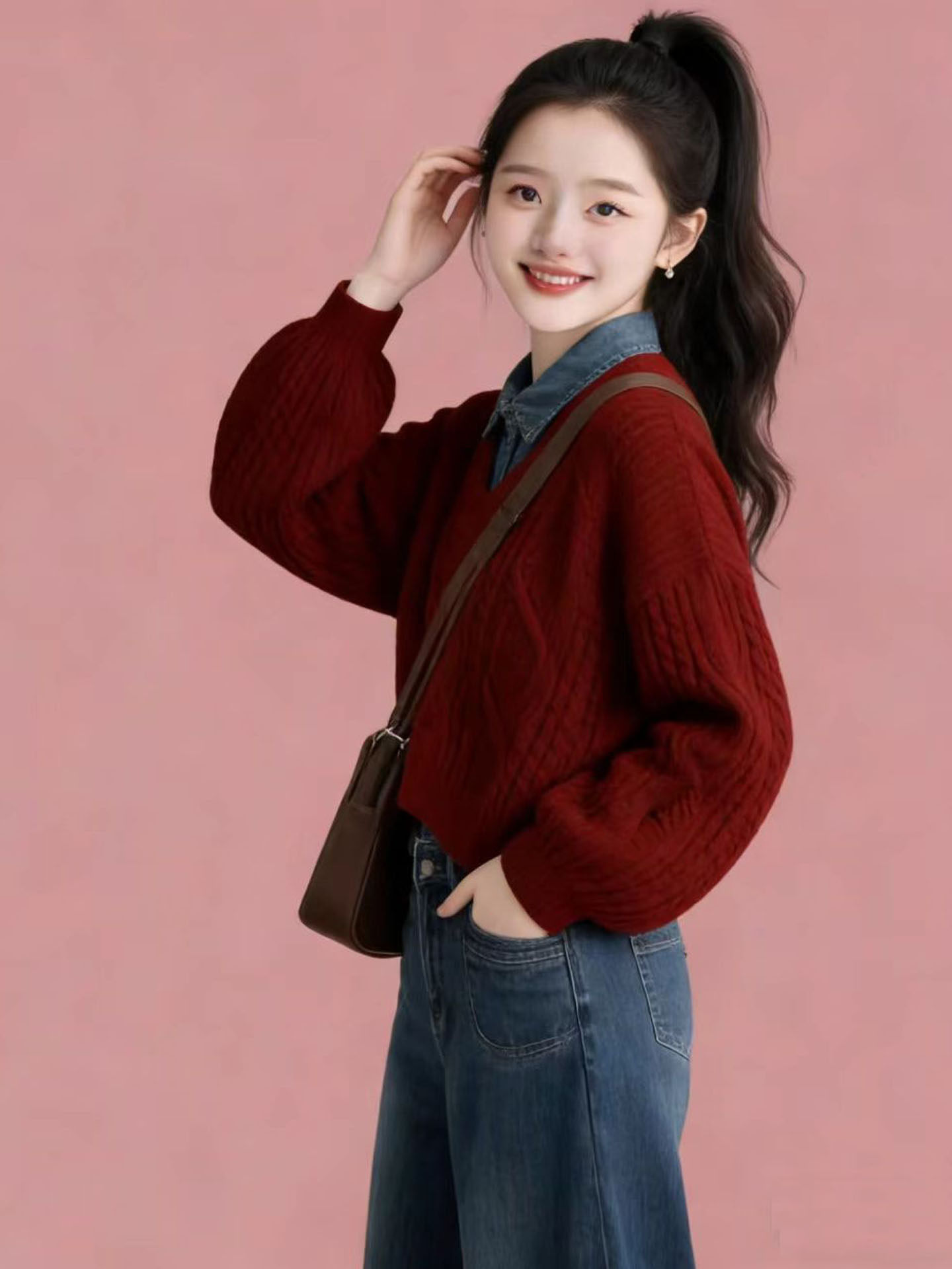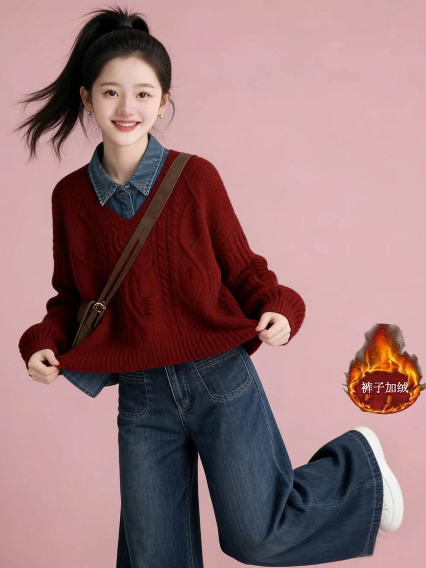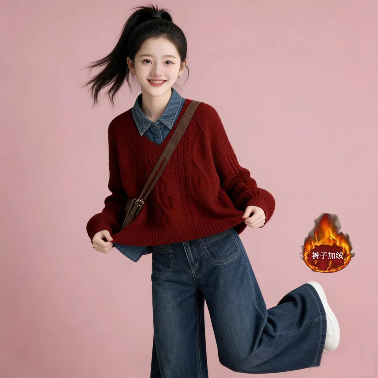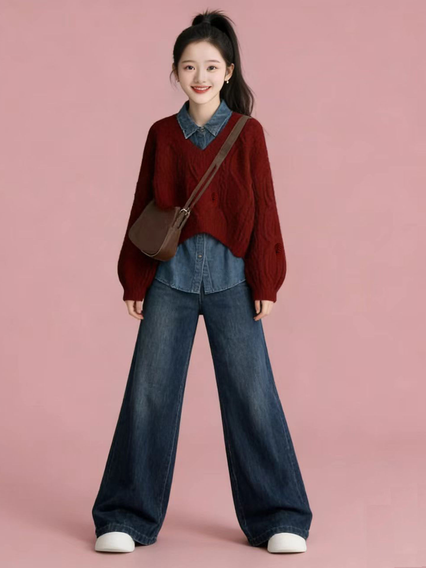 女大童奶呼呼新年秋冬红色毛衣衬衫学院风套装2026超火穿搭一整套