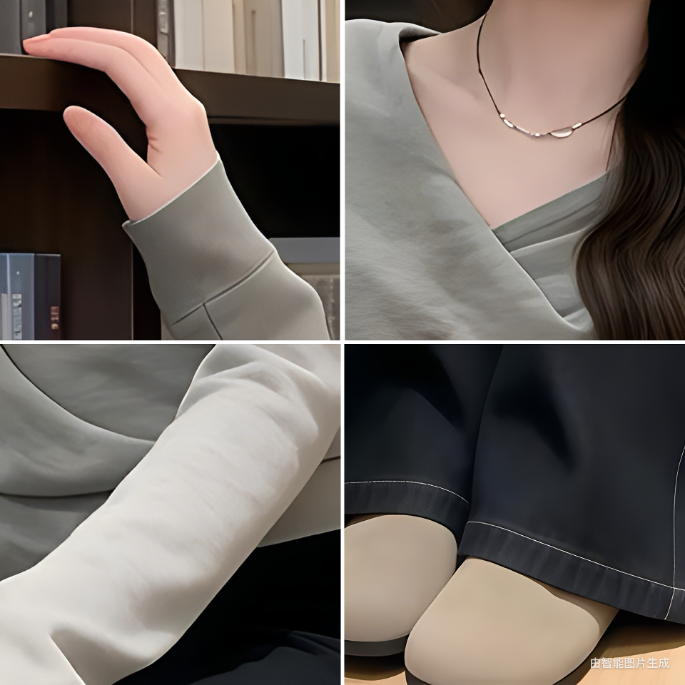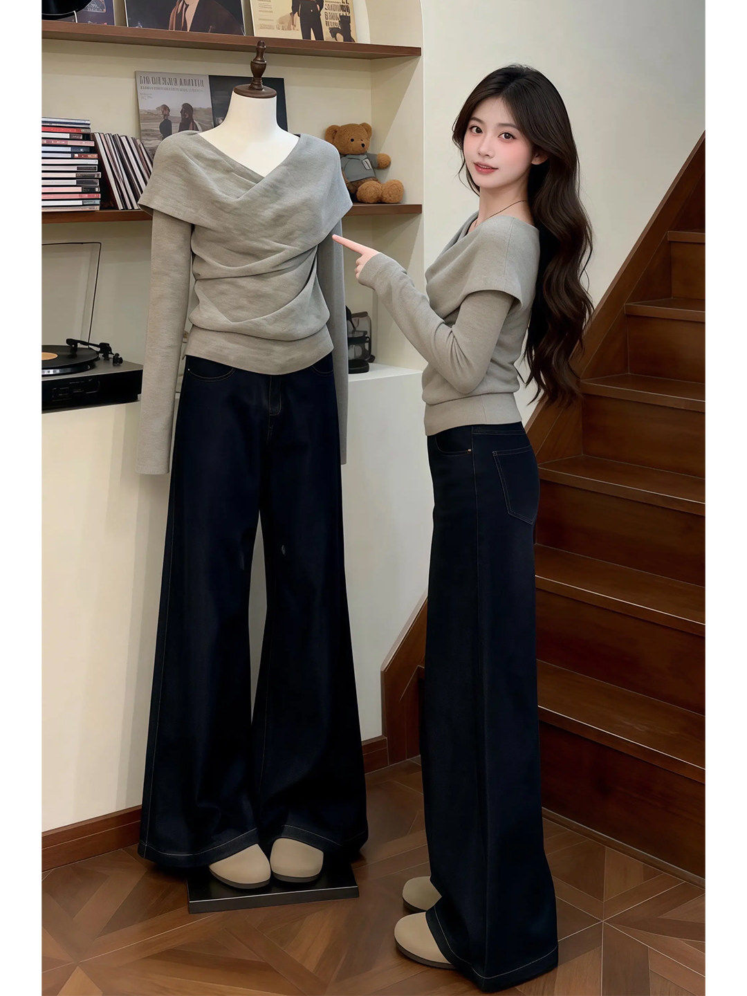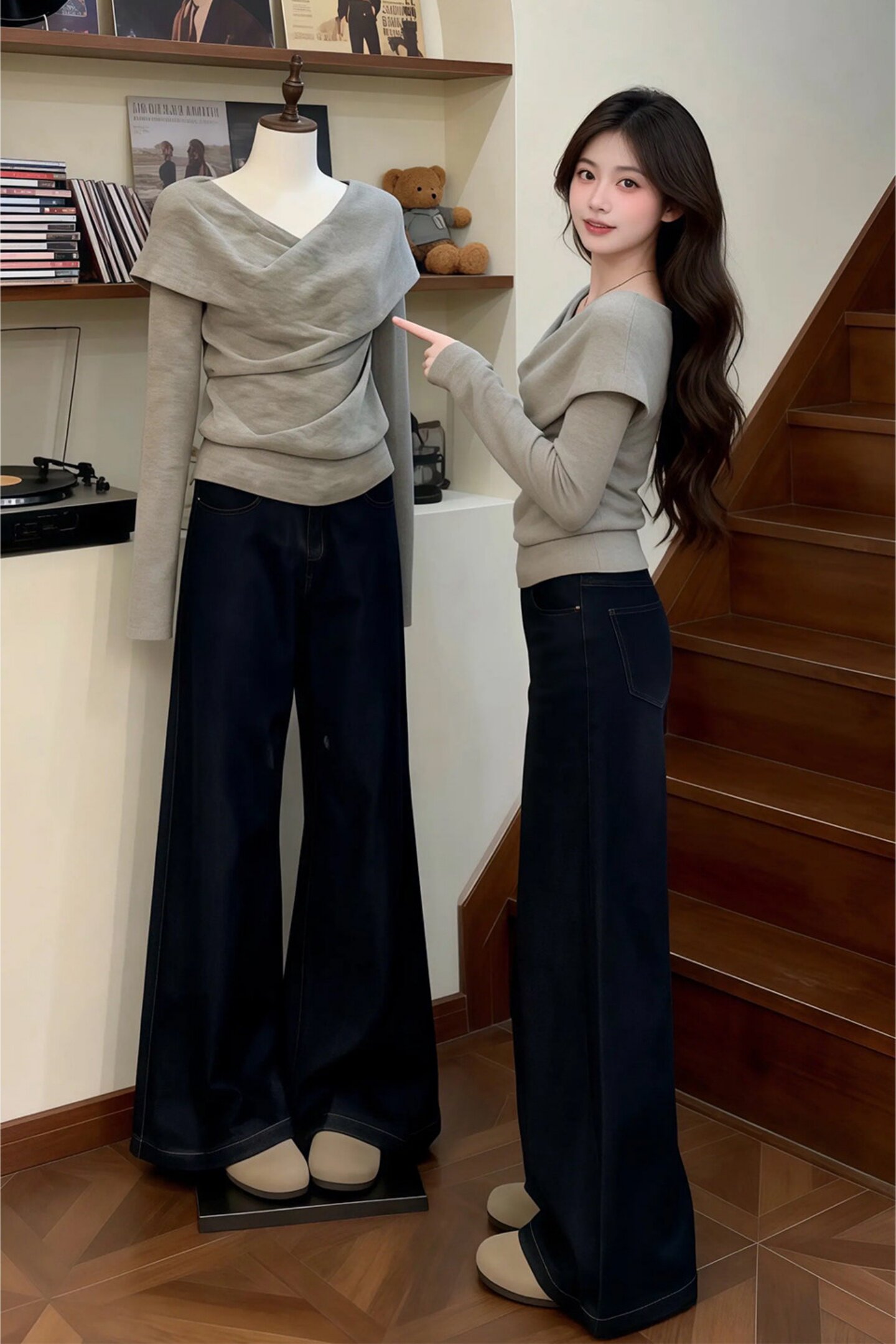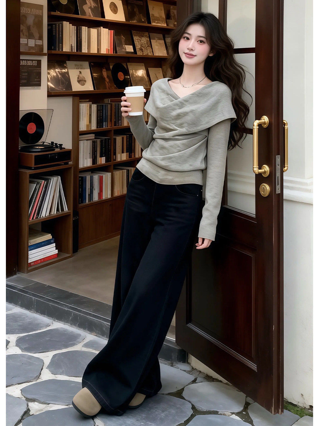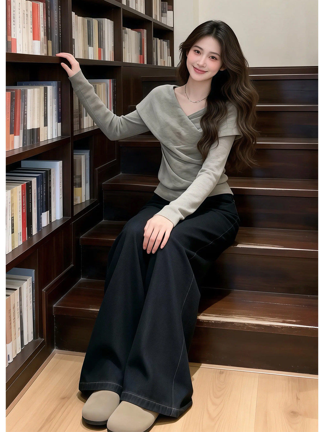 韩系一整套女ootd穿搭休闲风巨好看的复古灰色上衣阔腿裤两件套装