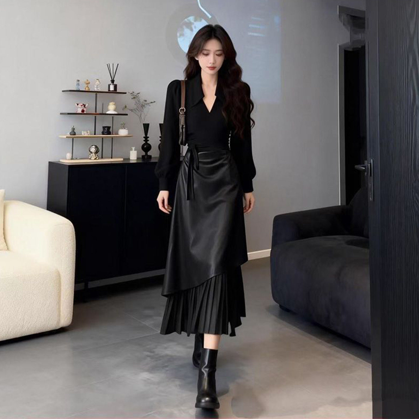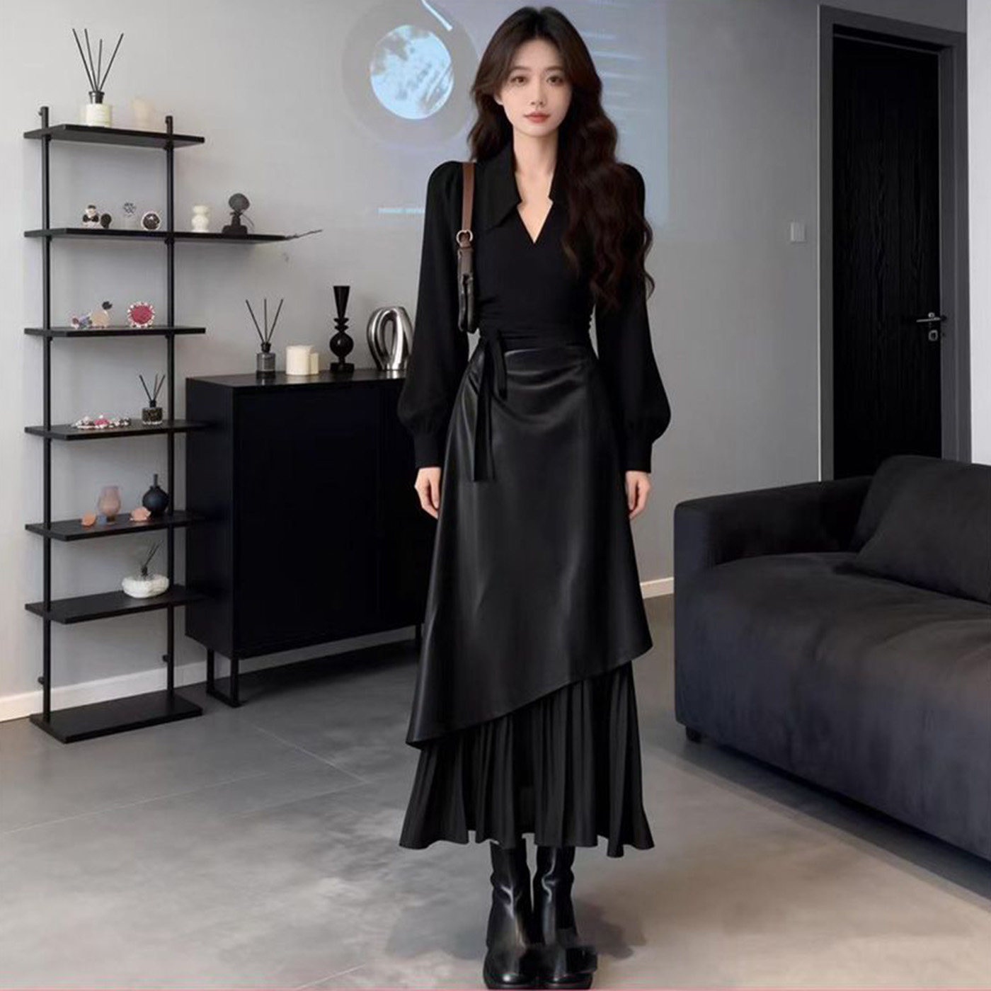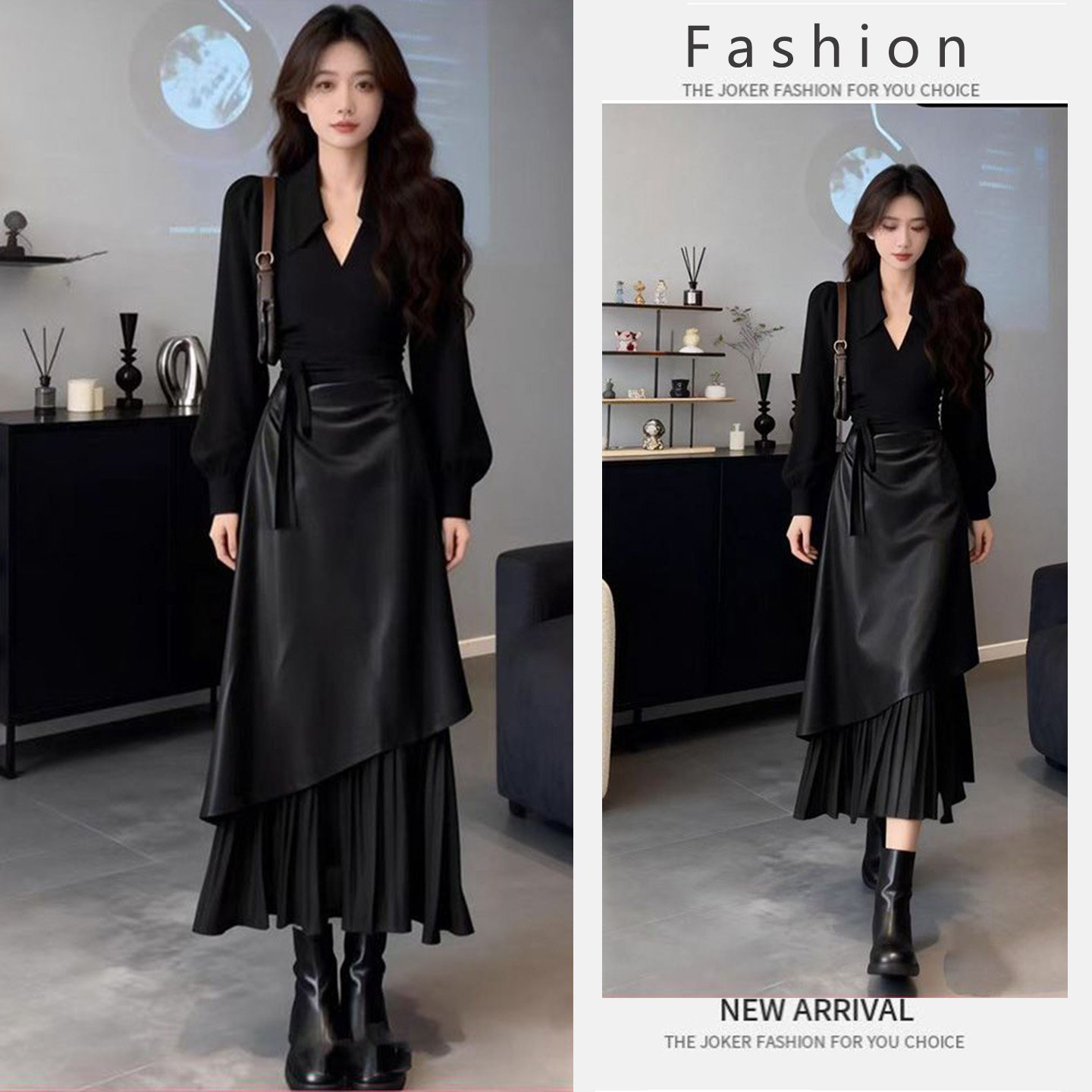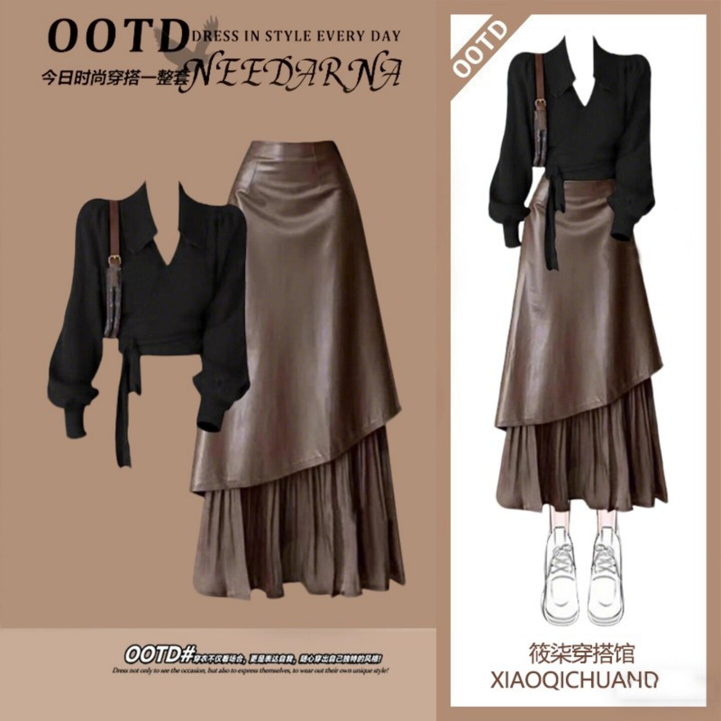 独特漂亮一整套春装时尚百搭显瘦v领正肩上衣高腰半身裙两件套装