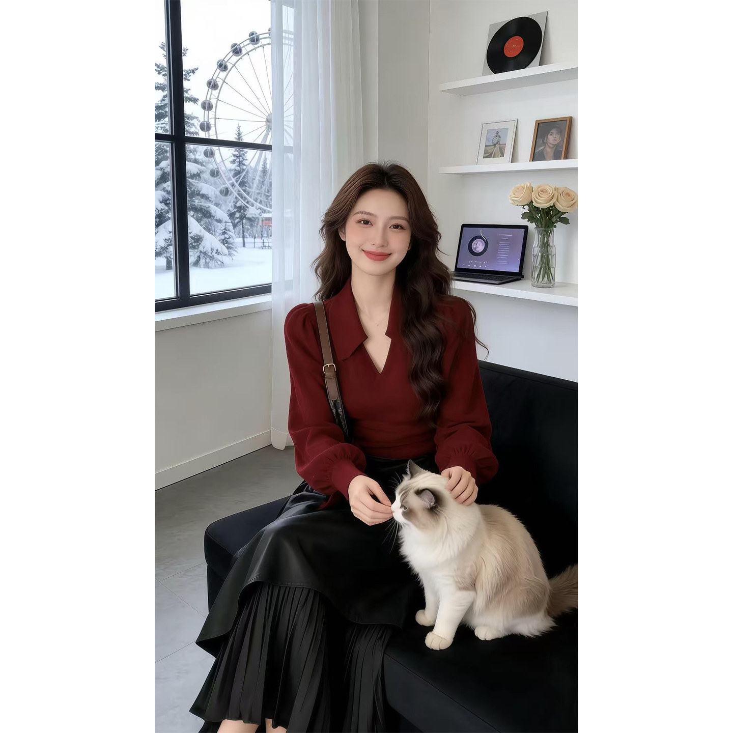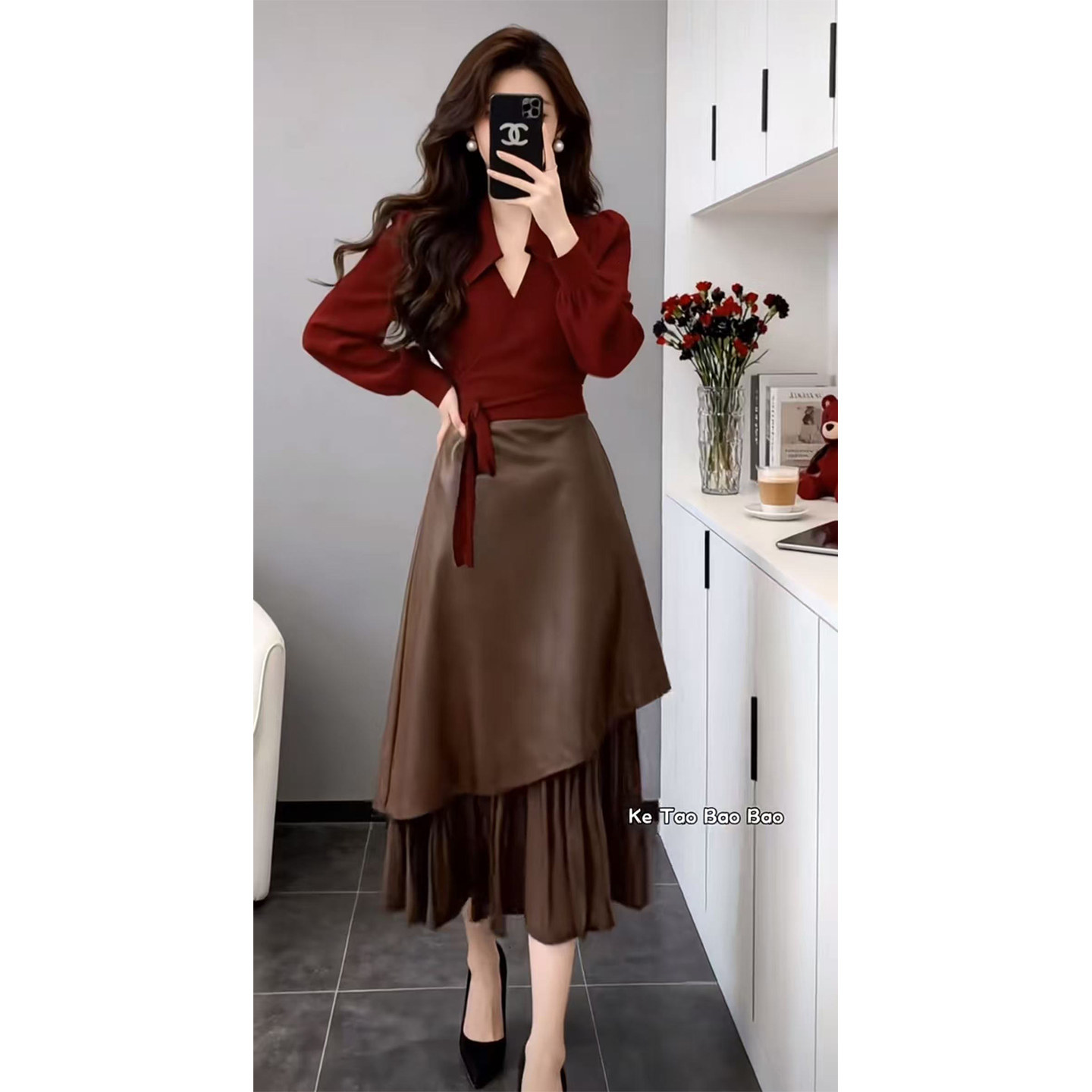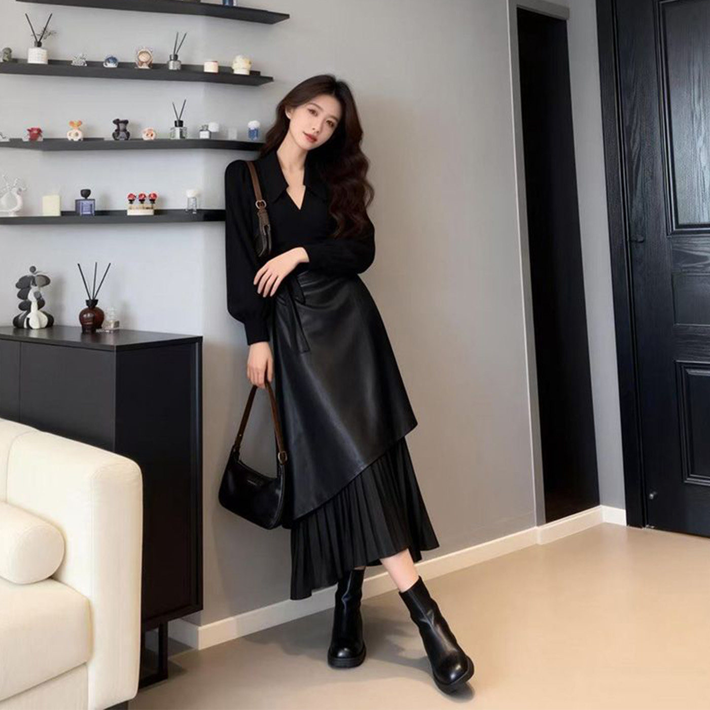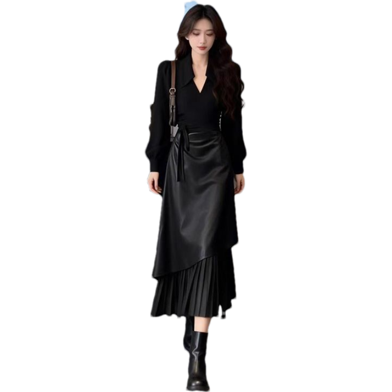 独特漂亮一整套春装时尚百搭显瘦v领正肩上衣高腰半身裙两件套装