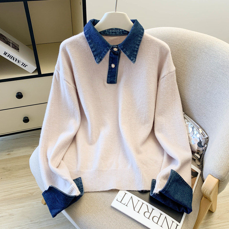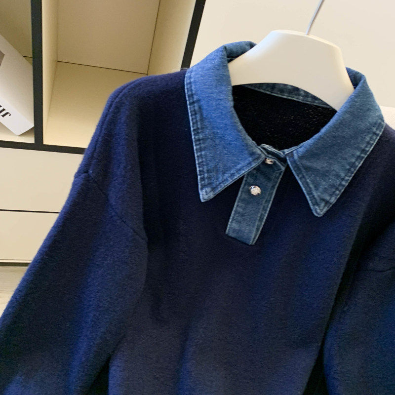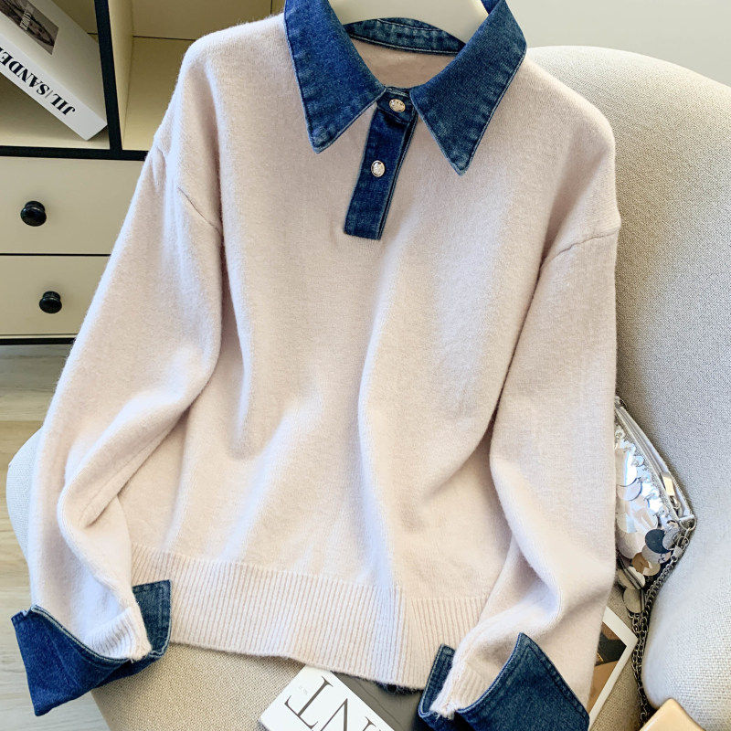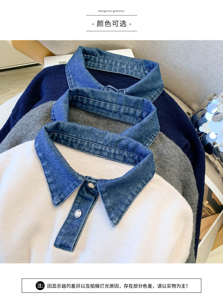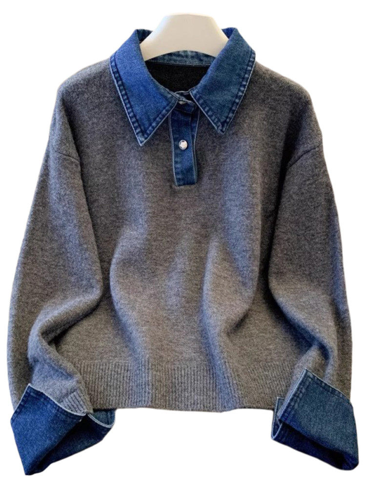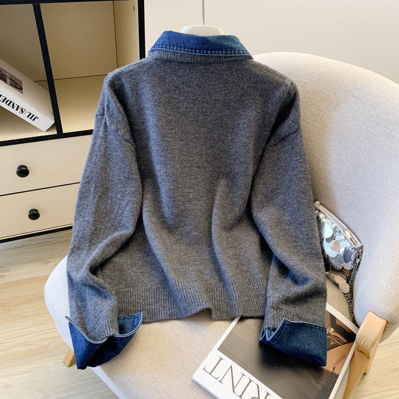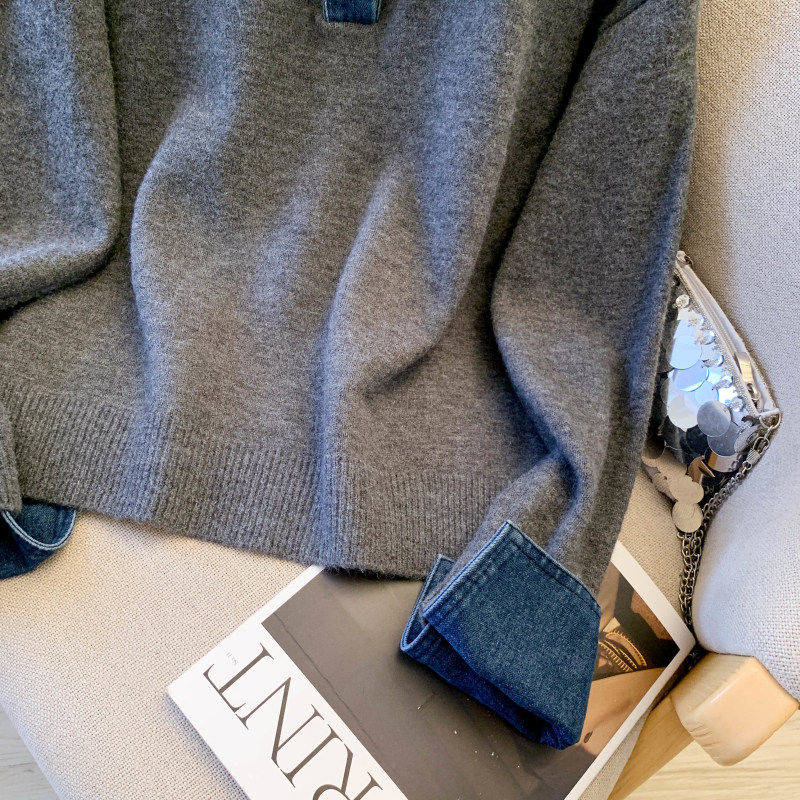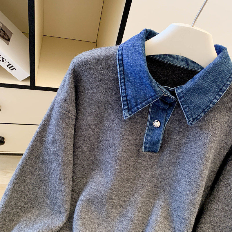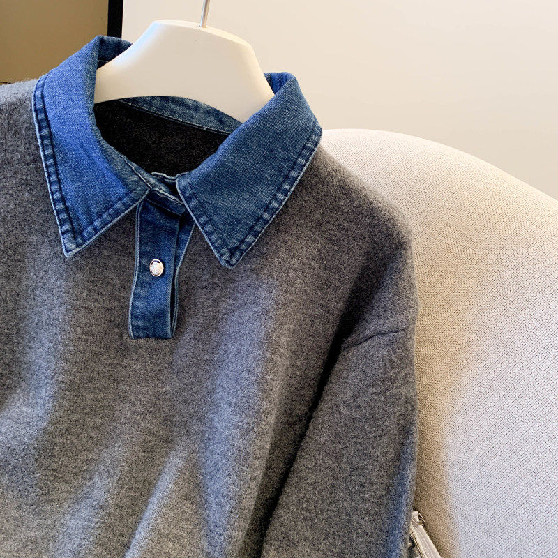 韩系假两件灰色牛仔拼接Polo领毛衣女春季新款慵懒显瘦针织衫上衣
