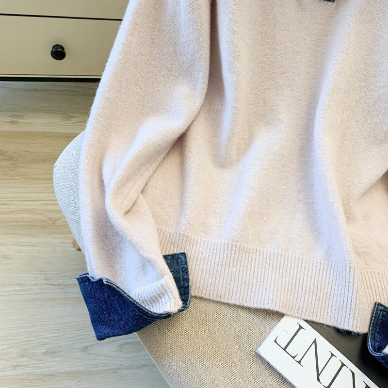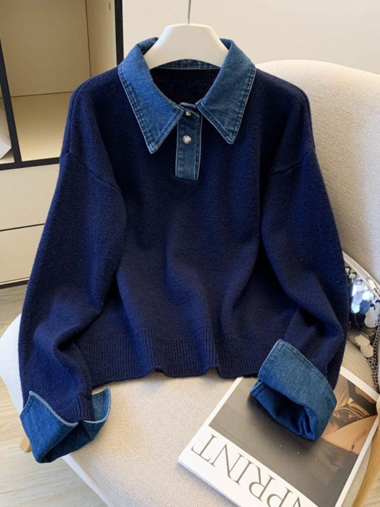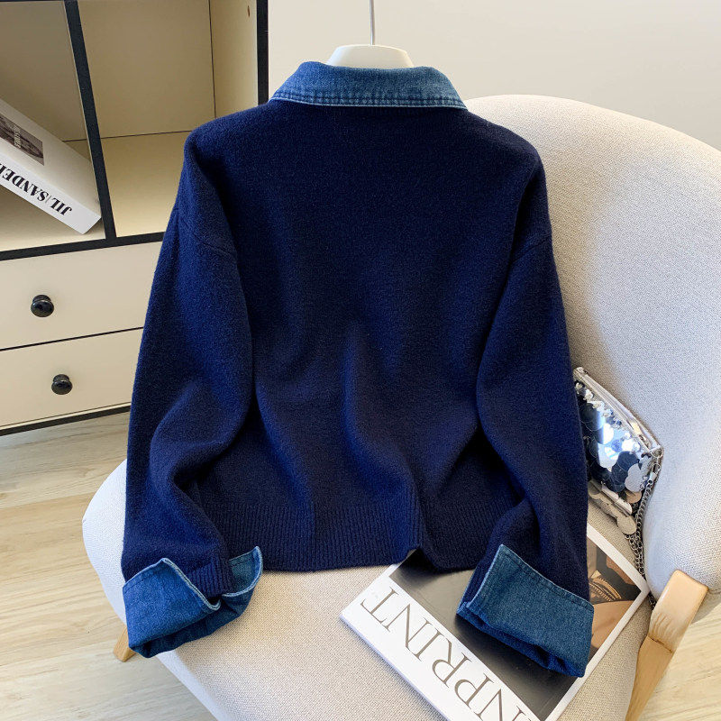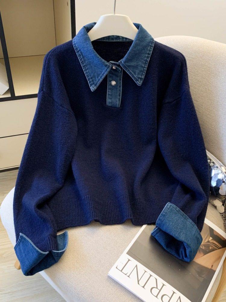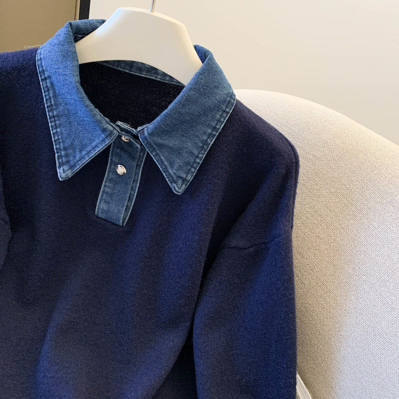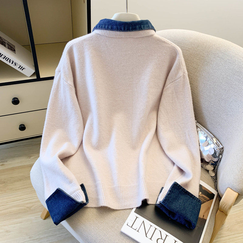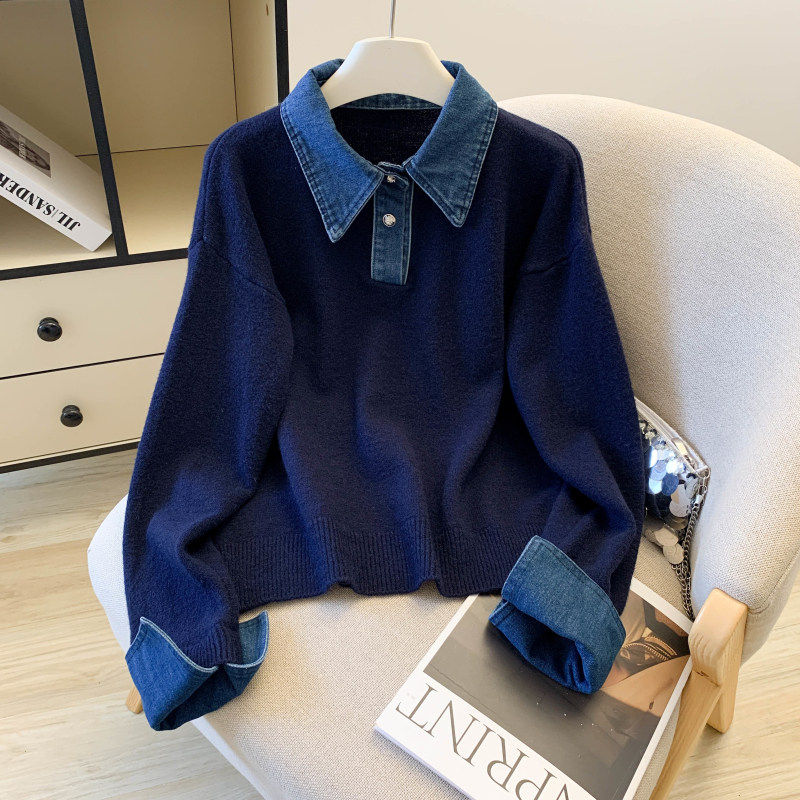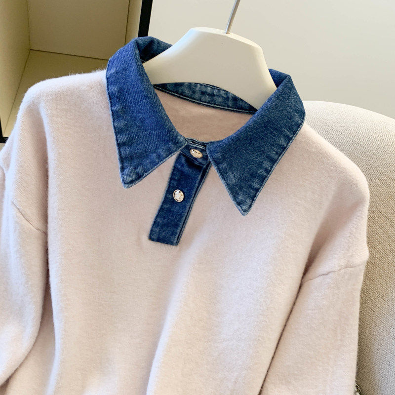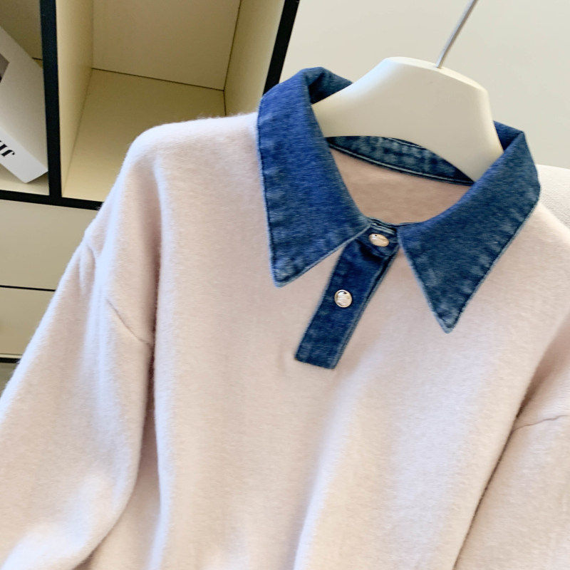 韩系假两件灰色牛仔拼接Polo领毛衣女春季新款慵懒显瘦针织衫上衣