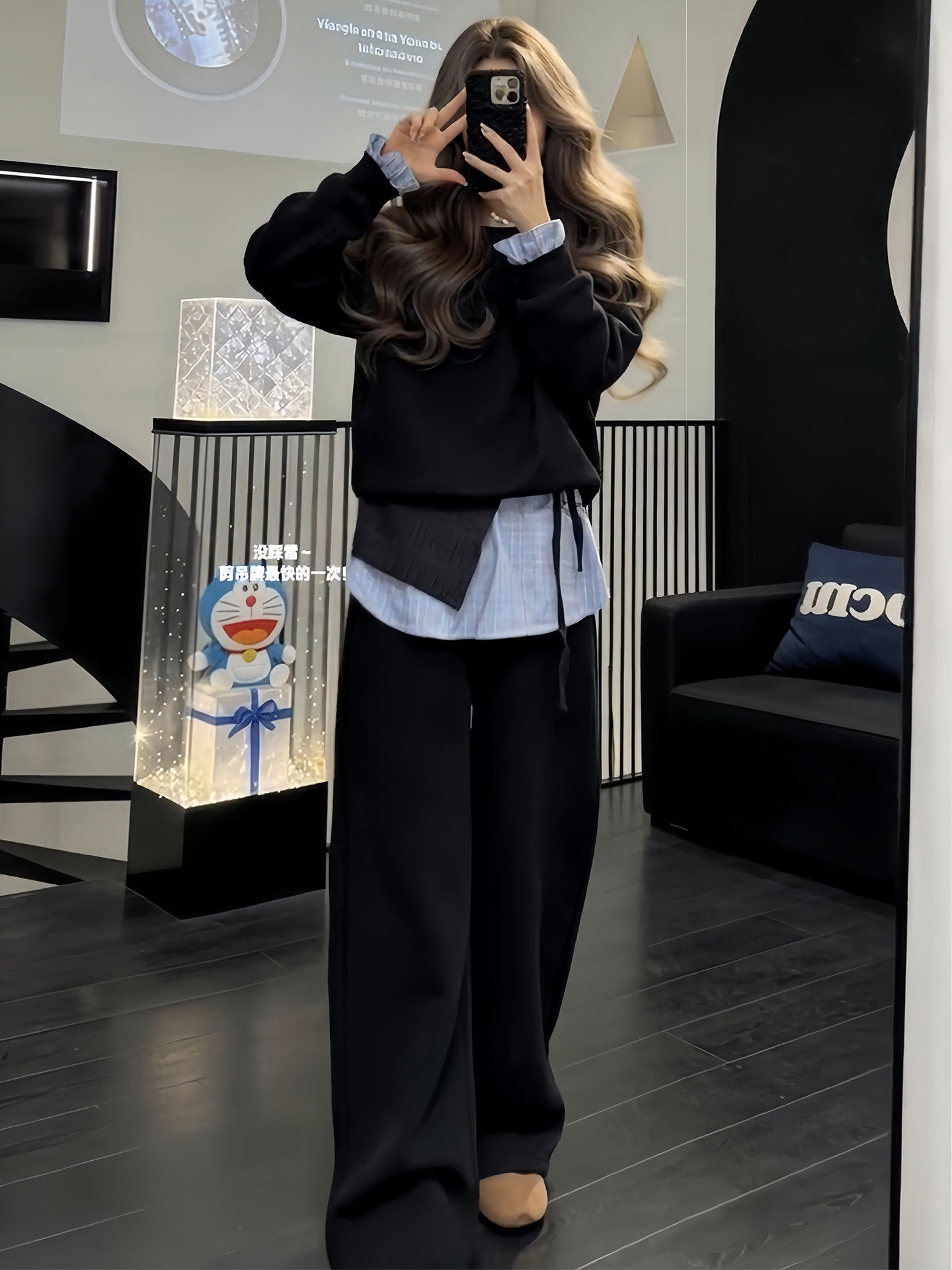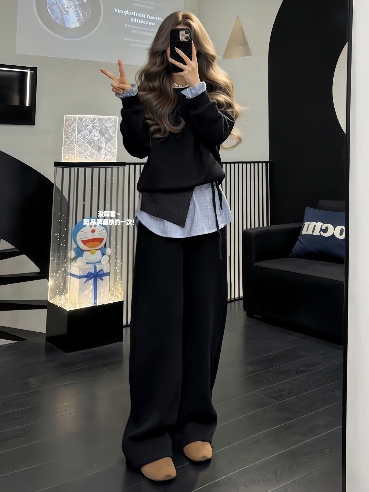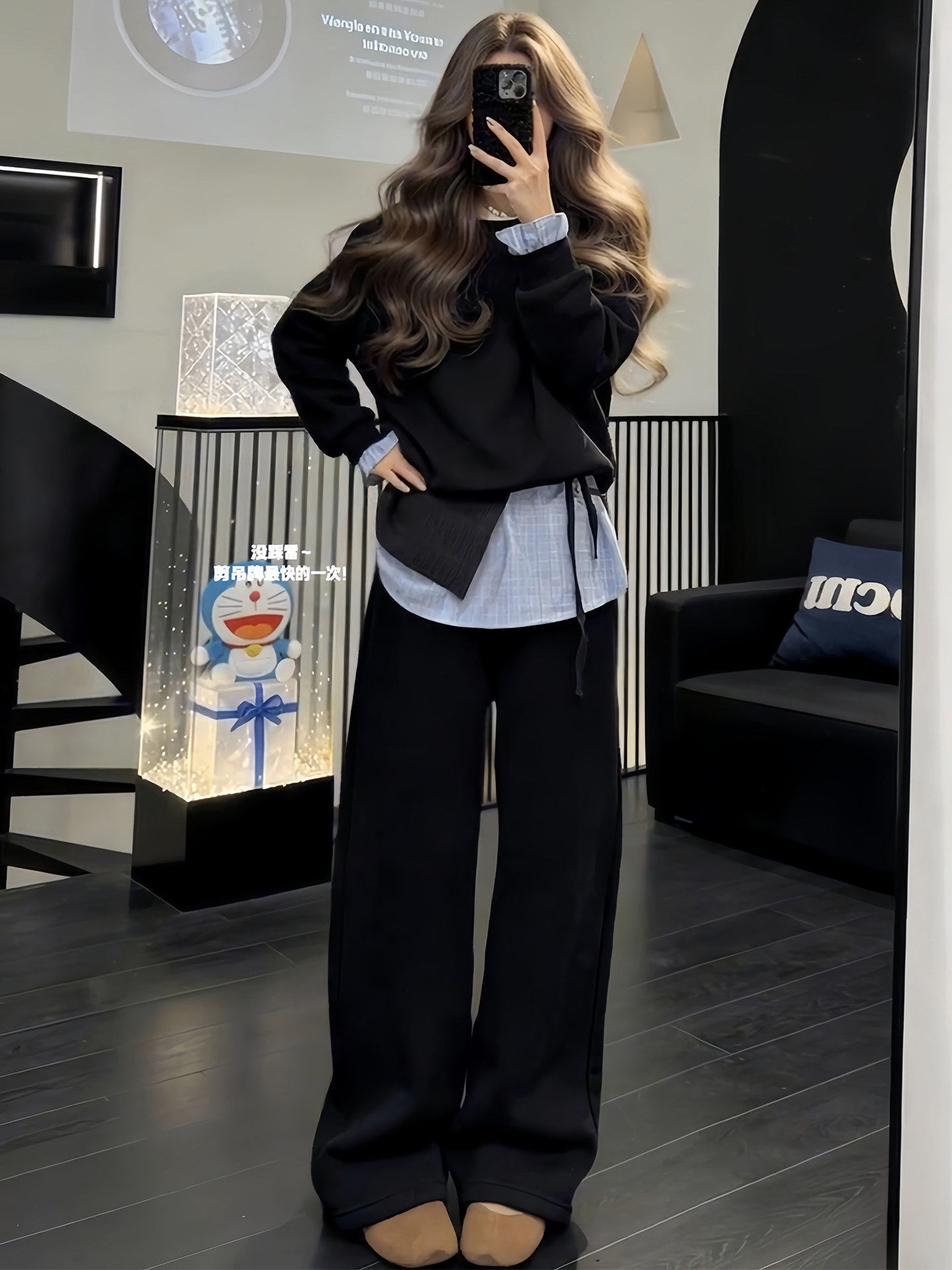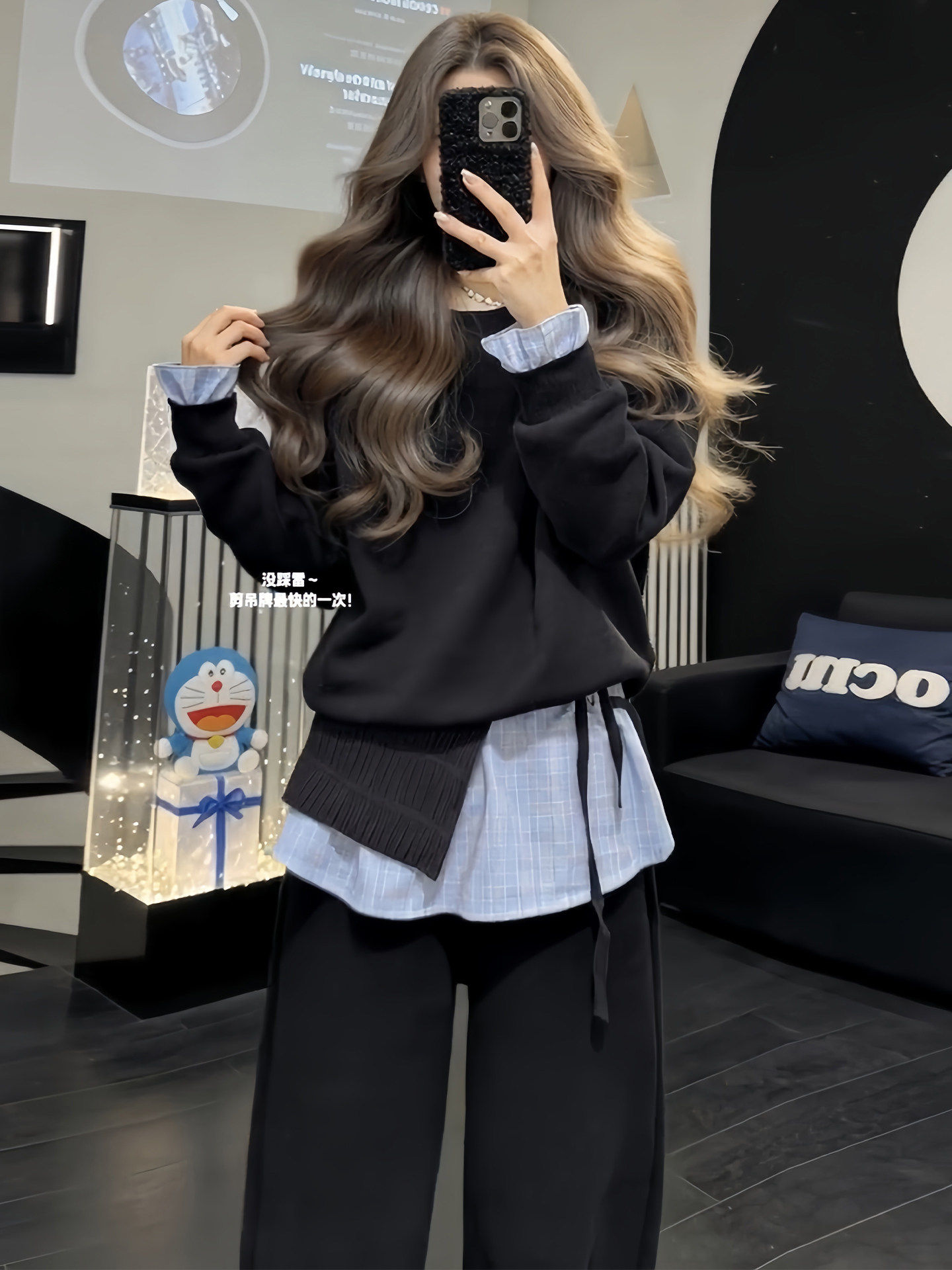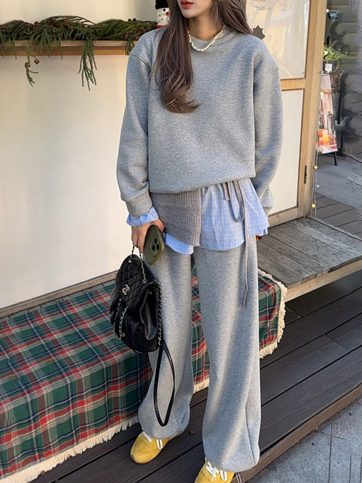 韩系高级感运动服套装女春秋宽松时尚假两件卫衣长裤休闲两件套潮
