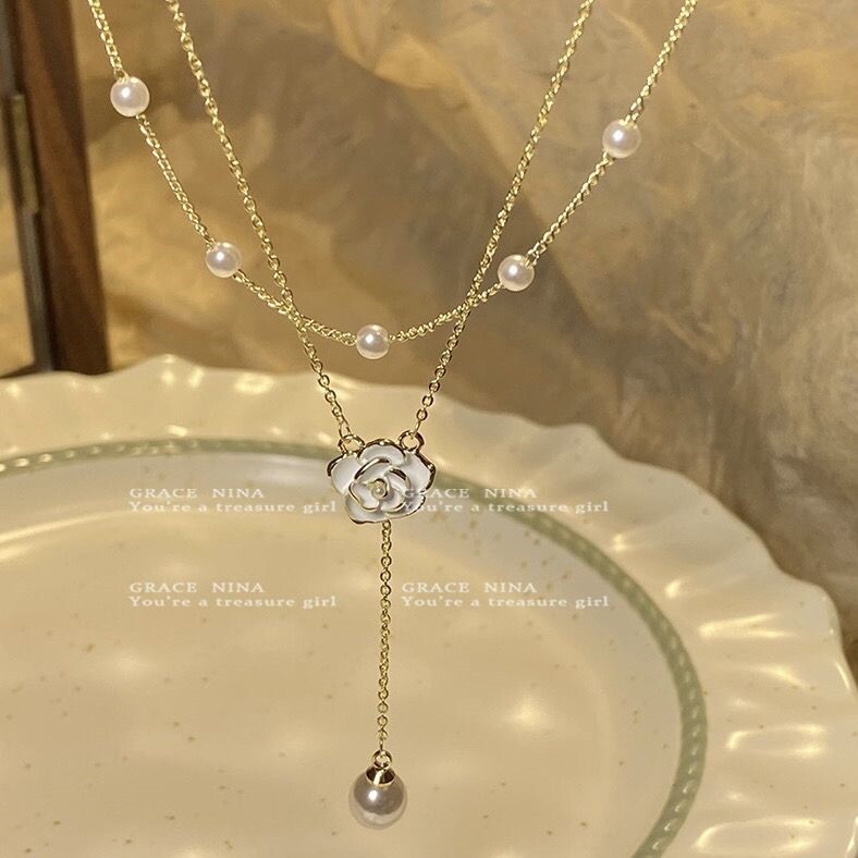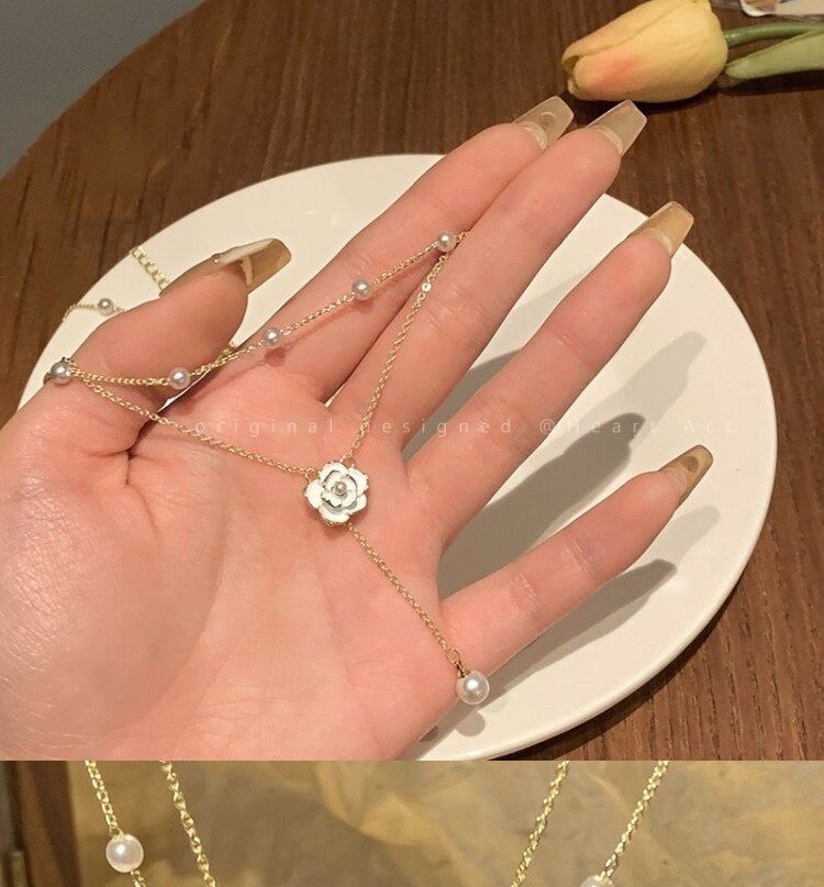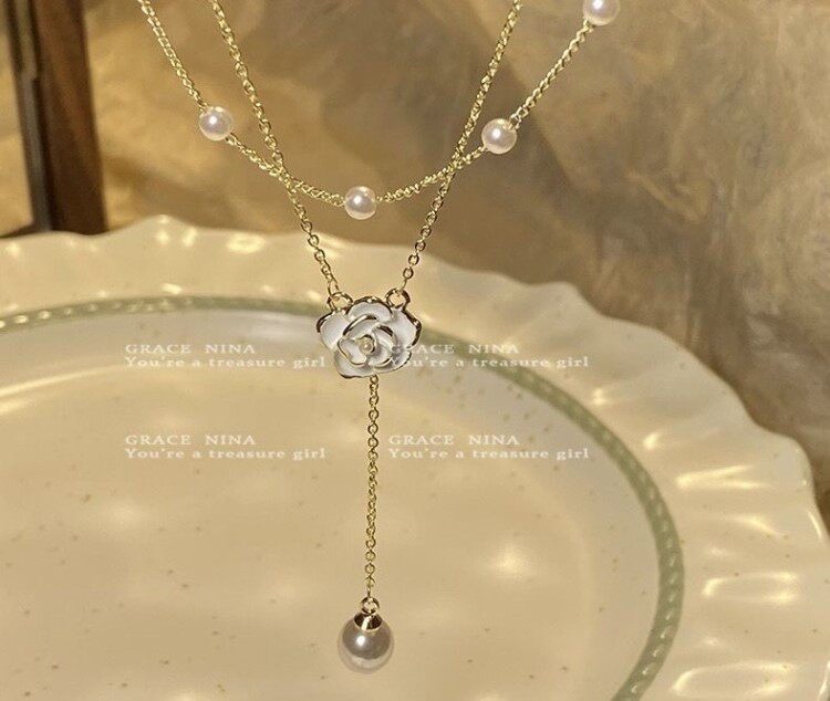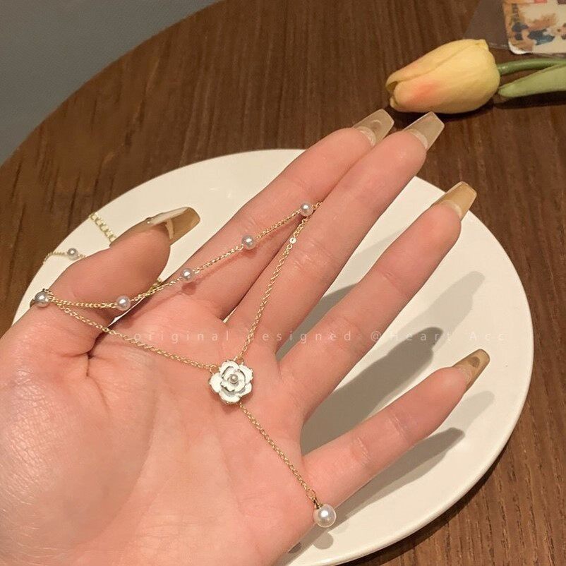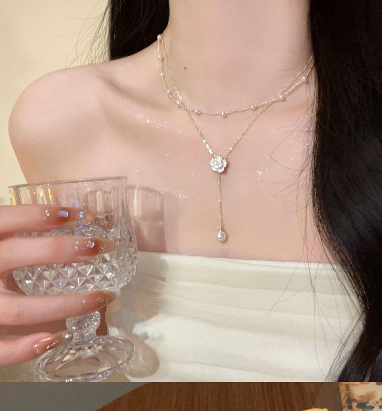 山茶花项链女秋冬配饰双层叠戴小香风小众锁骨链毛衣链轻奢高级感