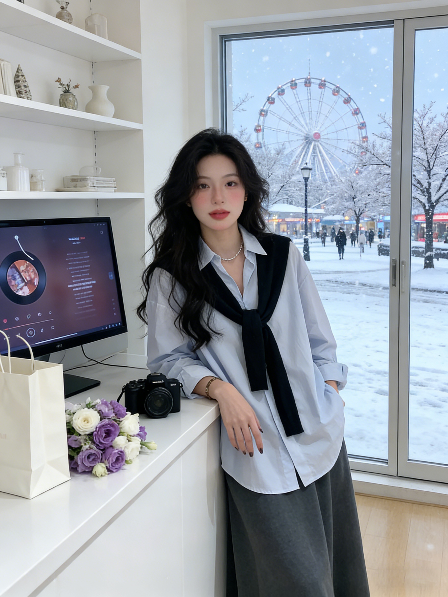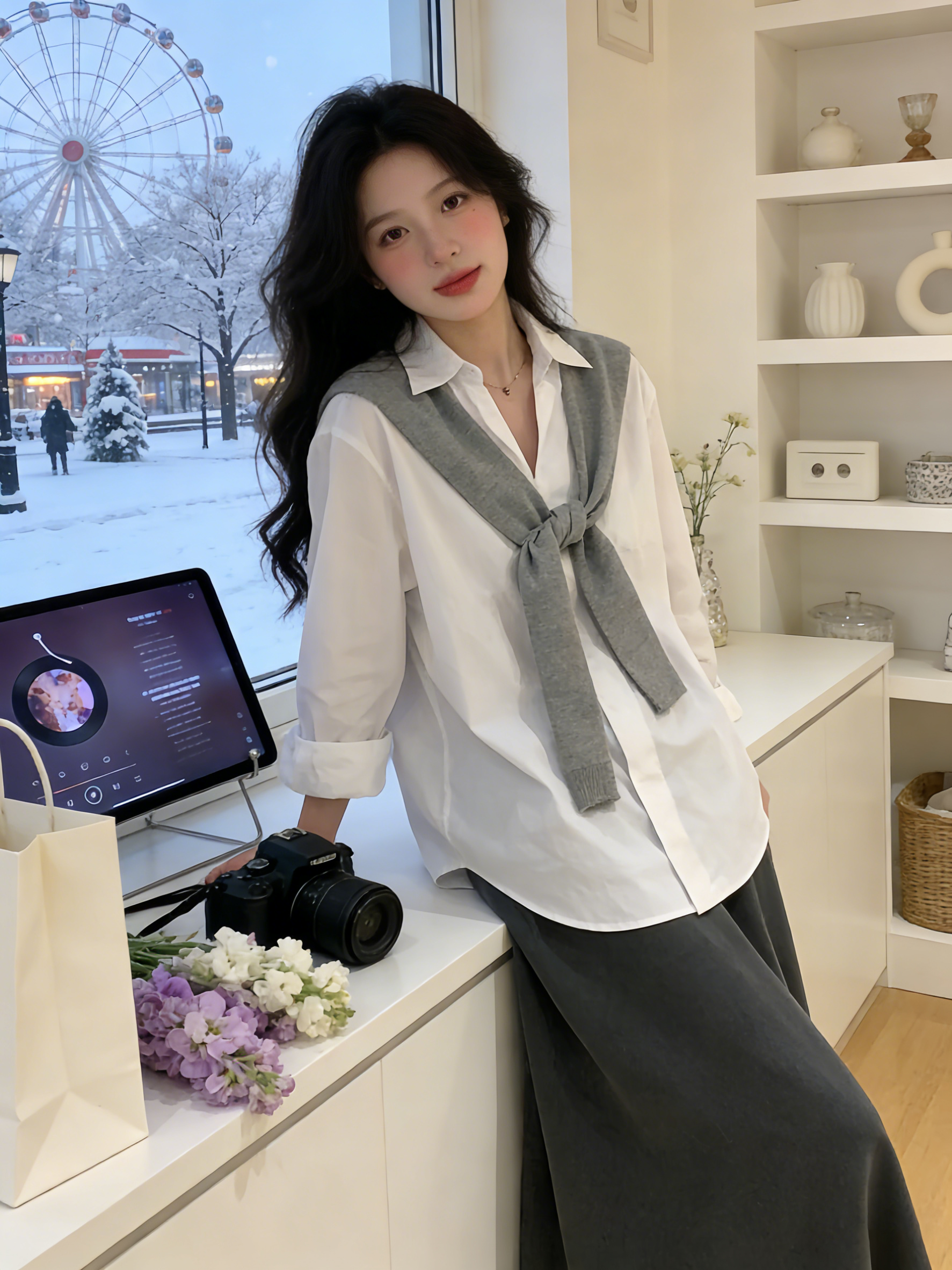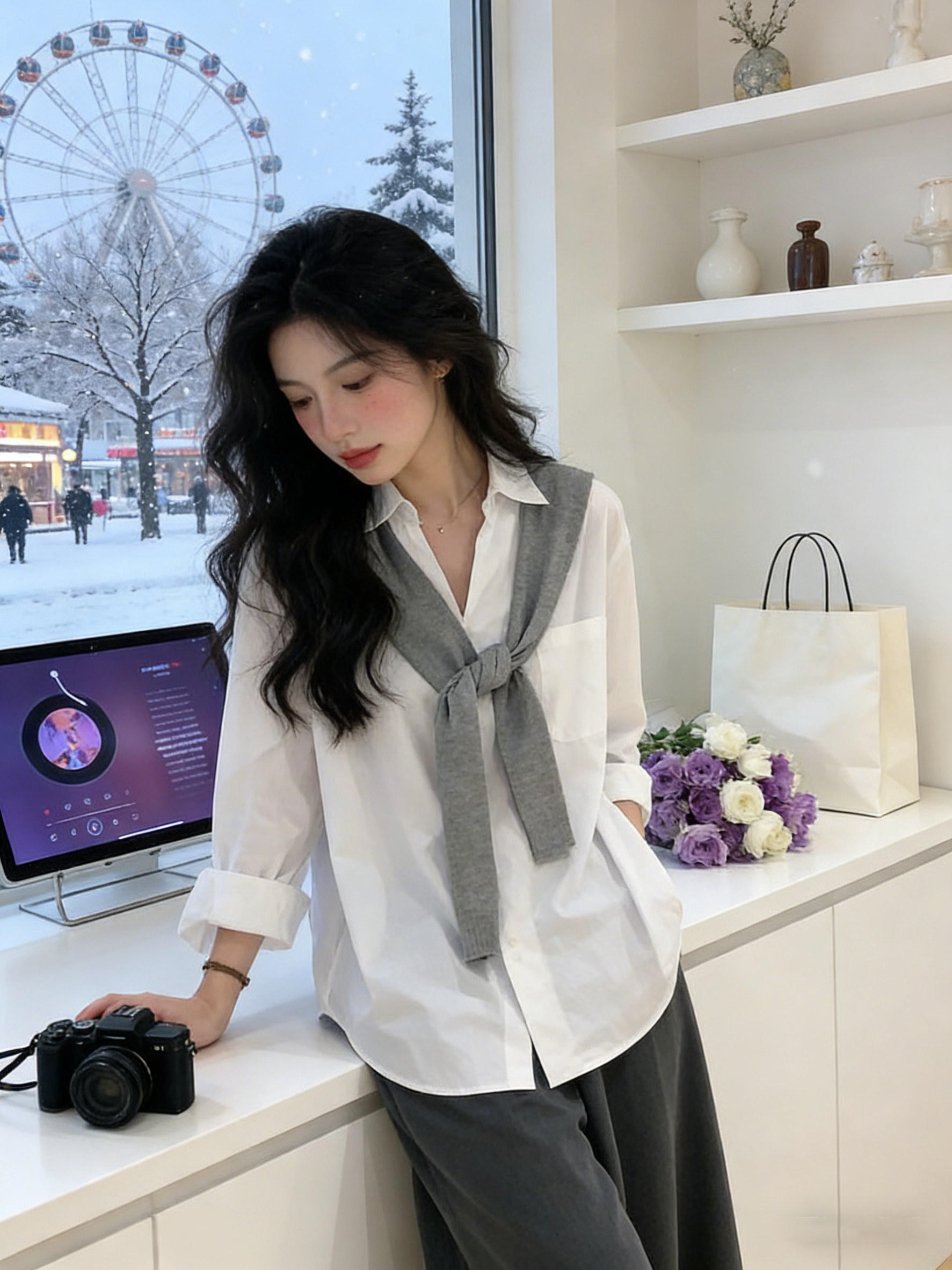 韩系披肩蓝色长袖衬衫女装早春2026新款气质通勤宽松显瘦百搭上衣
