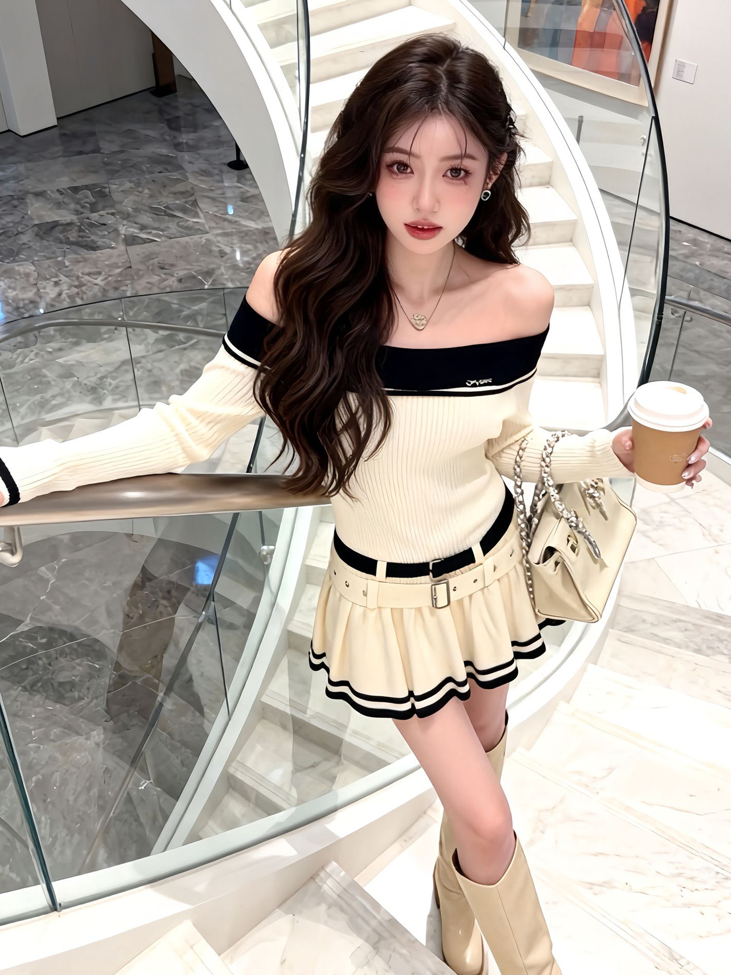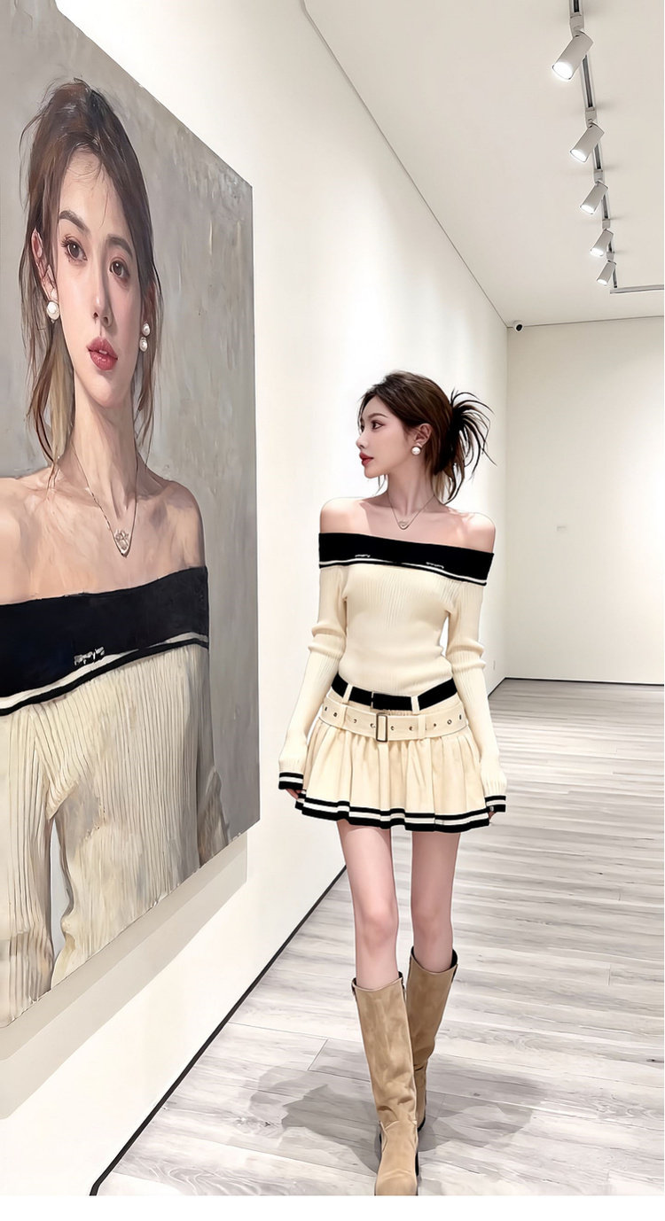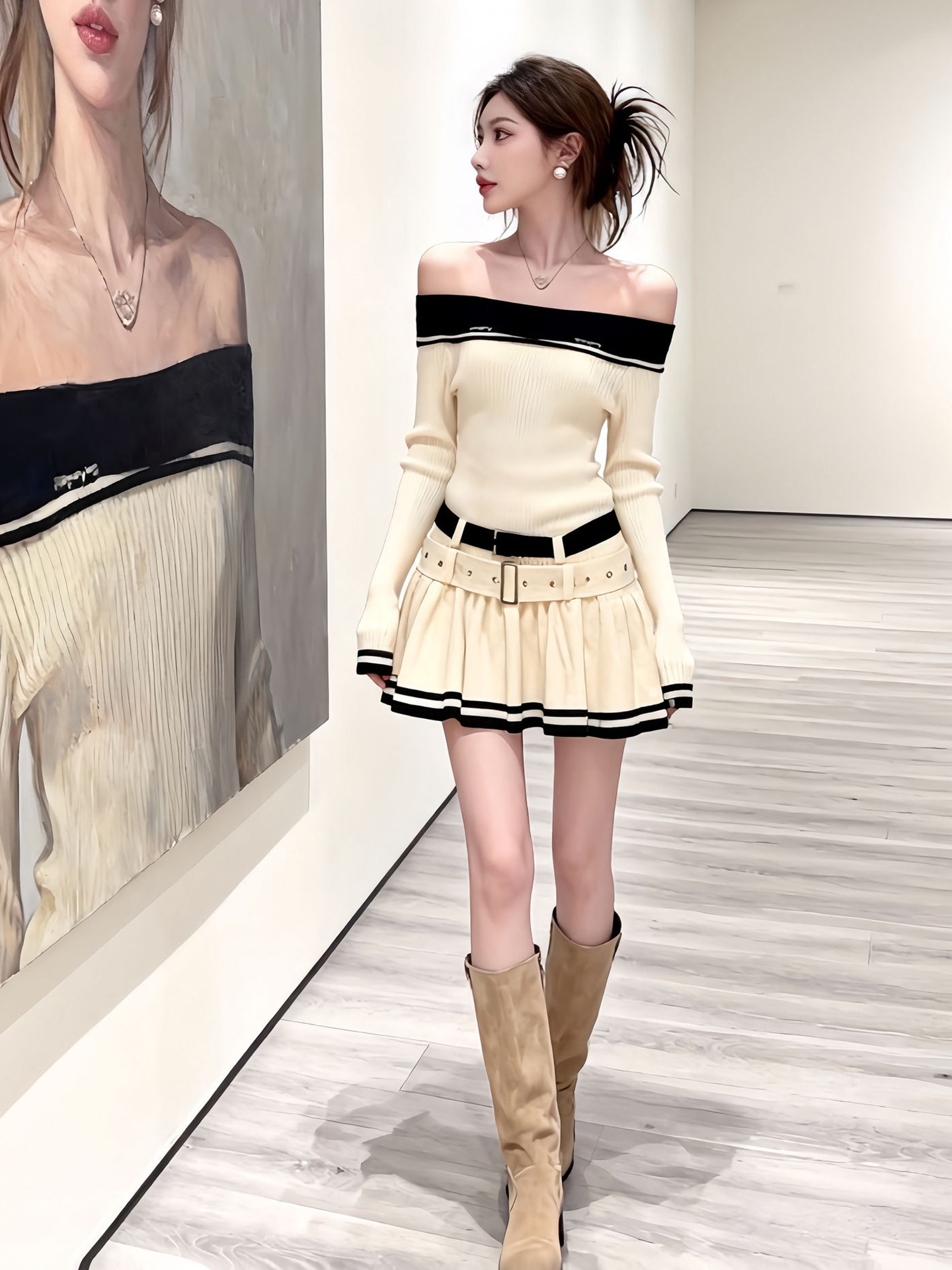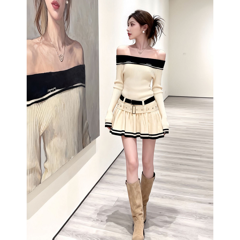 早春季一字肩针织连衣裙子女2026新款秋冬穿搭特别漂亮掐腰小裙子
