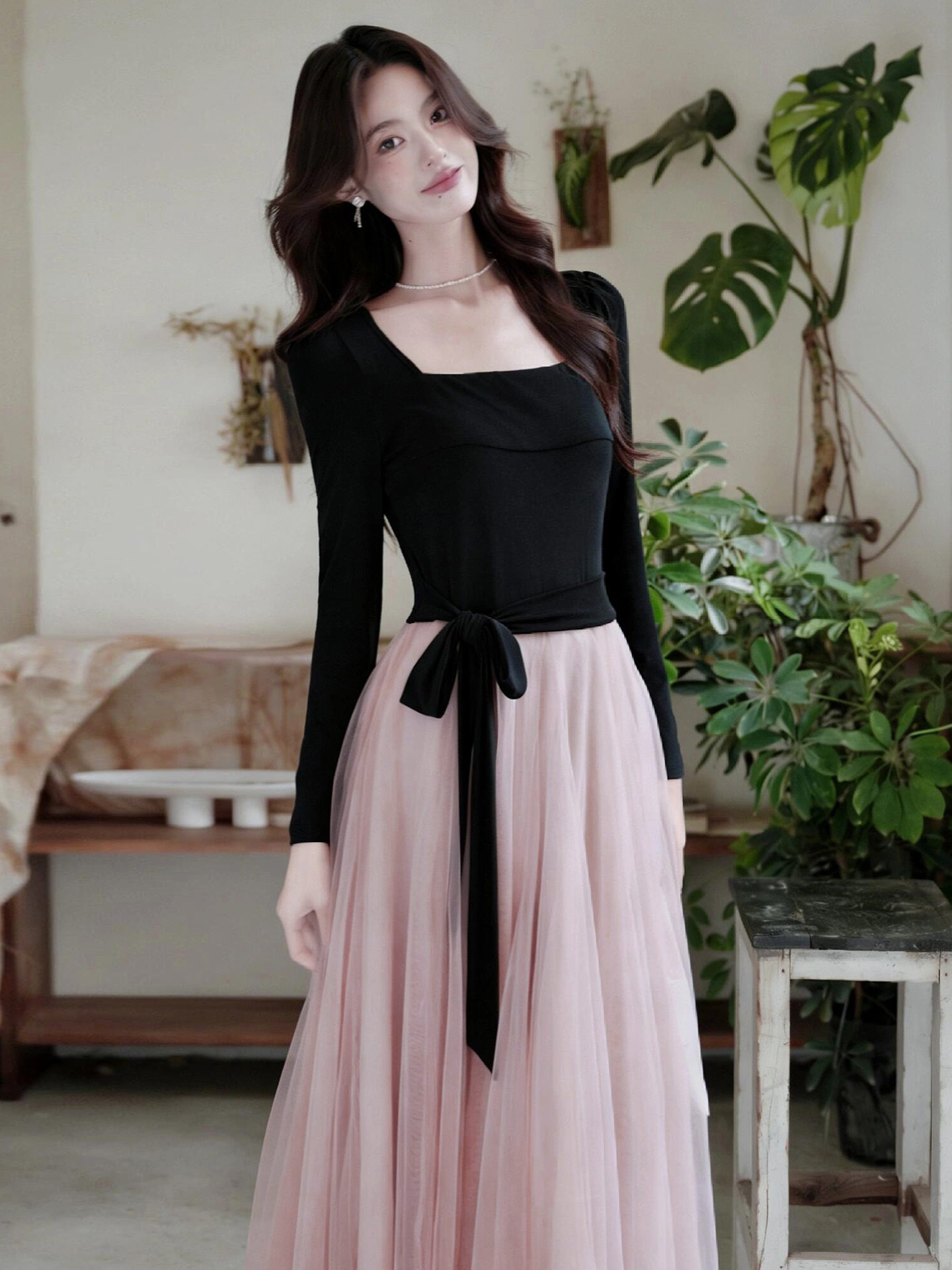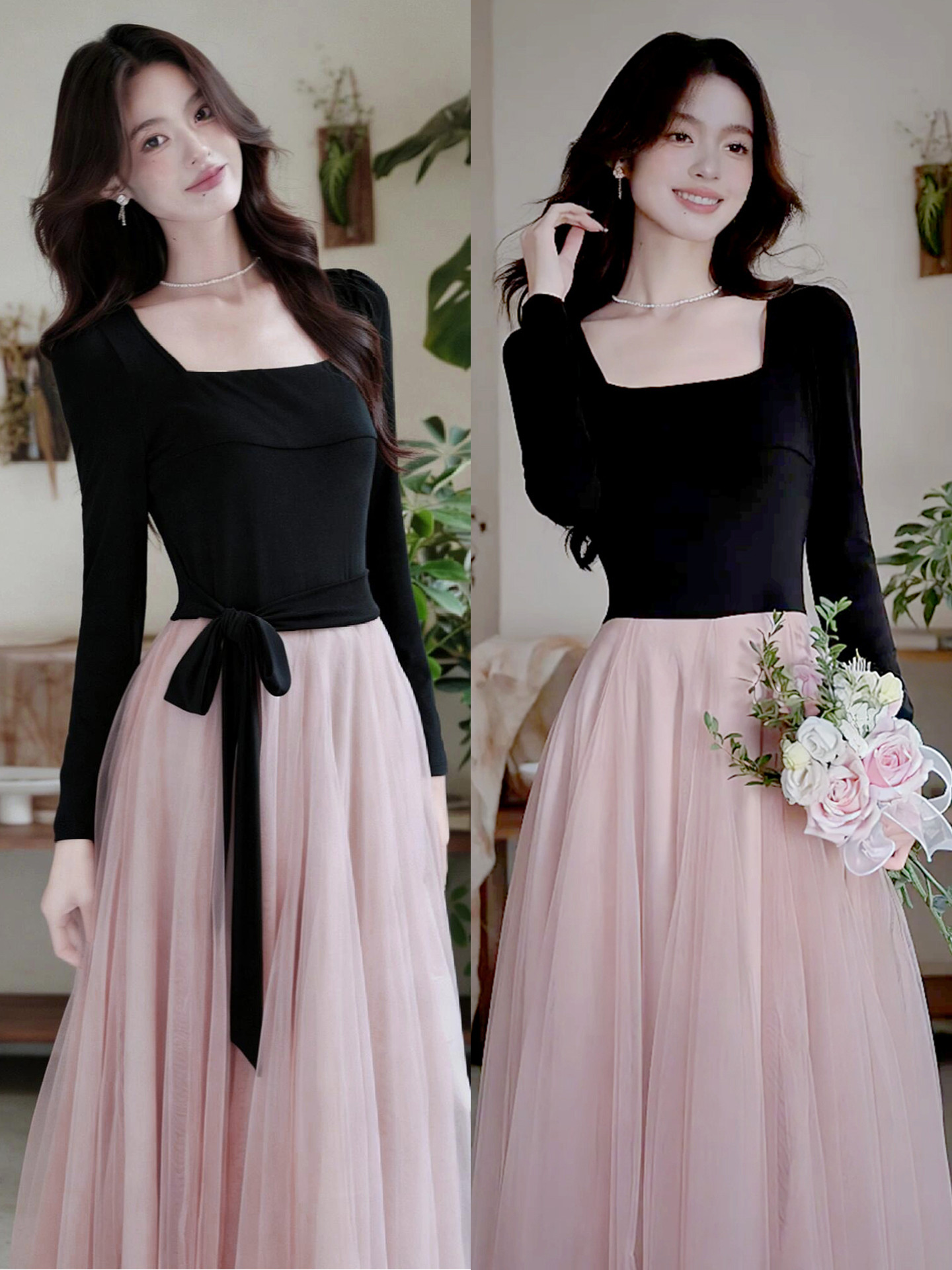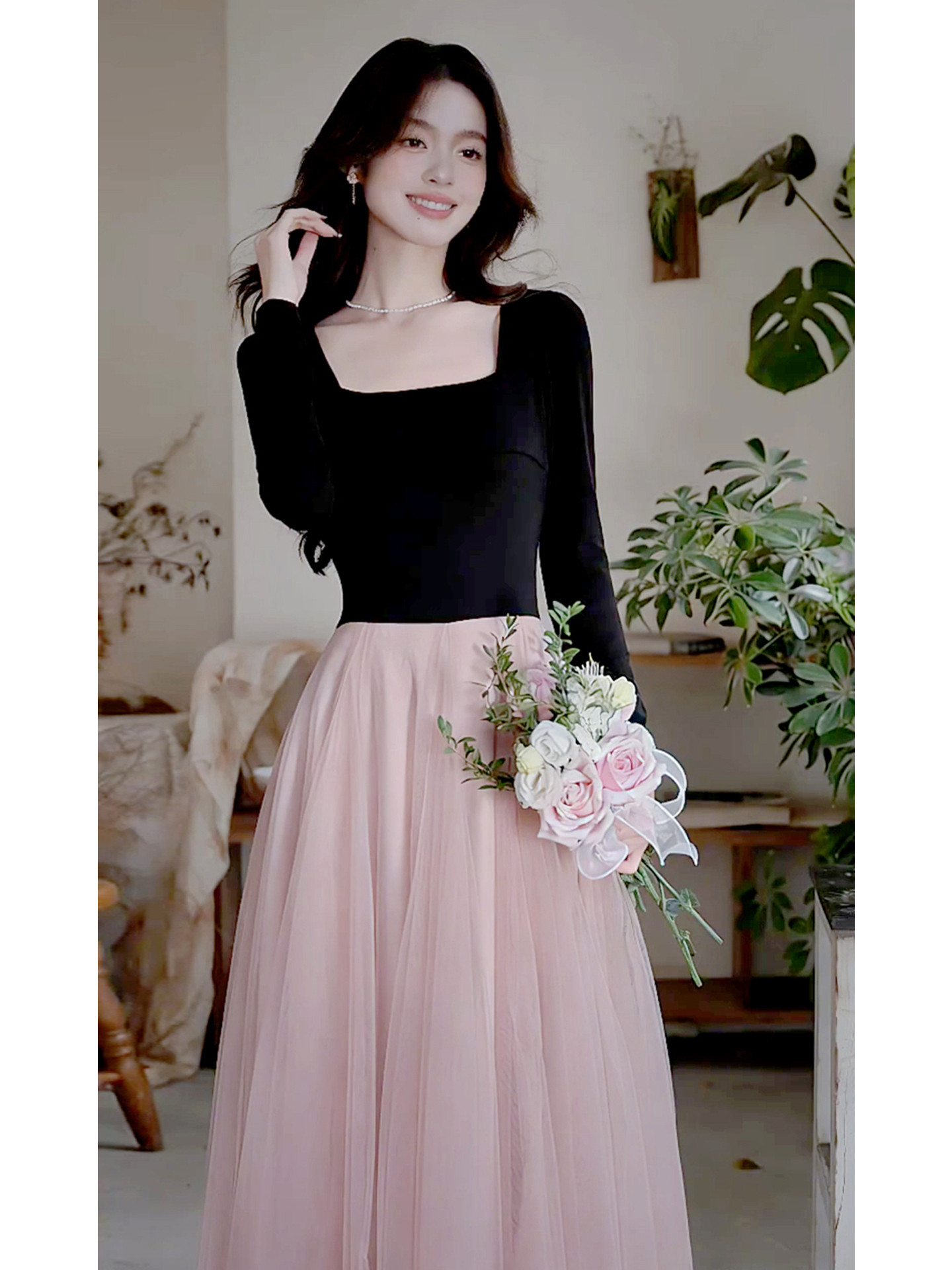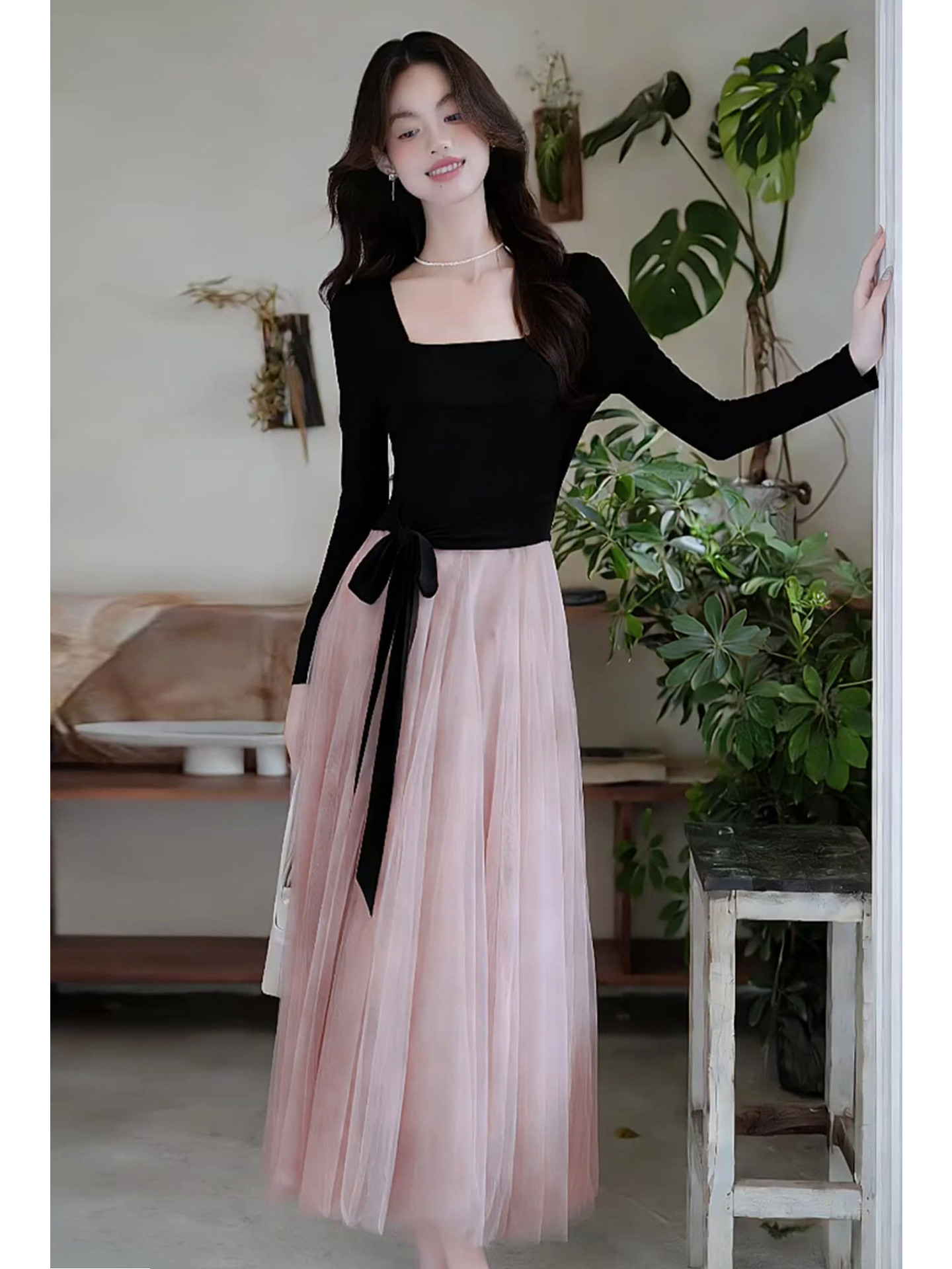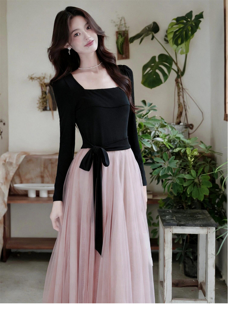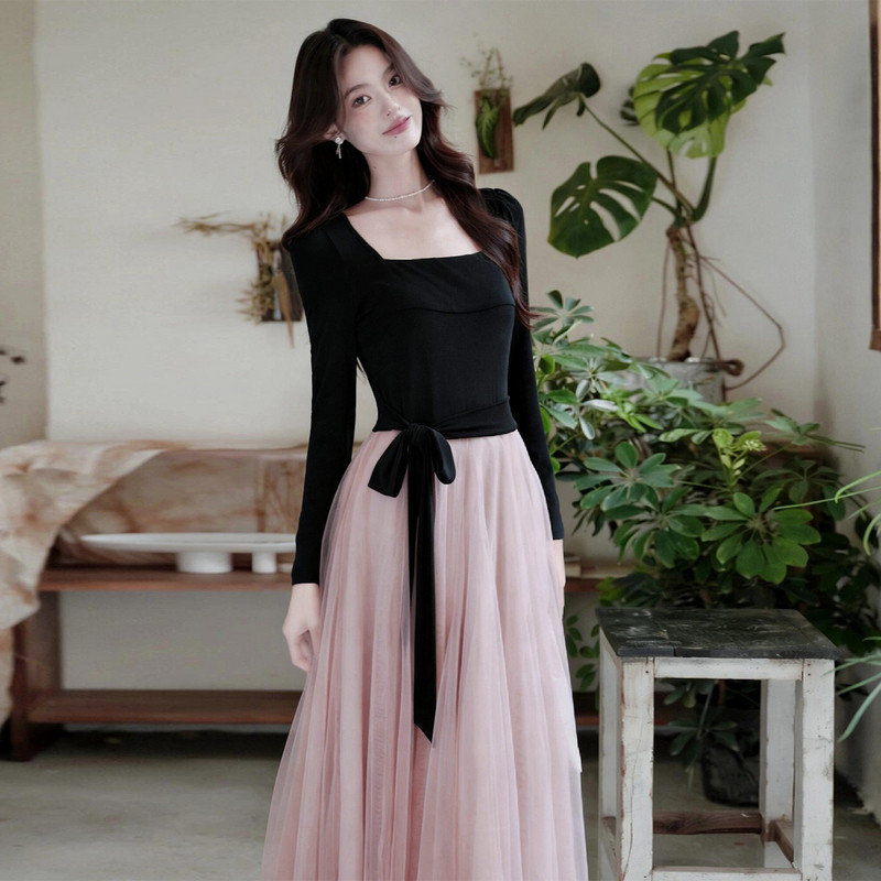 早春季巨好看法式黑色方领连衣裙子女秋冬2026新款千金风穿搭长裙