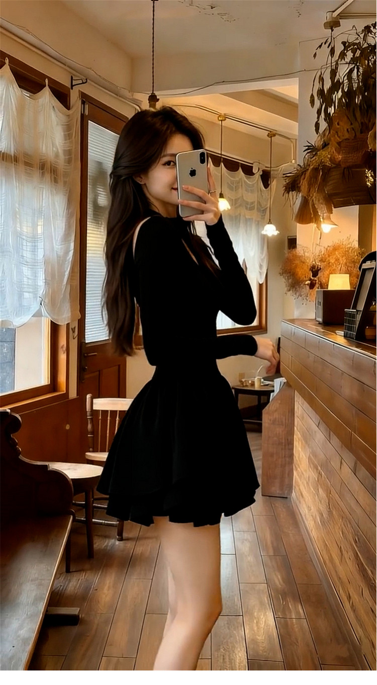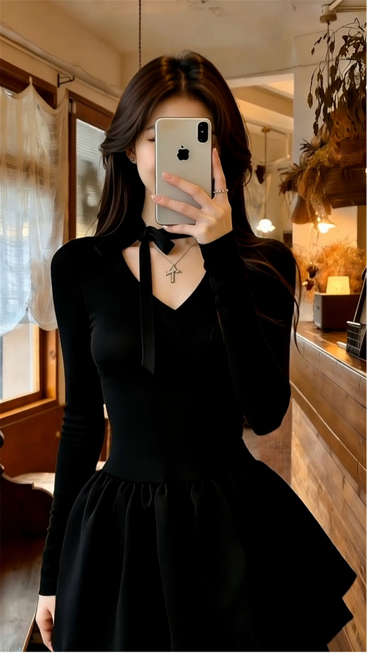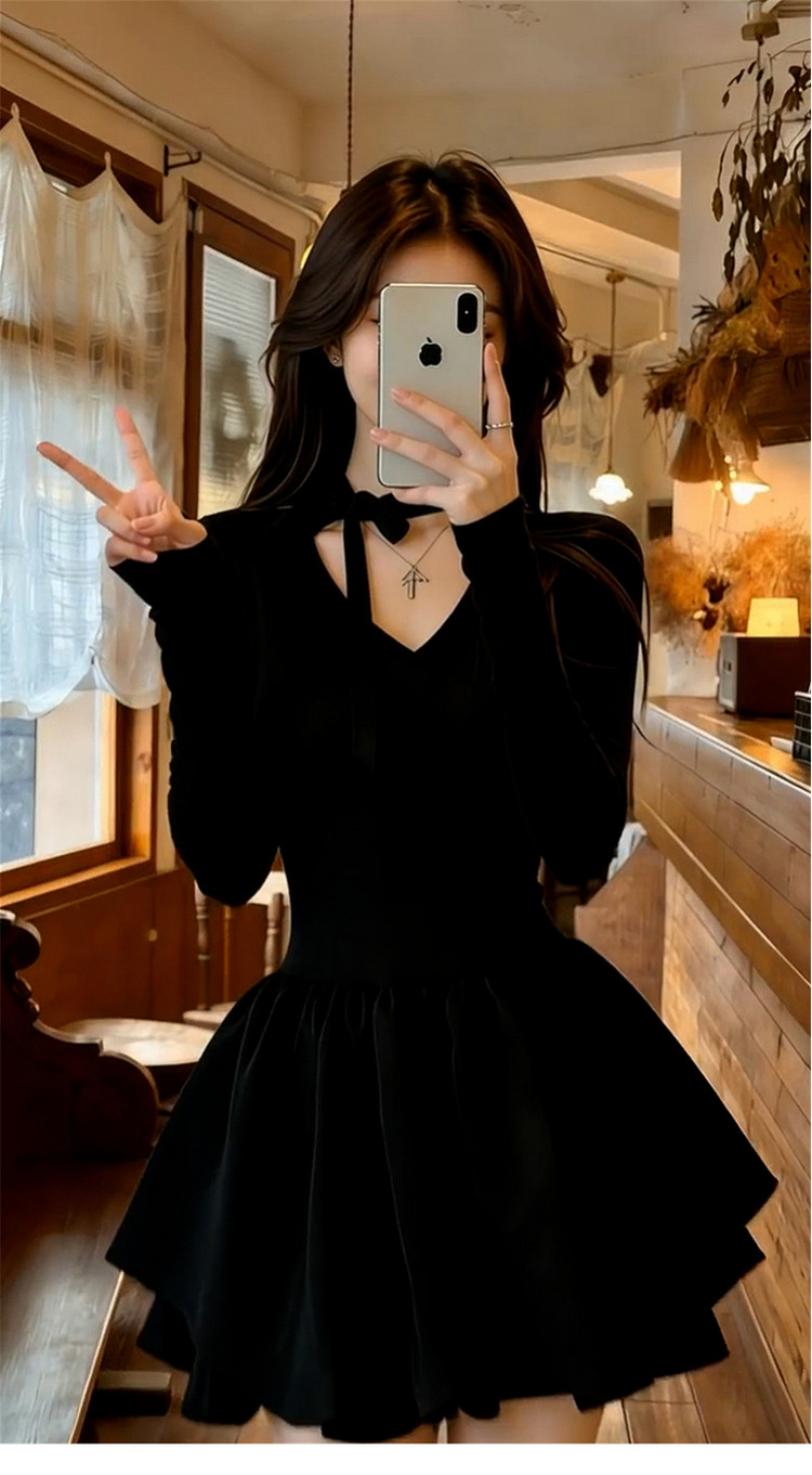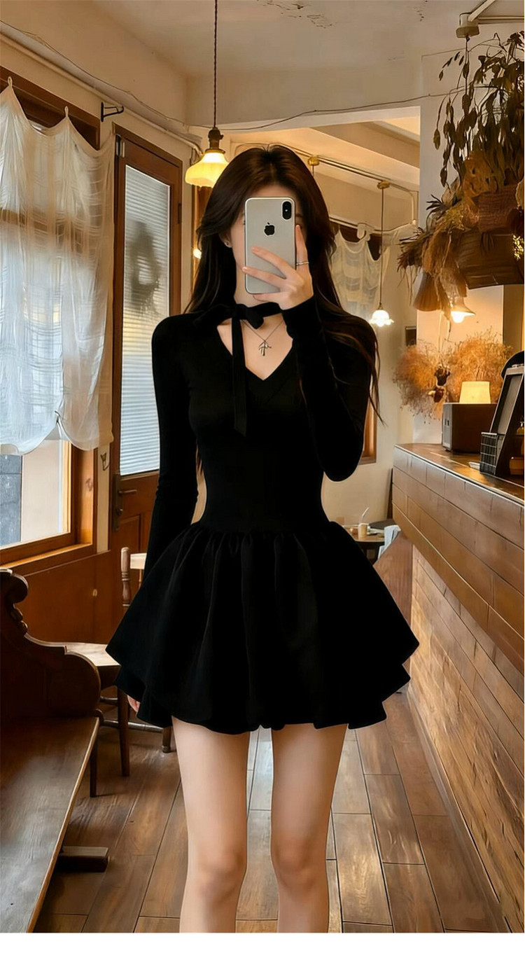 法式赫本风v领黑色连衣裙子女2026新款春秋季收腰显瘦a字蓬蓬短裙