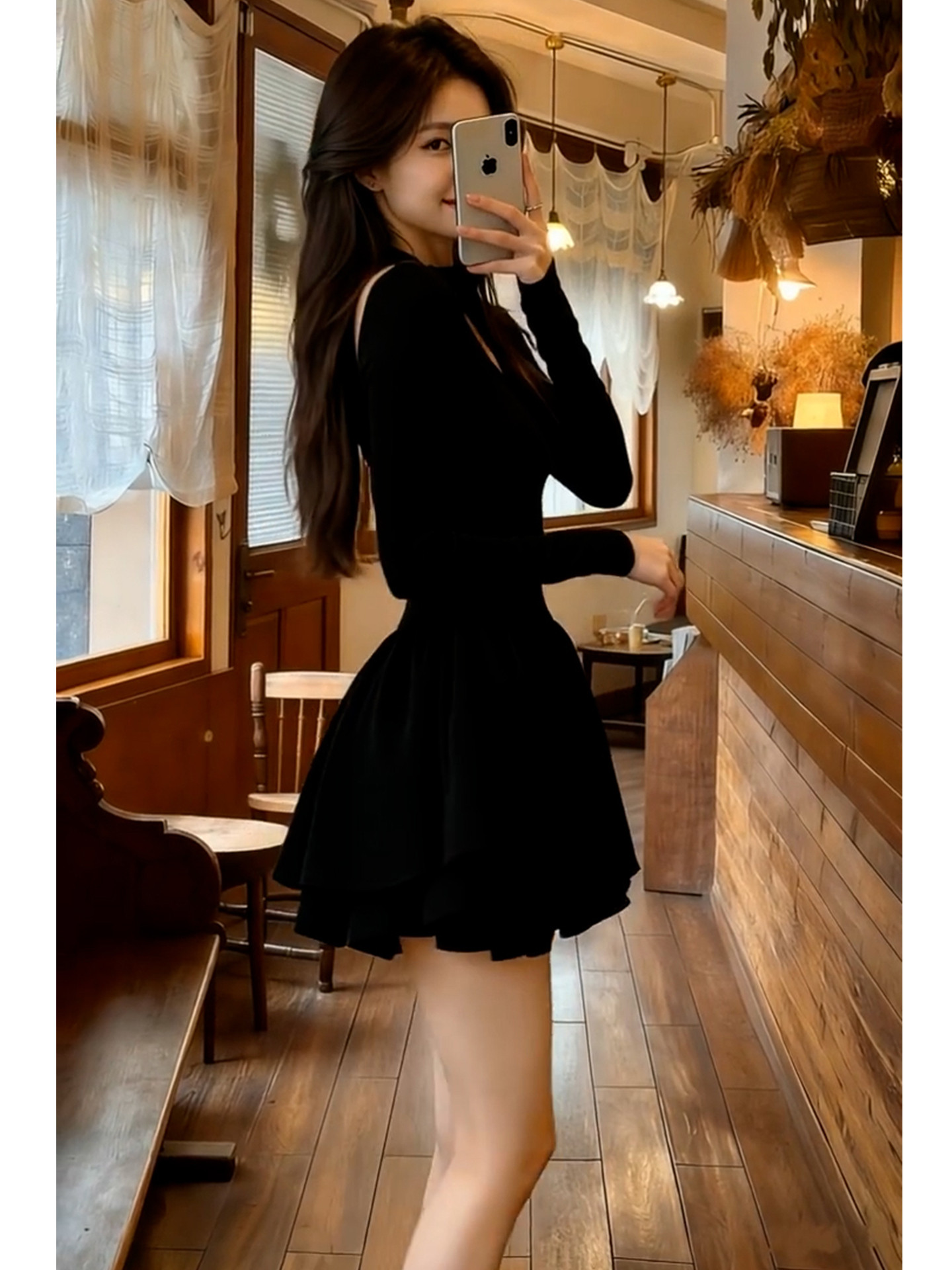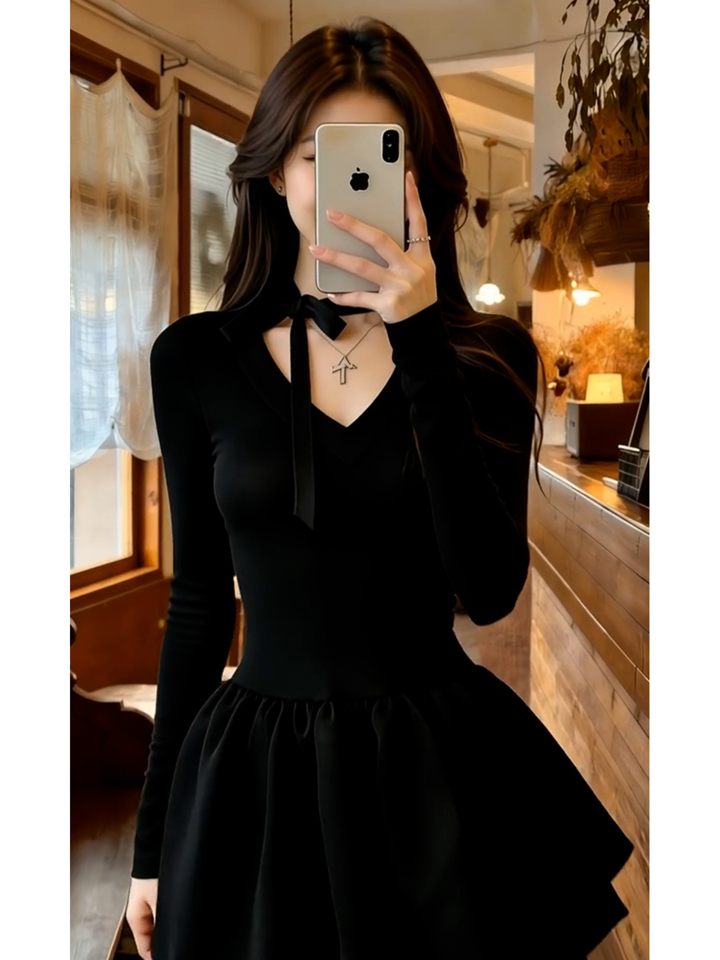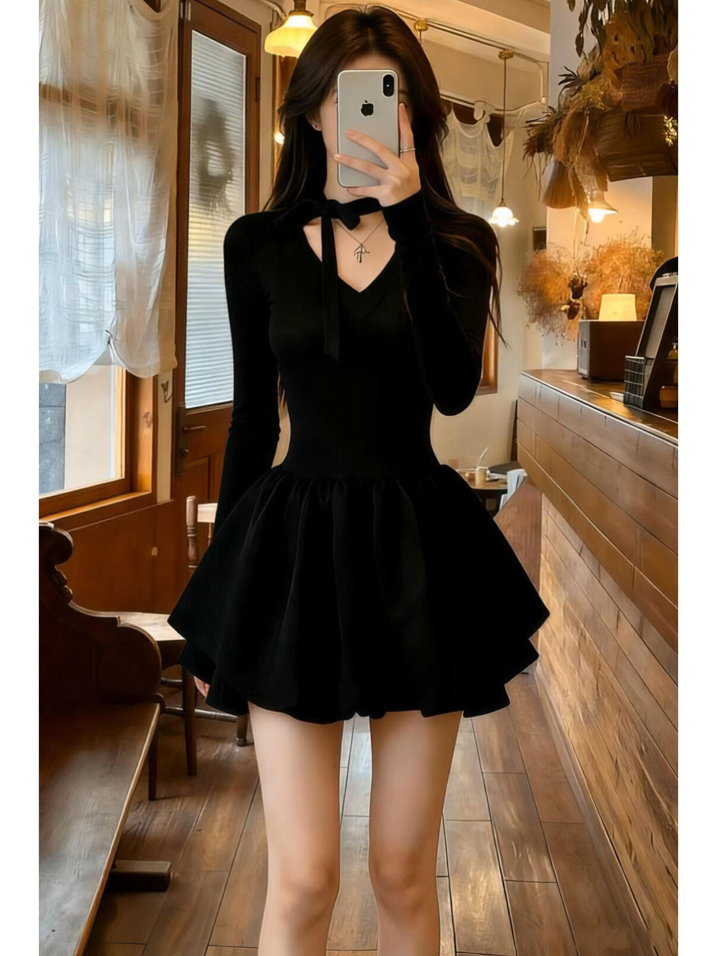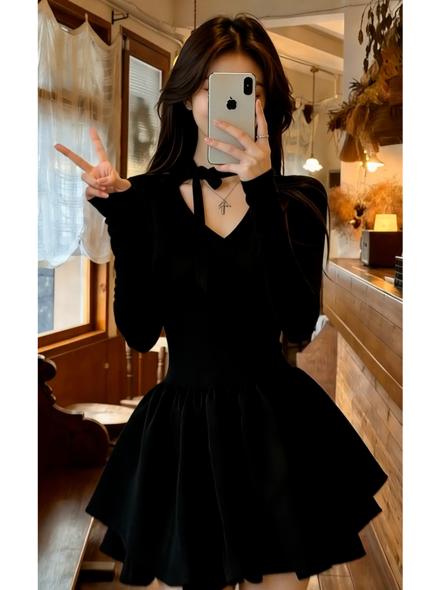 法式赫本风v领黑色连衣裙子女2026新款春秋季收腰显瘦a字蓬蓬短裙