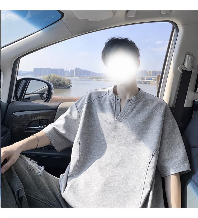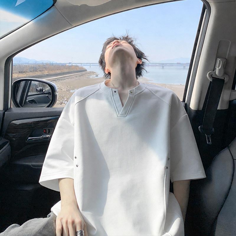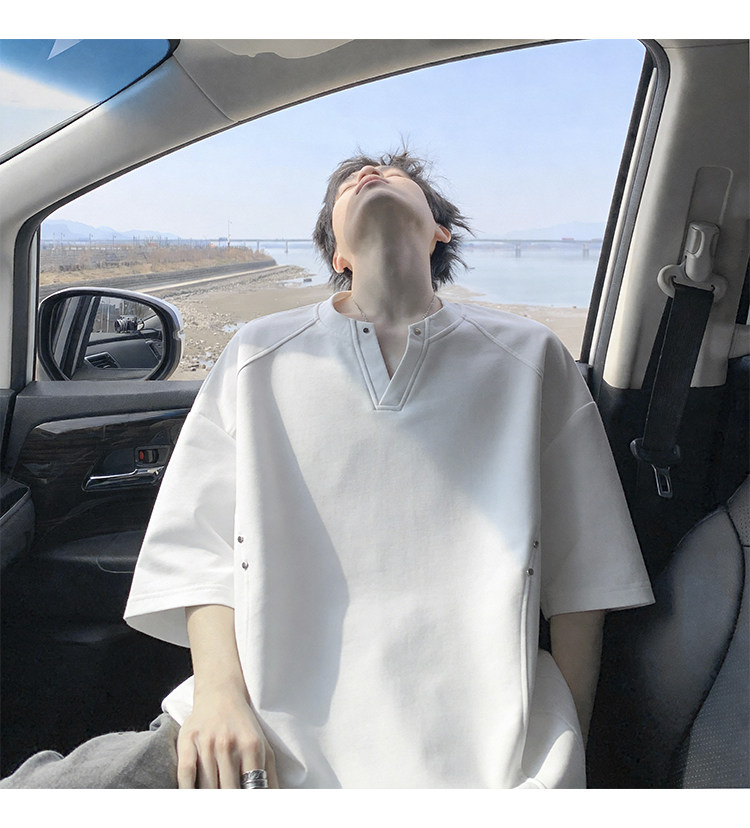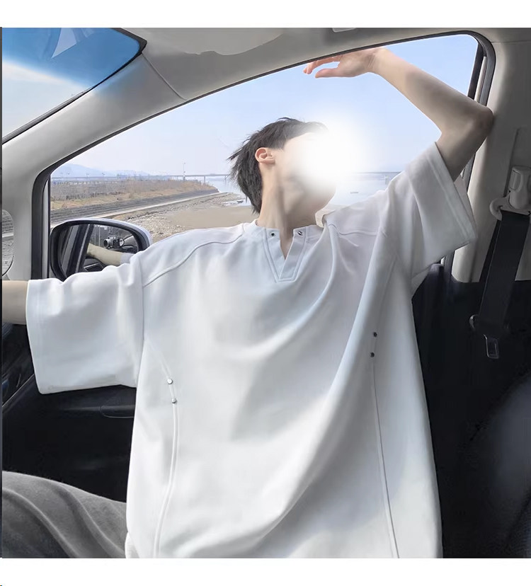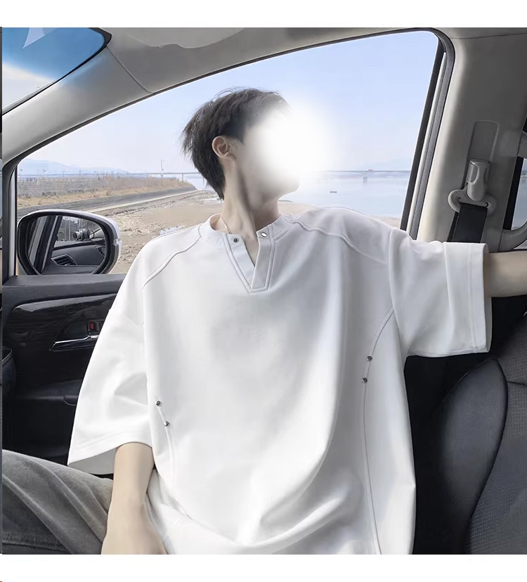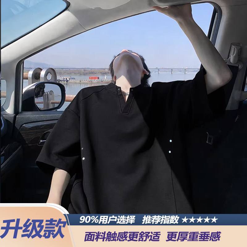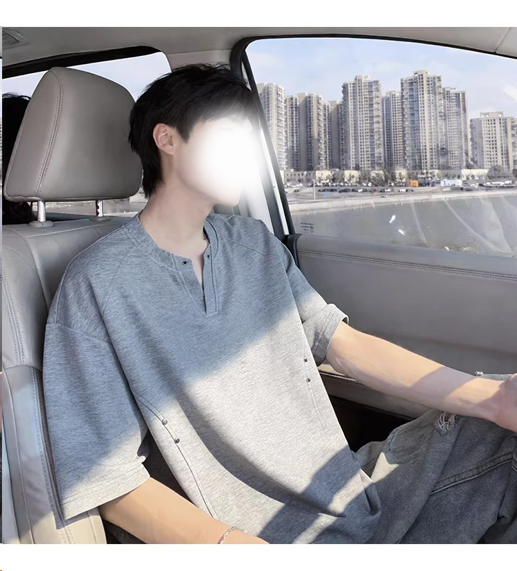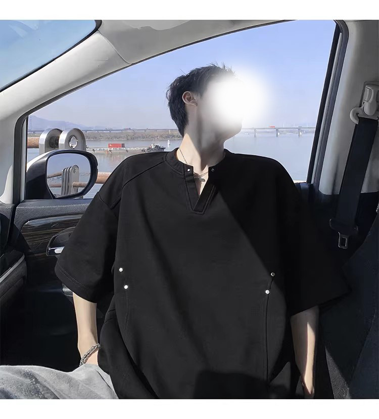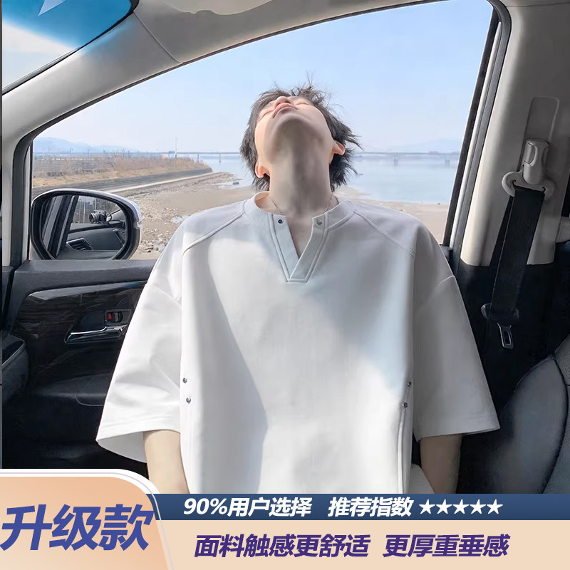 柳钉拼接曼巴棉短袖T恤男夏季美式V领休闲半袖潮流痞帅宽松五分袖