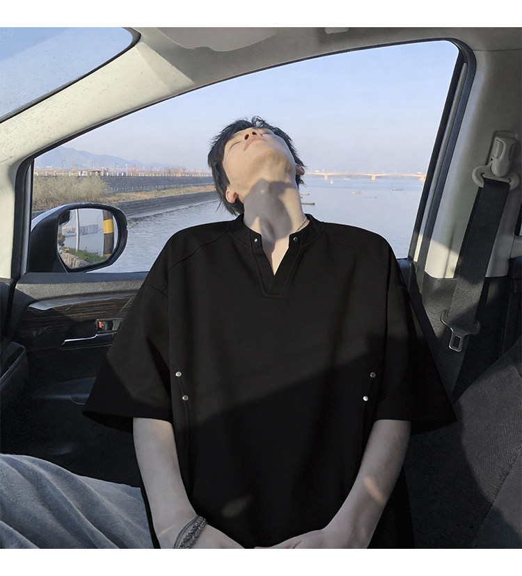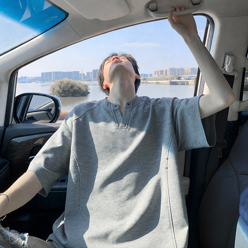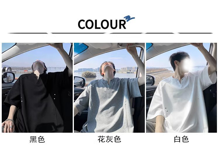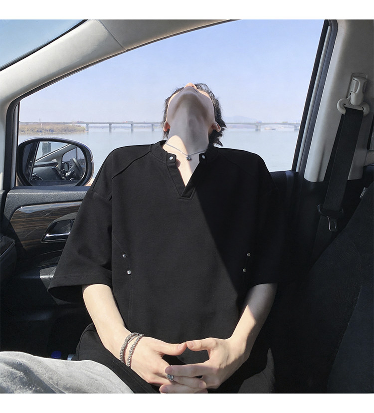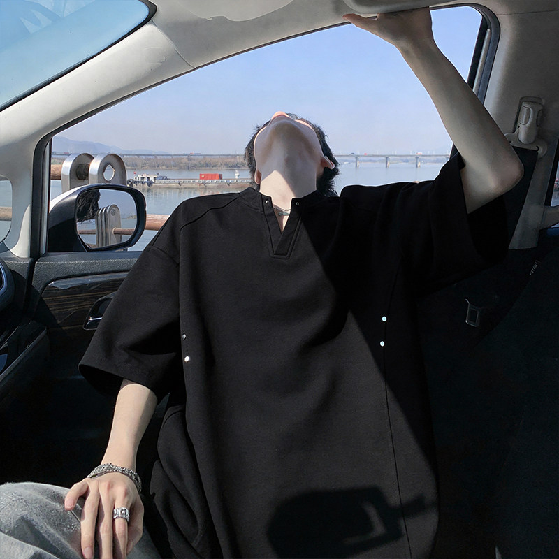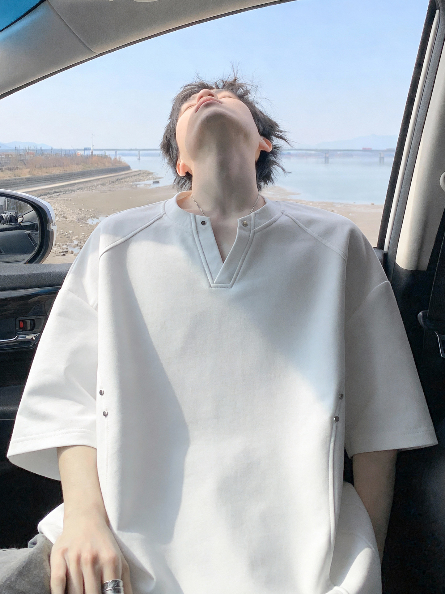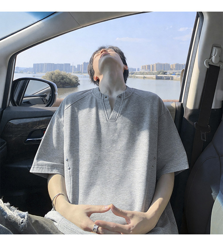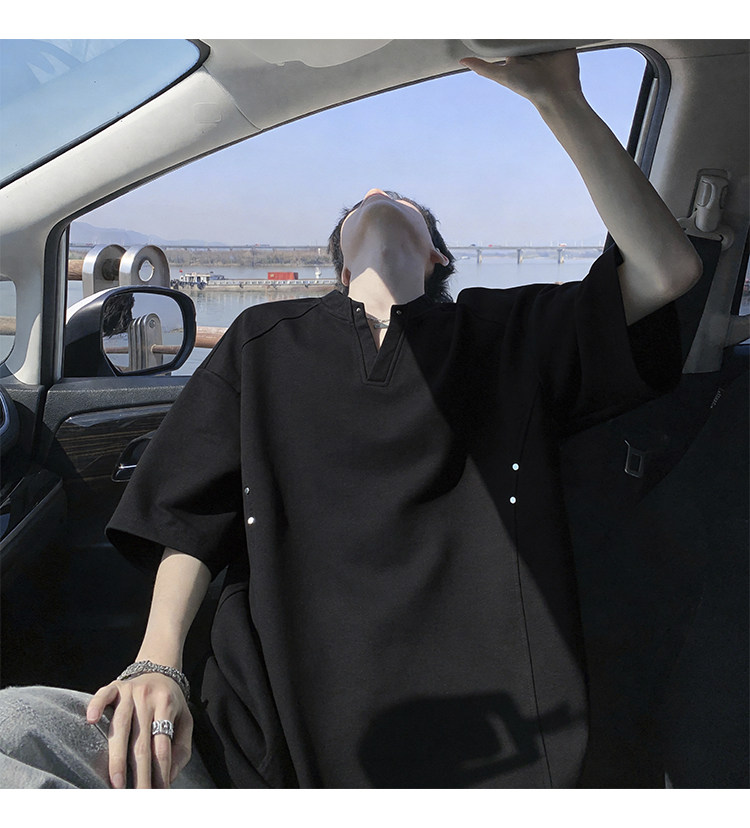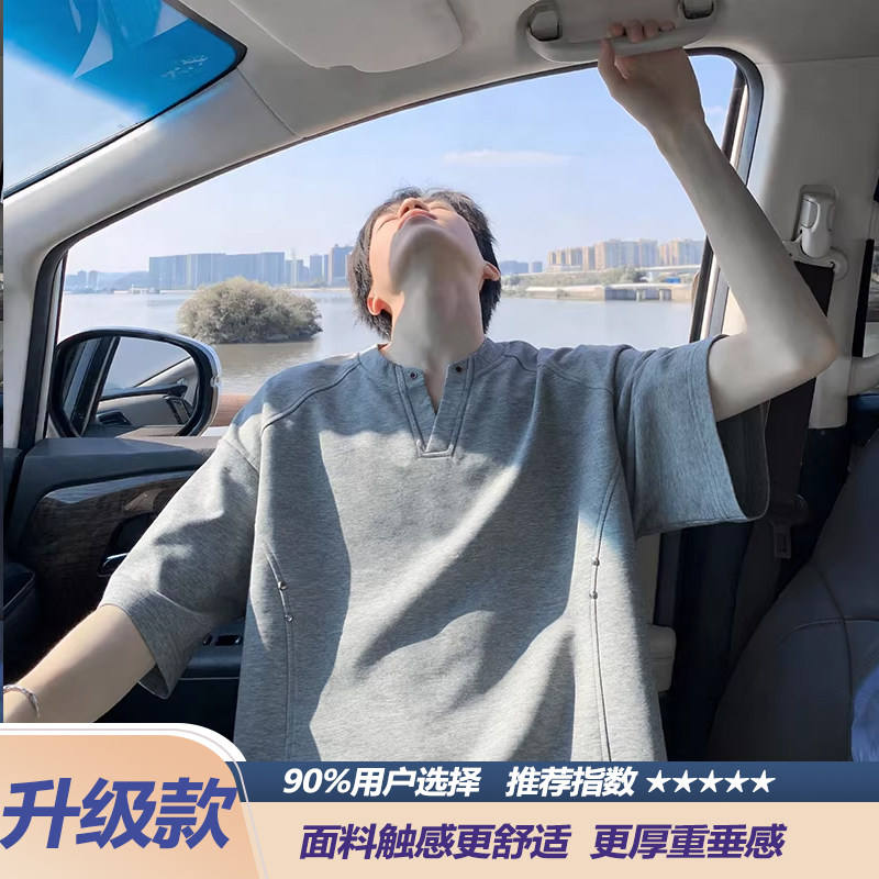 柳钉拼接曼巴棉短袖T恤男夏季美式V领休闲半袖潮流痞帅宽松五分袖