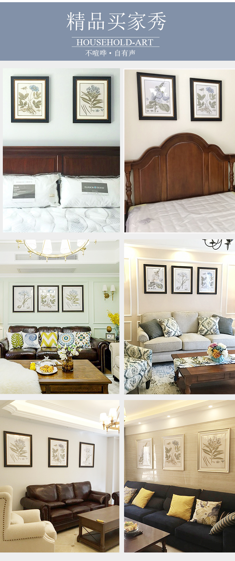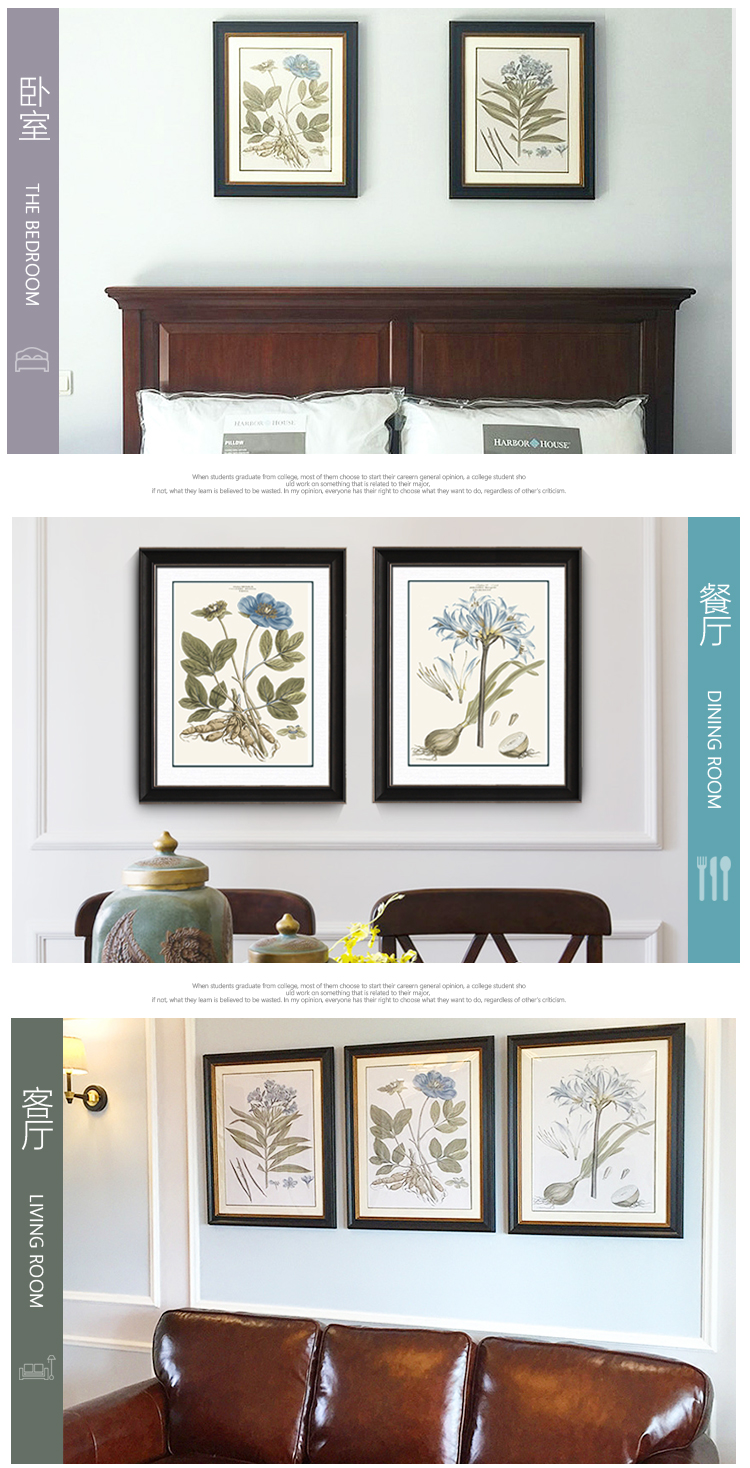 hh简美餐厅壁画卧室床头墙画玄关挂画客厅素雅花卉三联美式装饰画