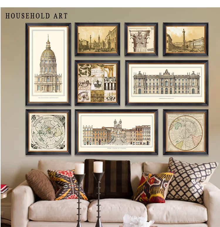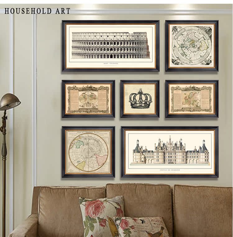 hh简美照片墙客厅沙发背景墙古典壁画走廊多幅复古美式组合装饰画