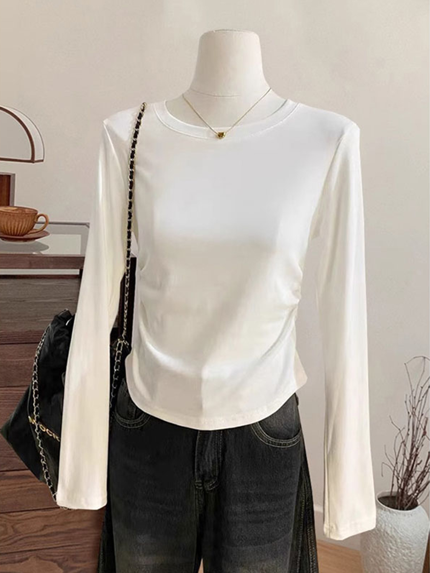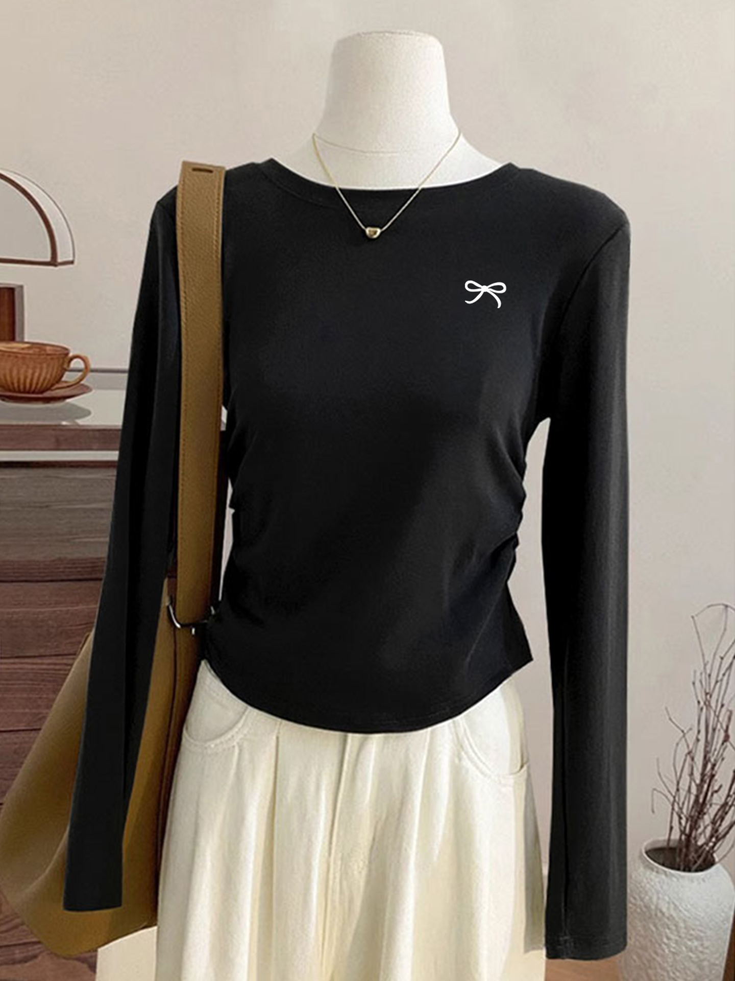 拉夏贝尔正肩打底衫女内搭2025新款秋冬褶皱圆领长袖T恤短款上衣