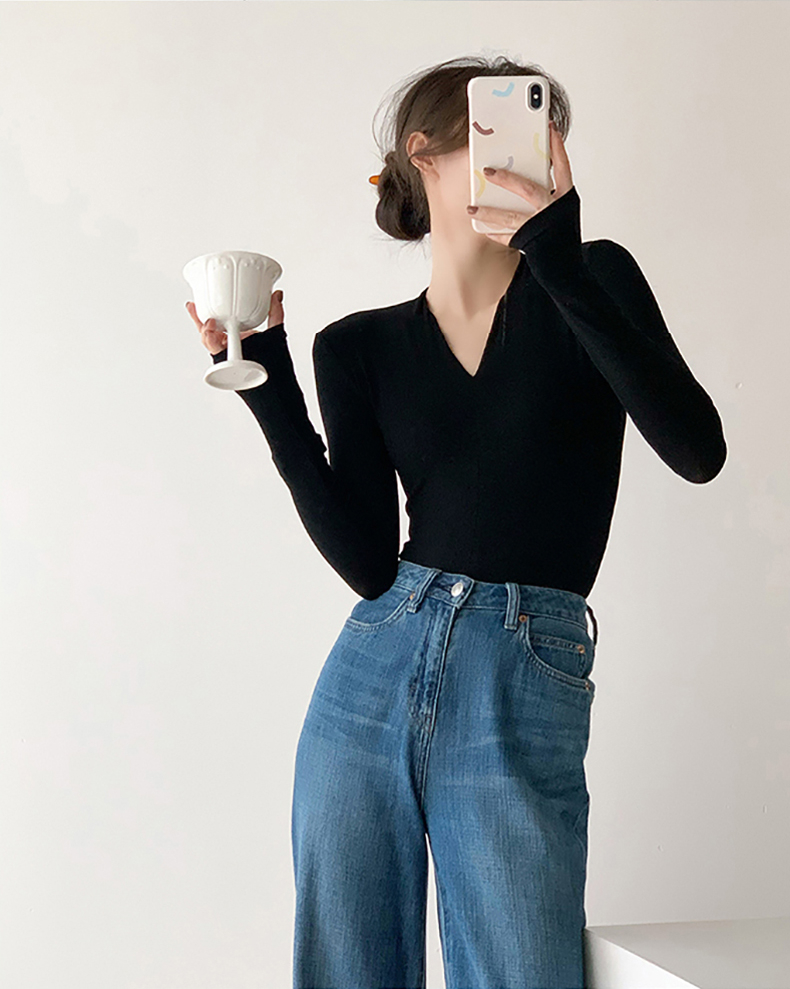 黑色内搭打底衫女2025新款修身v领正肩长袖t恤纯欲风高级感上衣冬