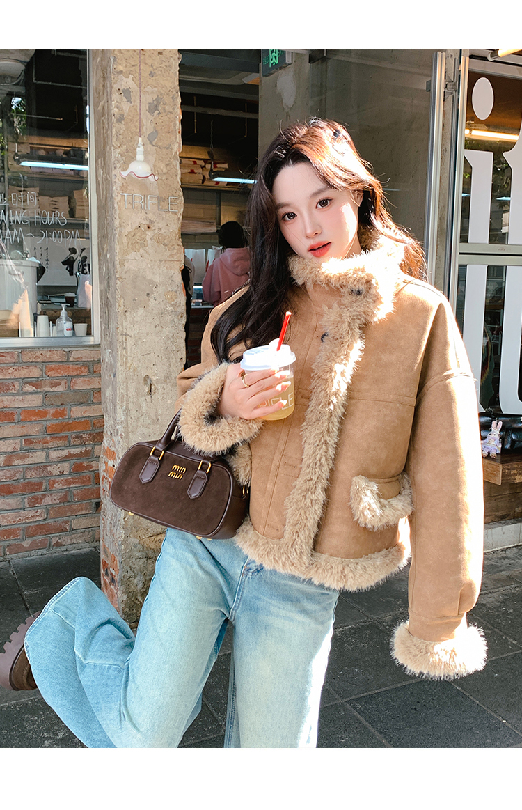 卡其色皮毛一体外套女2025冬季新款高级感超好看加厚加绒机车棉服