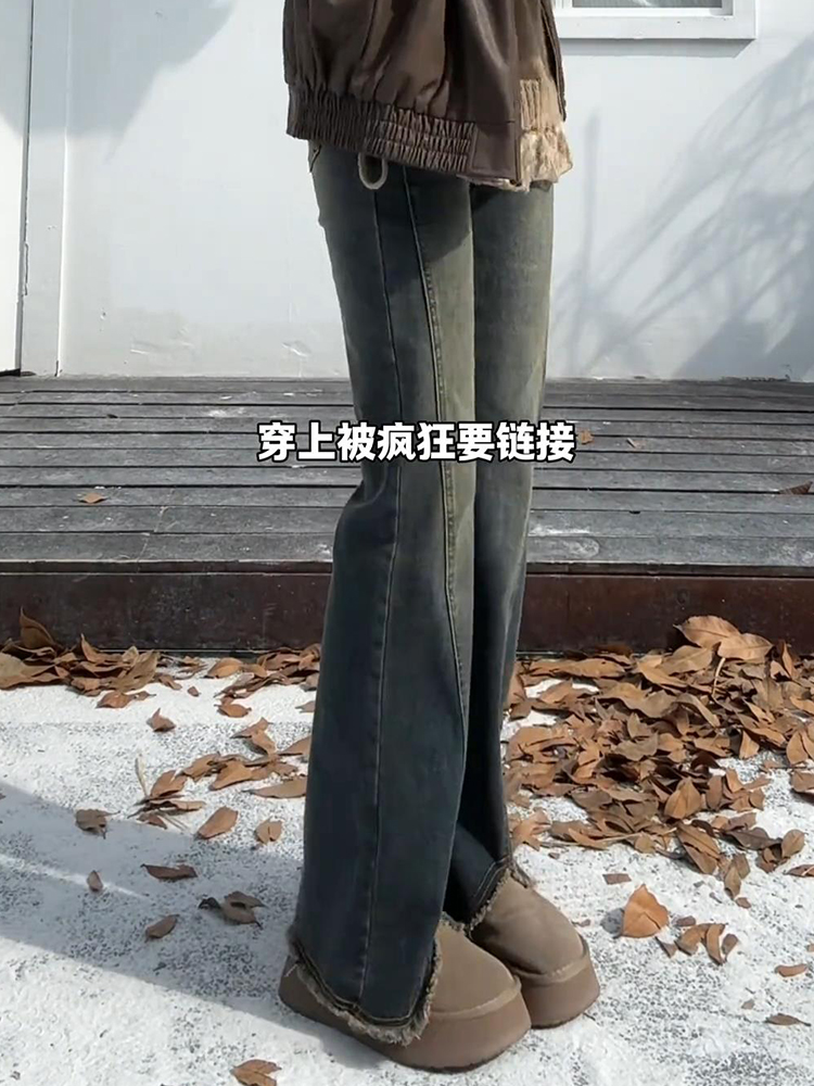 复古蓝毛边微喇牛仔裤女秋冬加绒大码胖mm高腰显瘦遮胯弹力喇叭裤