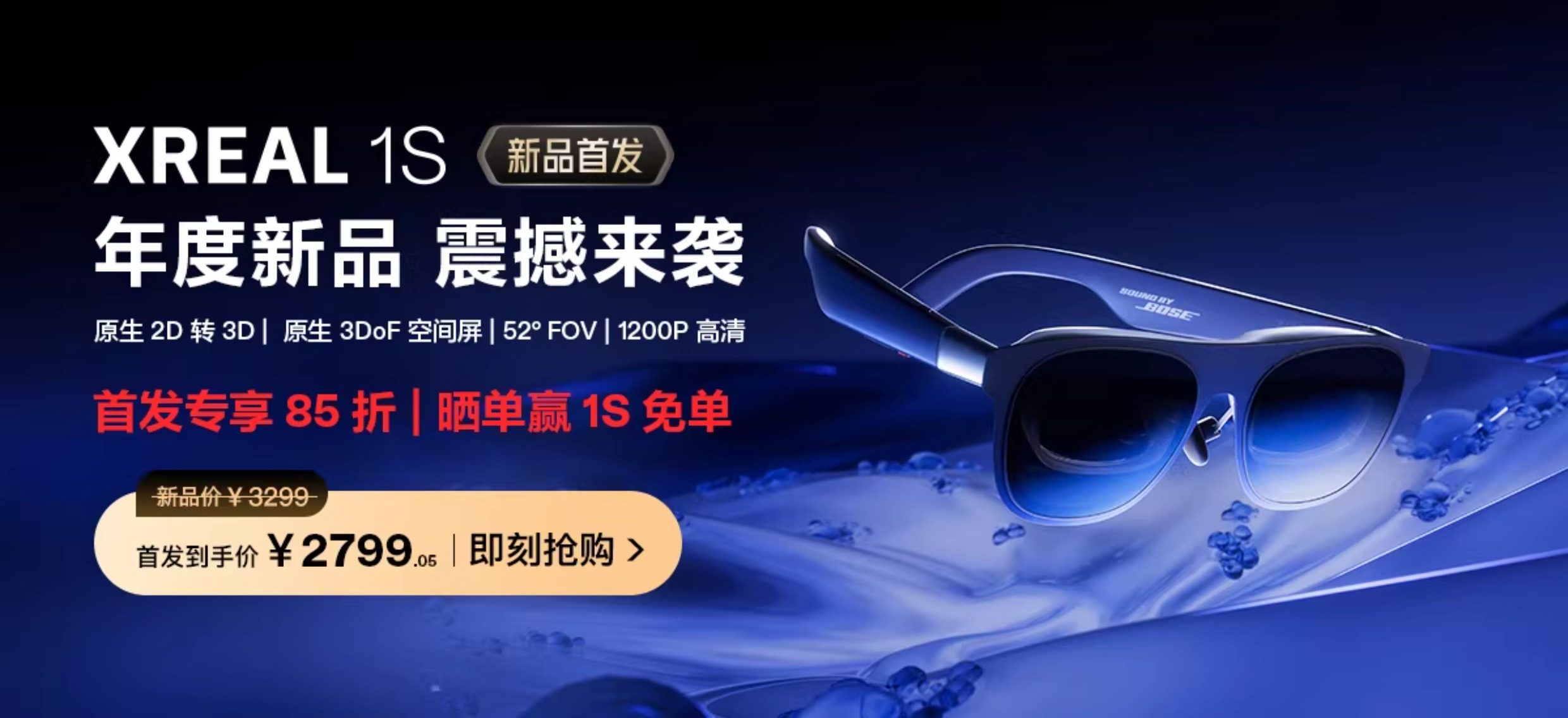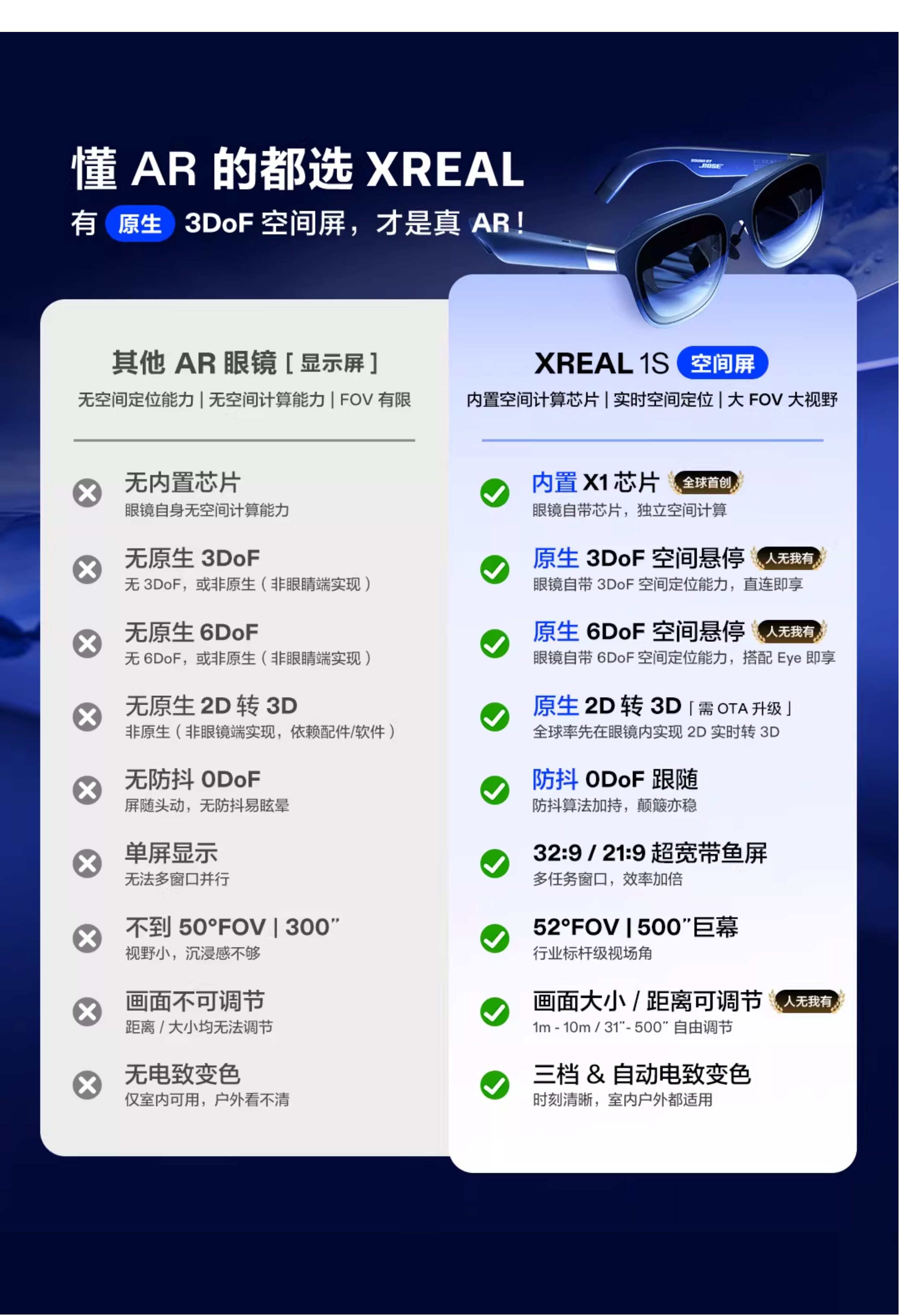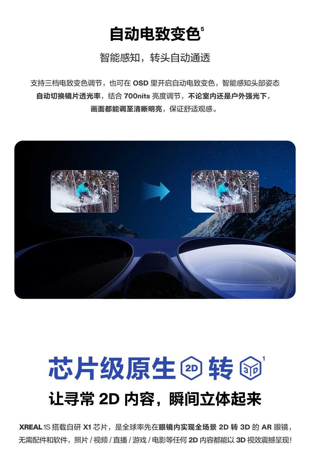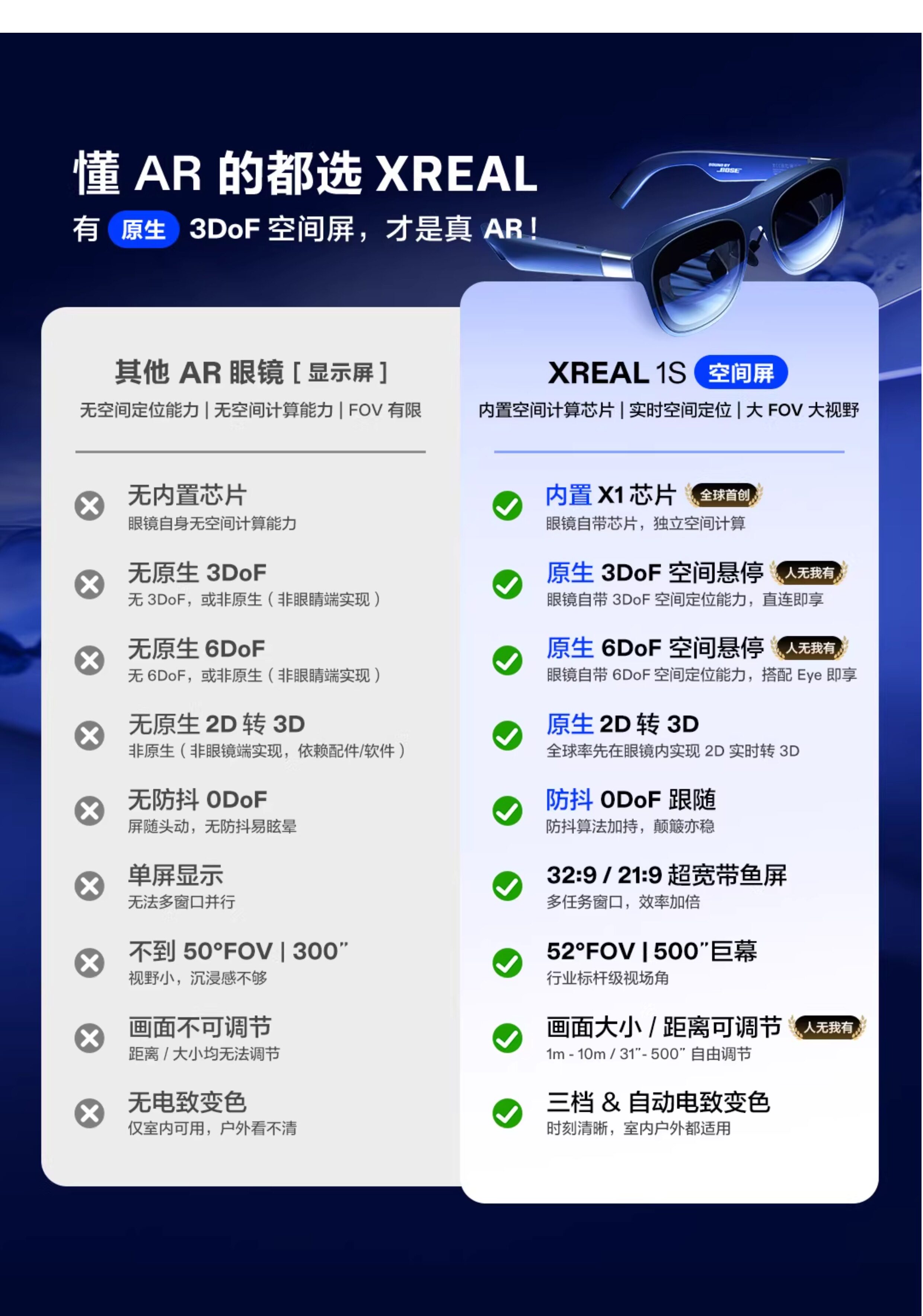 【新品首发】XREAL 1S AR智能眼镜 原生2D转3D 自研X1芯片空中巨幕500英寸 52度FOV 非VRAI眼镜