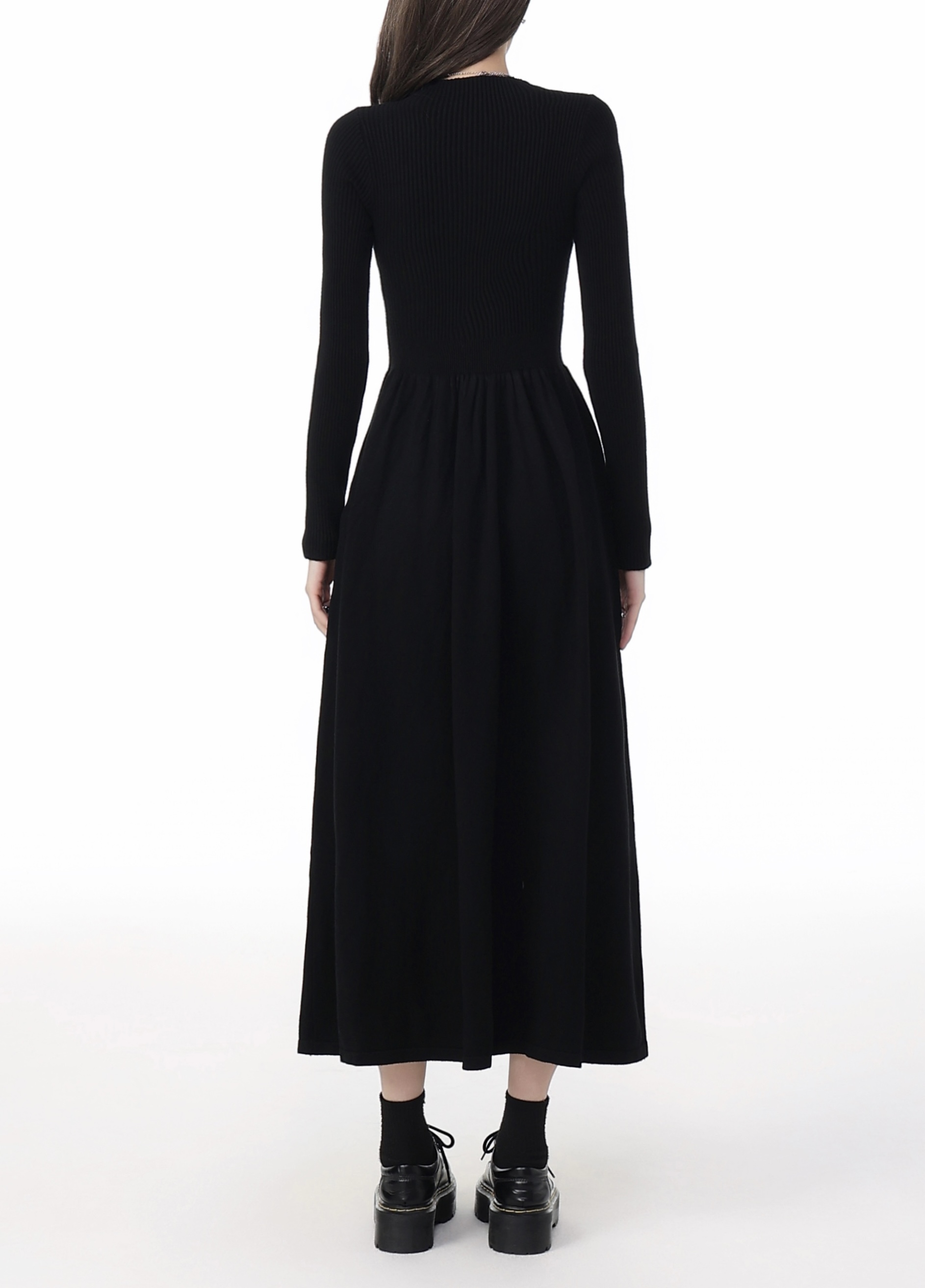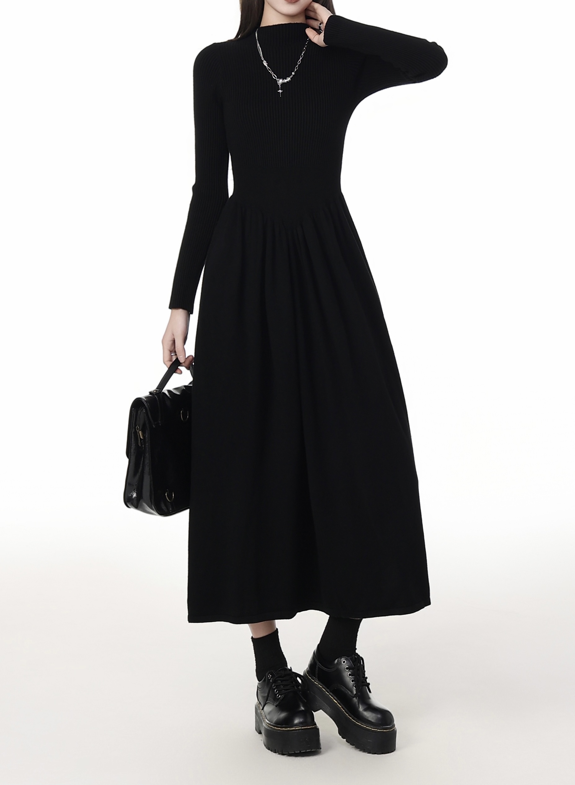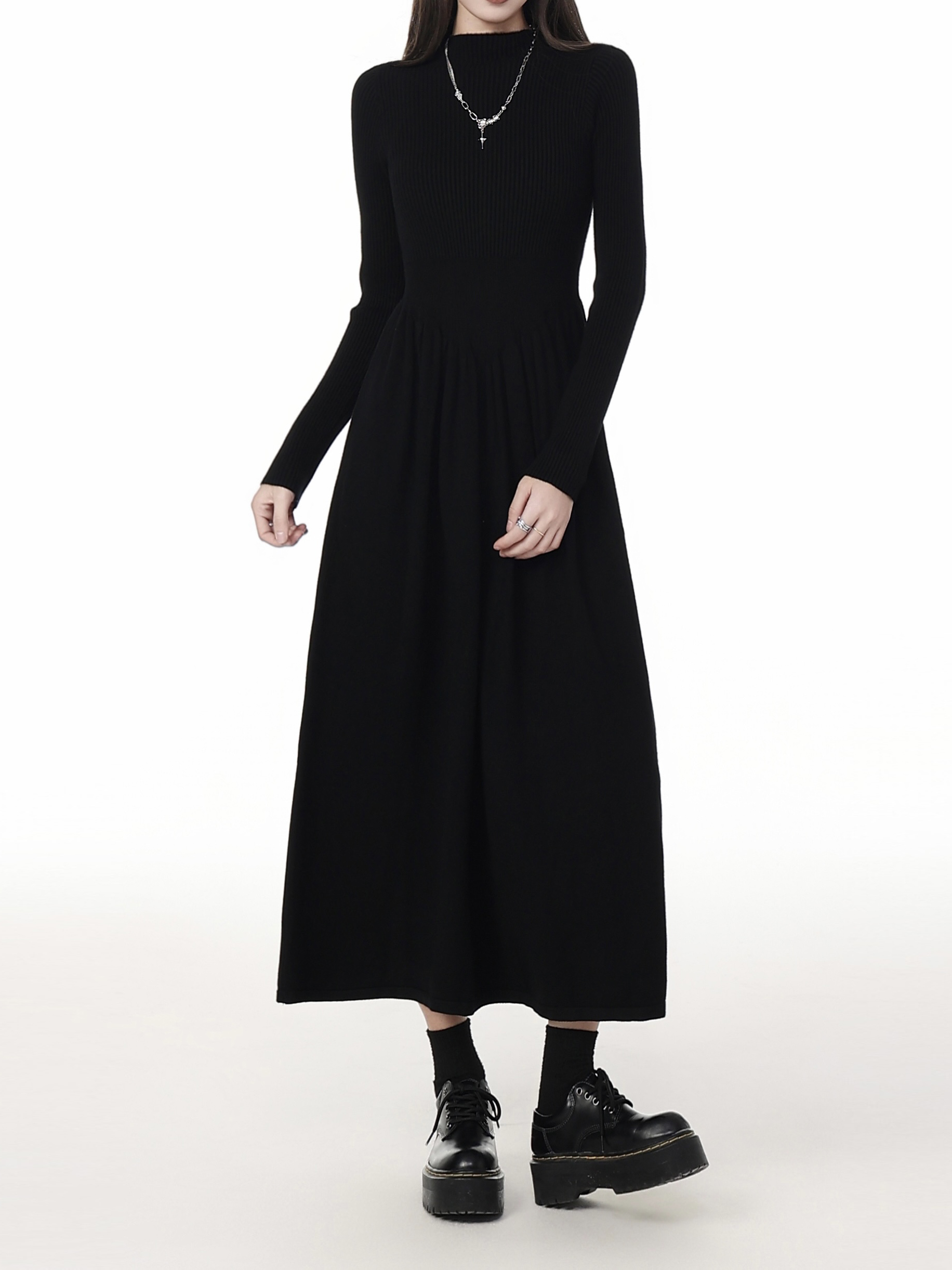 黑色半高领长袖连衣裙女2025秋季新款小个子收腰显瘦修身中长款裙