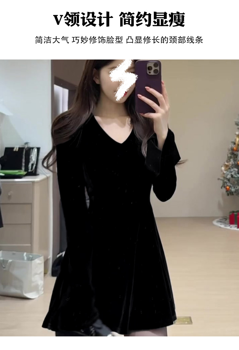 黑色V领针织连衣裙短款女秋冬季大衣内搭小个子收腰打底小黑裙子