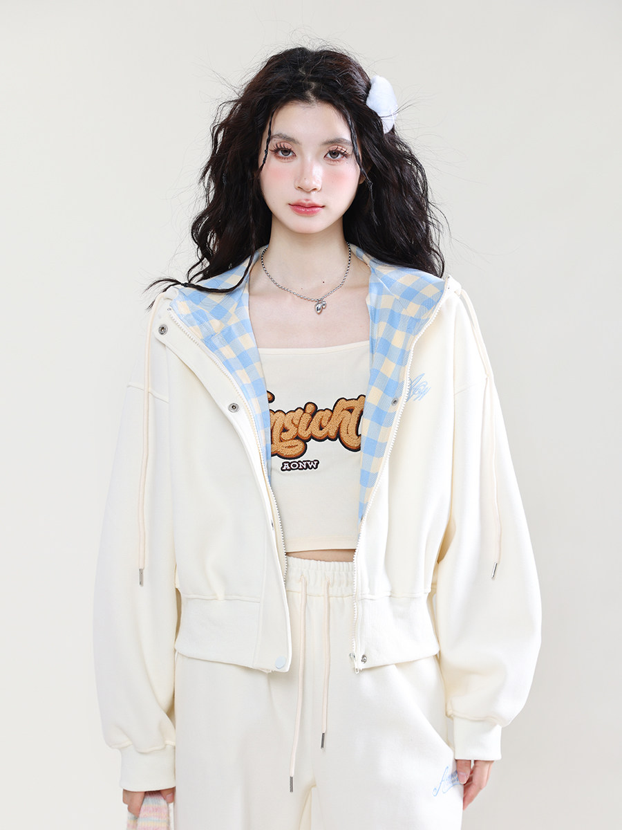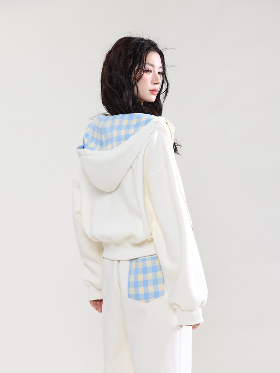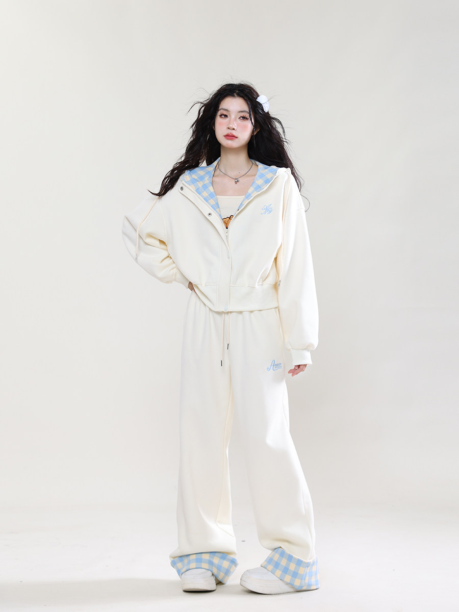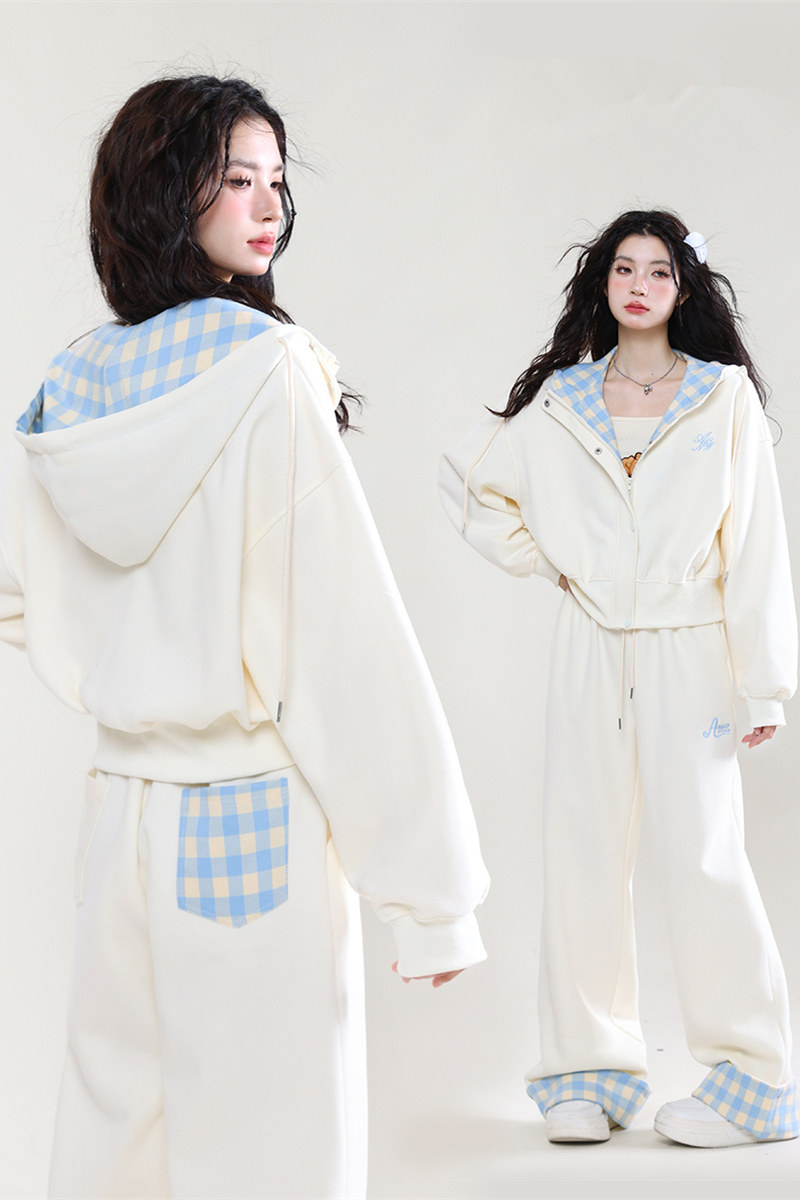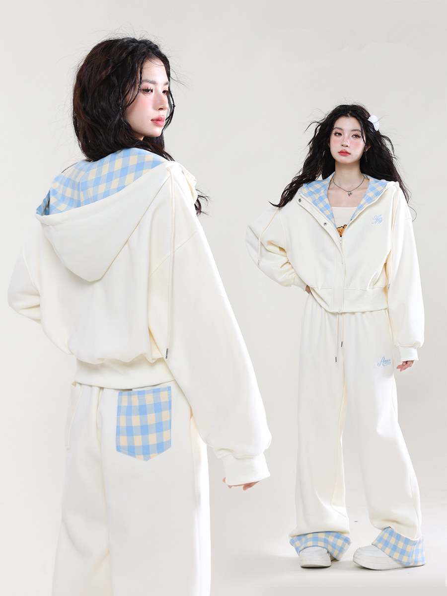 学院风运动服套装女春秋学生韩版宽松显瘦格子连帽卫衣休闲两件套