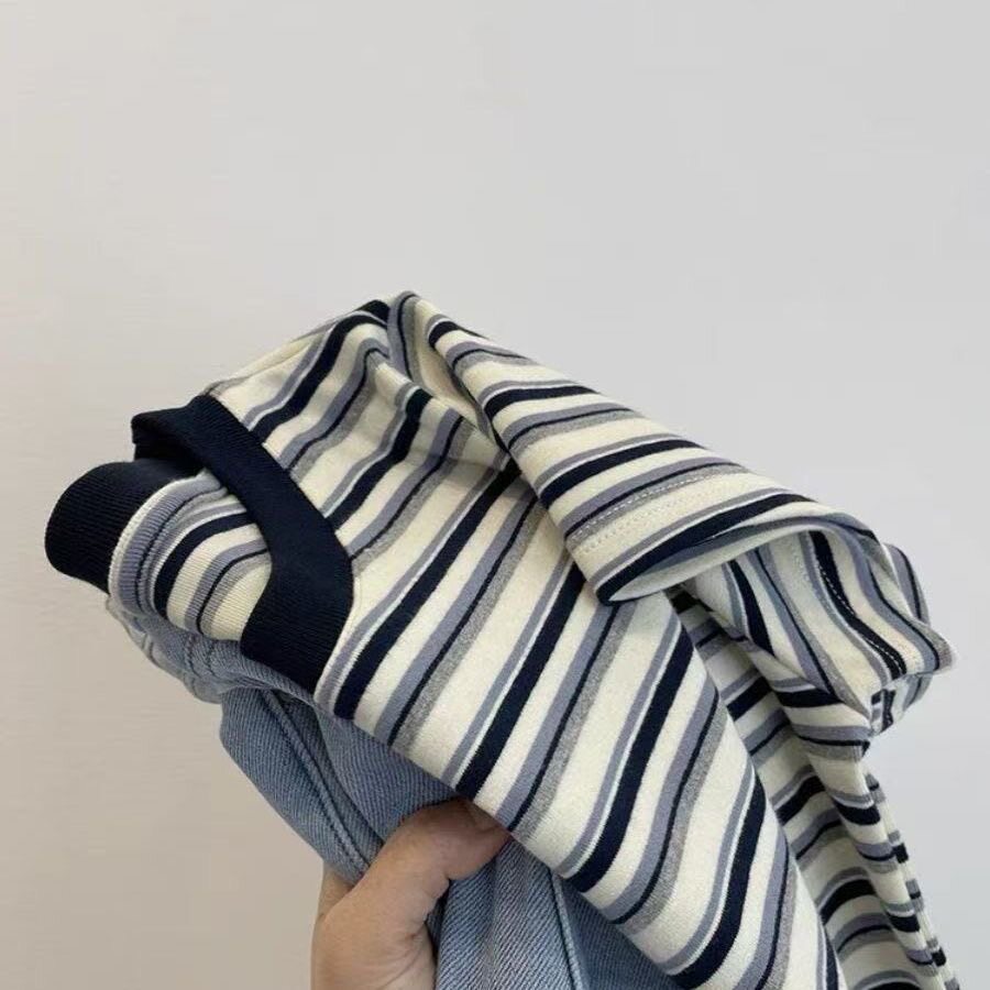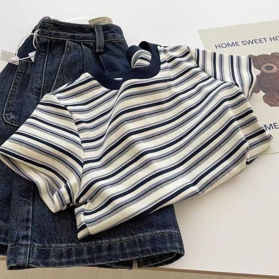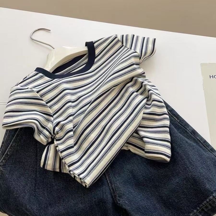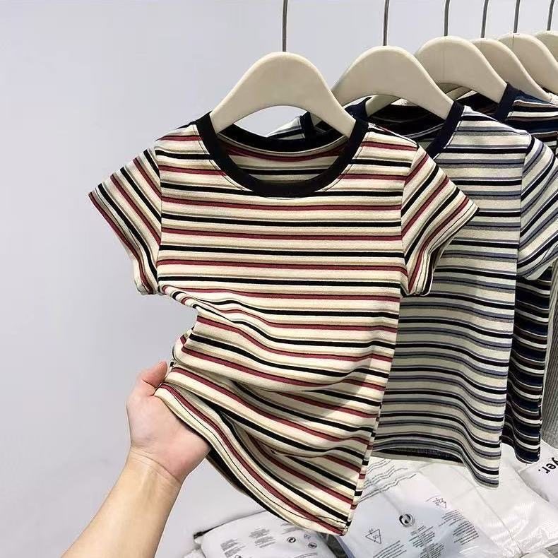 韩系ins正肩条纹短袖T恤女2026夏季新款洋气圆领撞色短袖上衣女潮