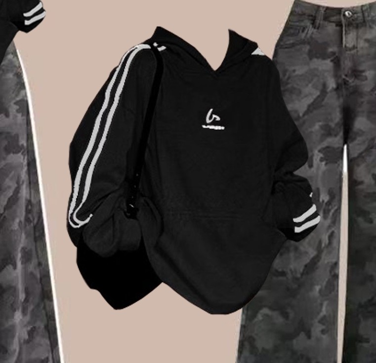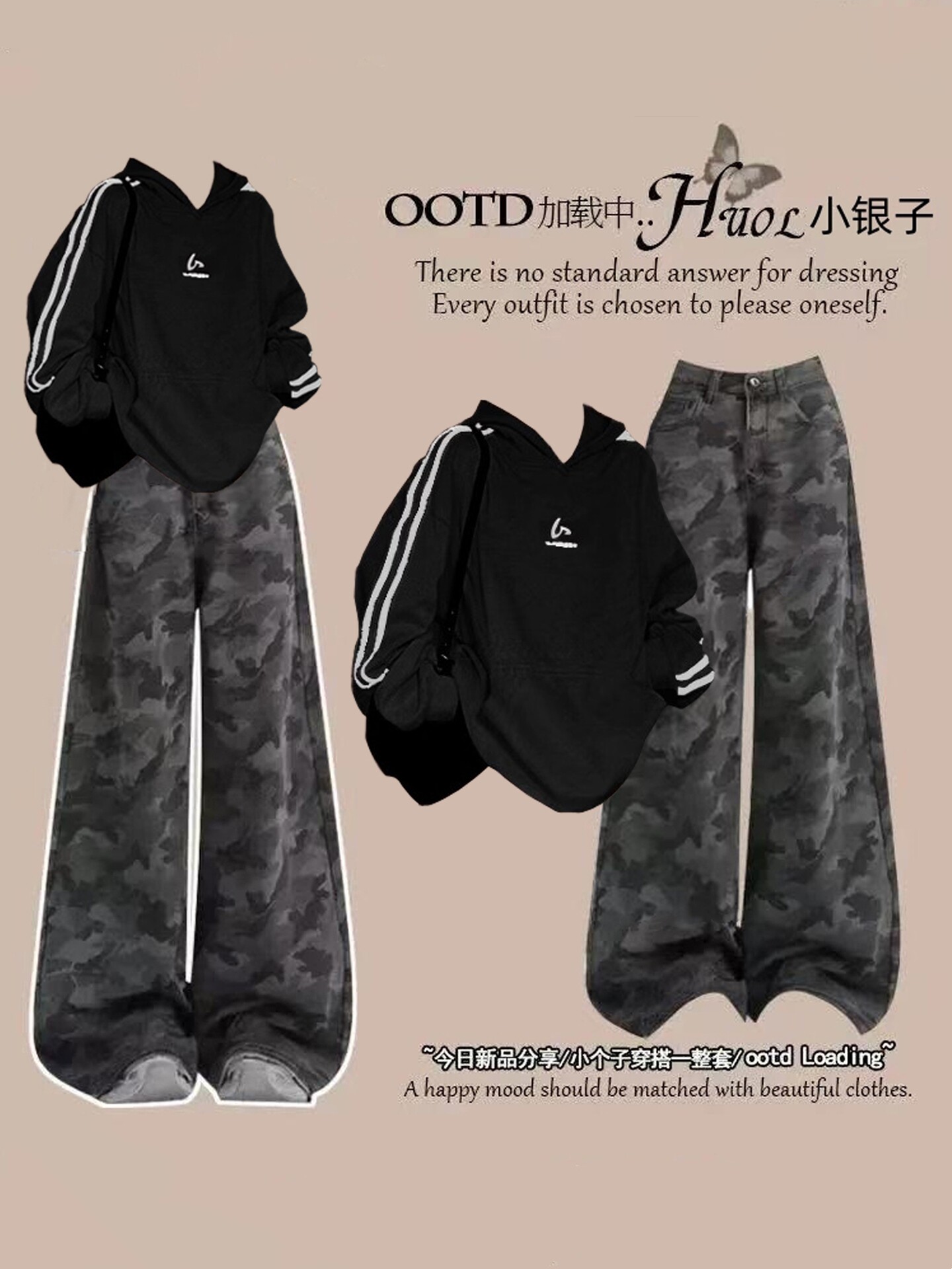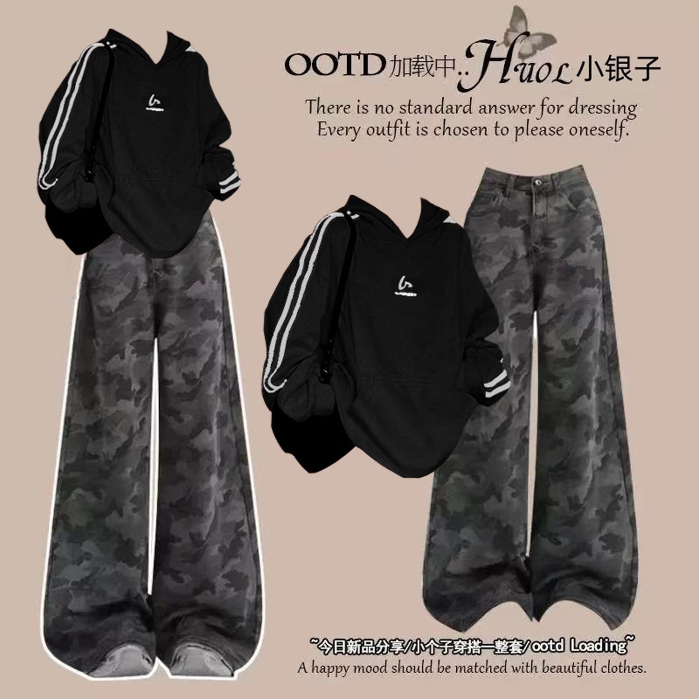 学院风搭配一整套早秋季韩系连帽卫衣又a又飒炸街迷彩裤两件套装