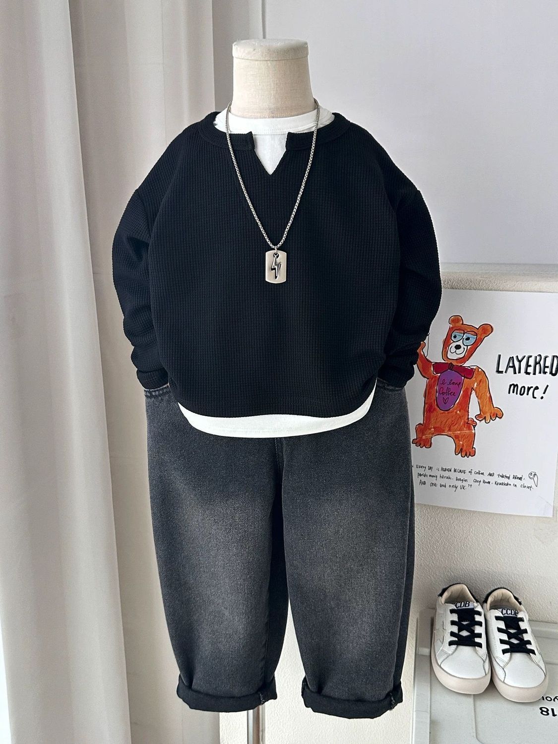 男童拼接假两件上衣秋冬新款中大儿童华夫格长袖t恤痞酷帅加绒衫