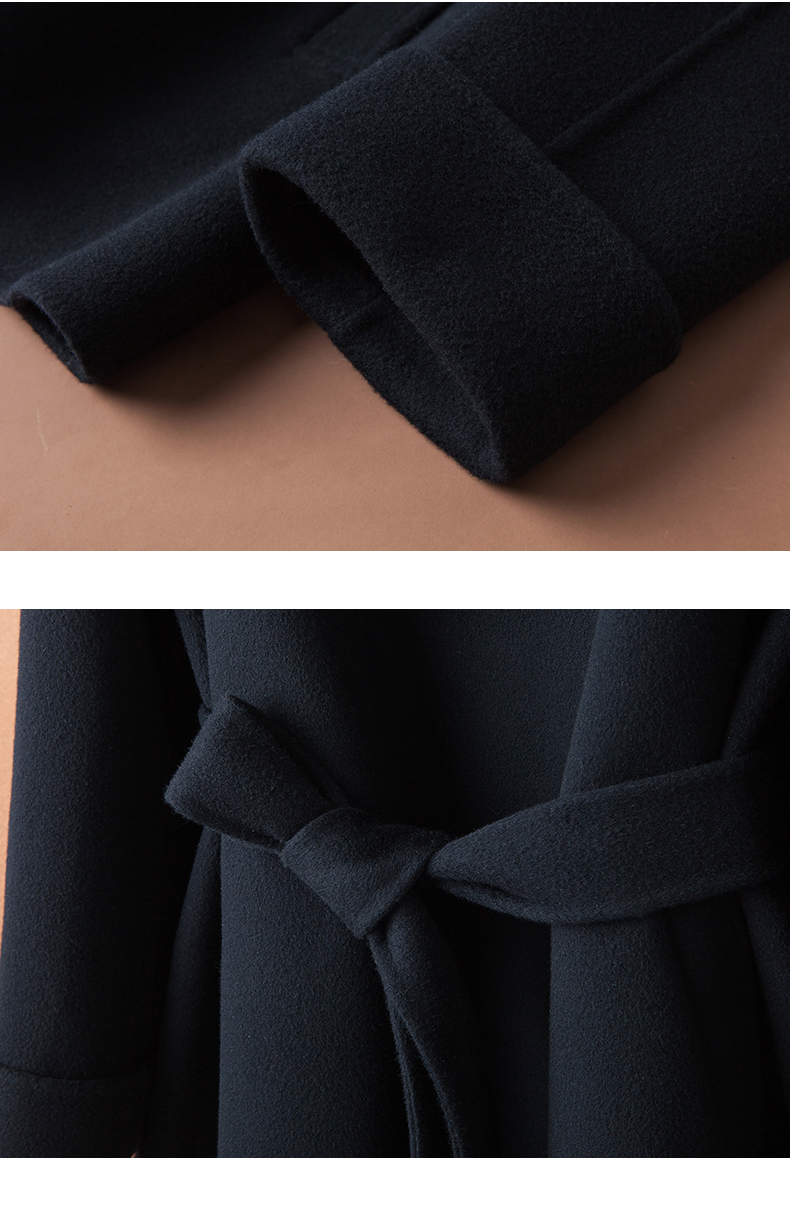 墨青色双面羊绒大衣女中长款2025新款秋冬季立领系带收腰毛呢外套
