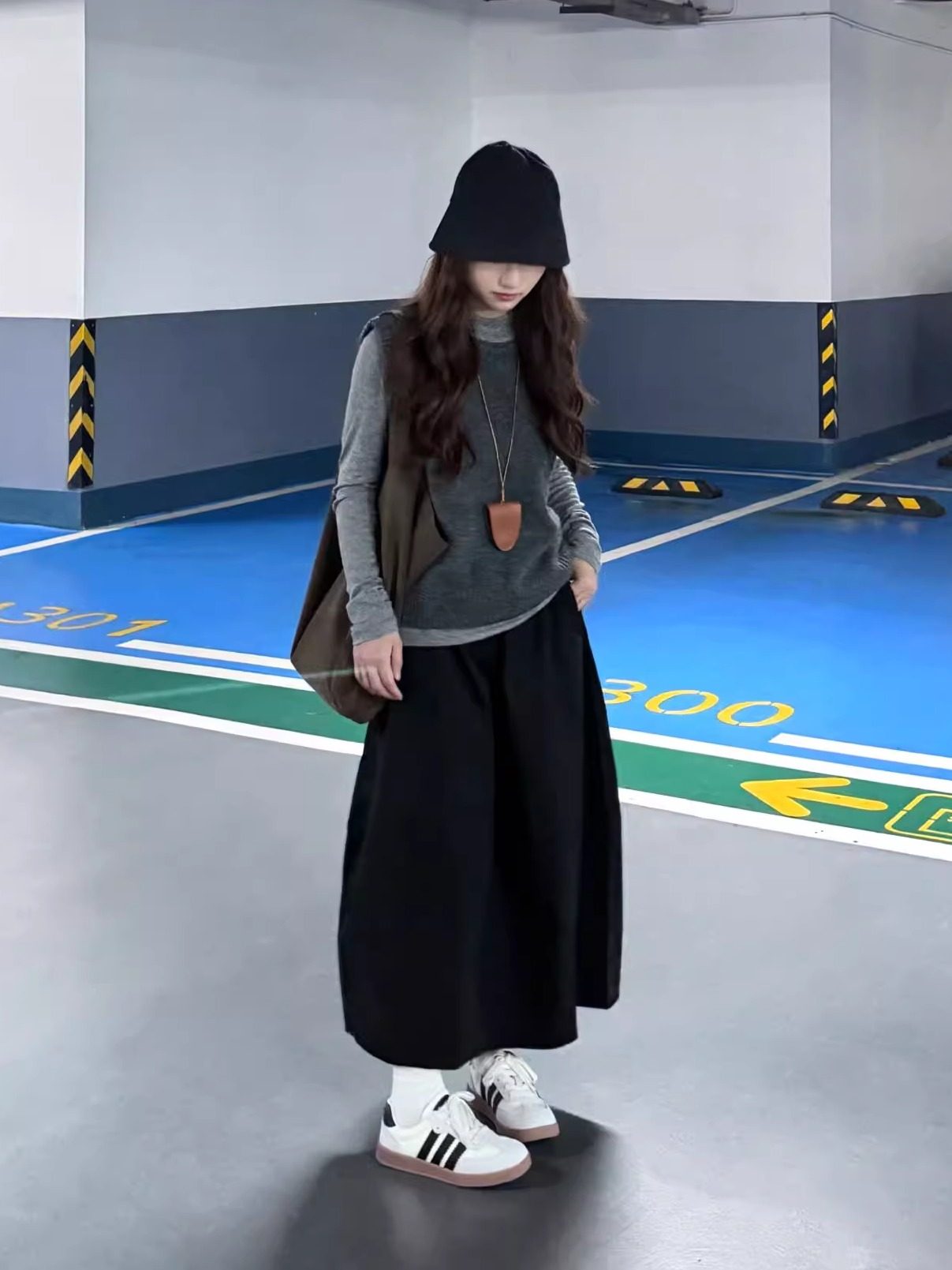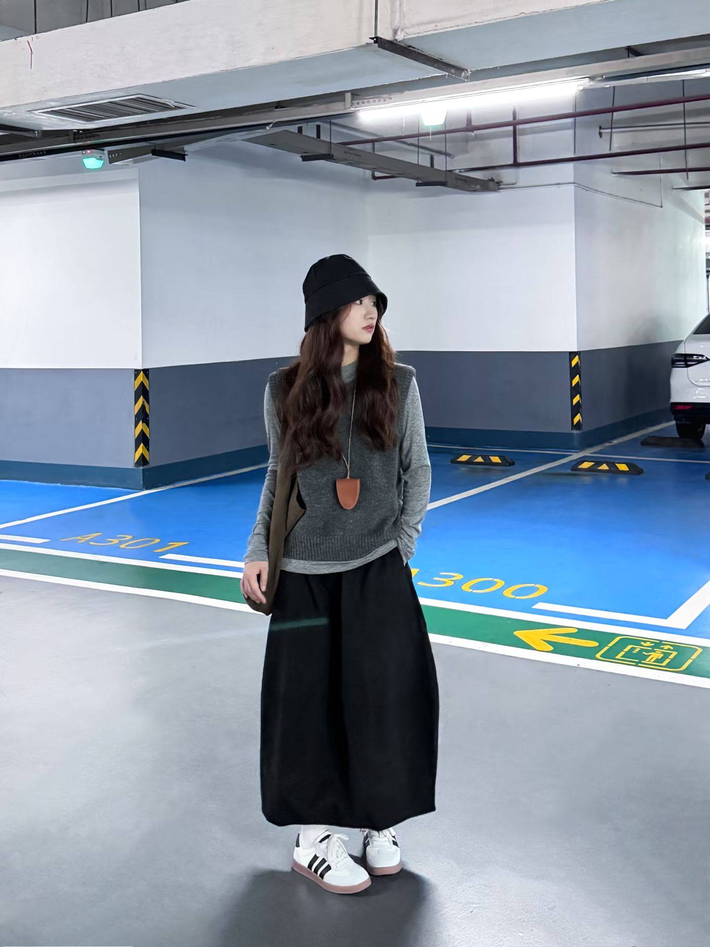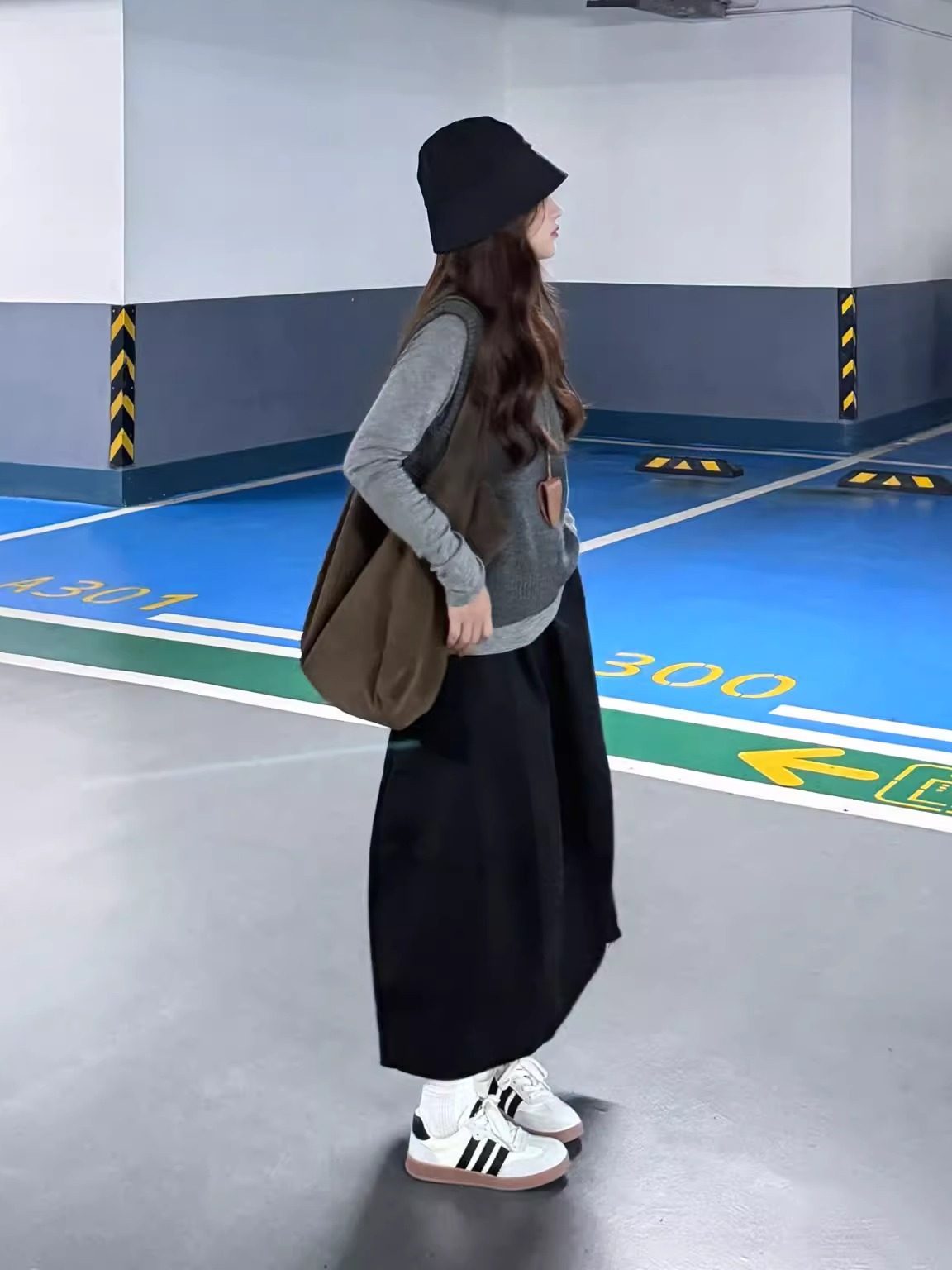 韩系早秋穿搭一整套女装气质灰色针织马甲叠穿T恤半身裙子三件套