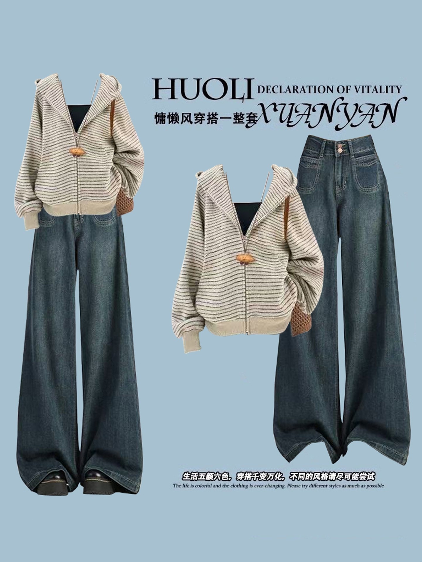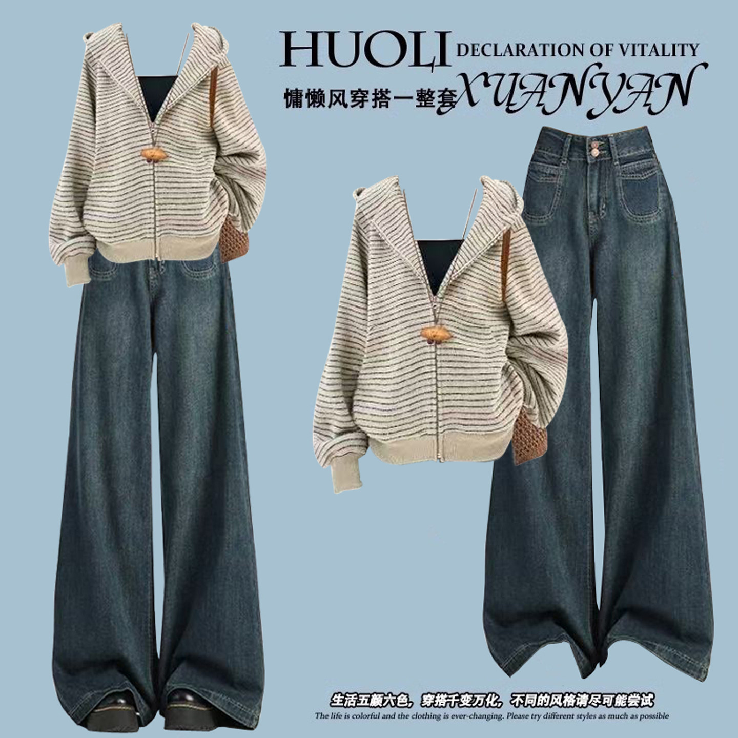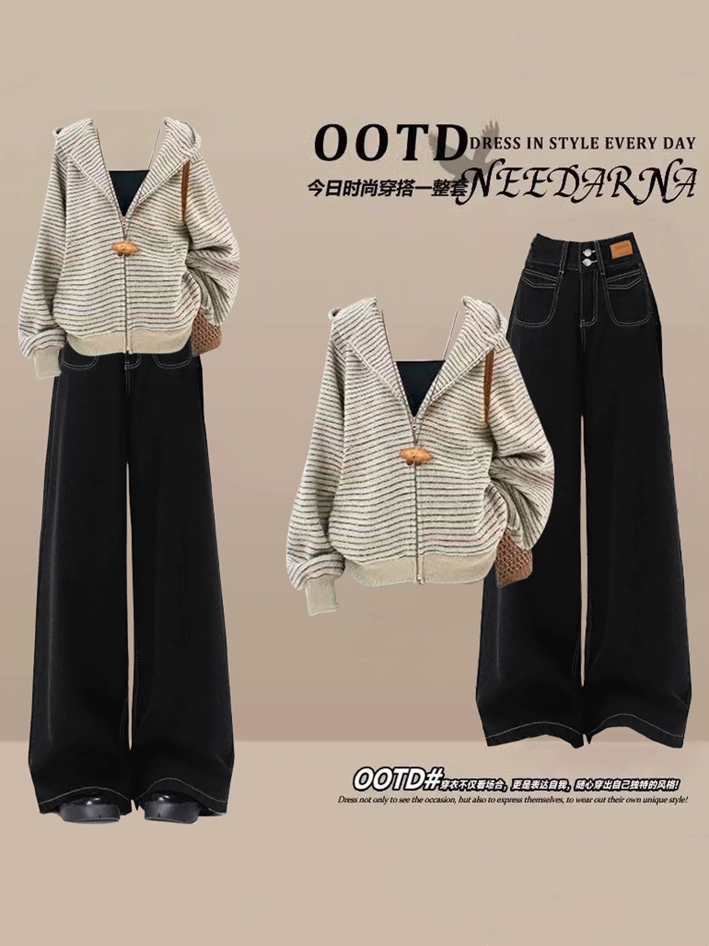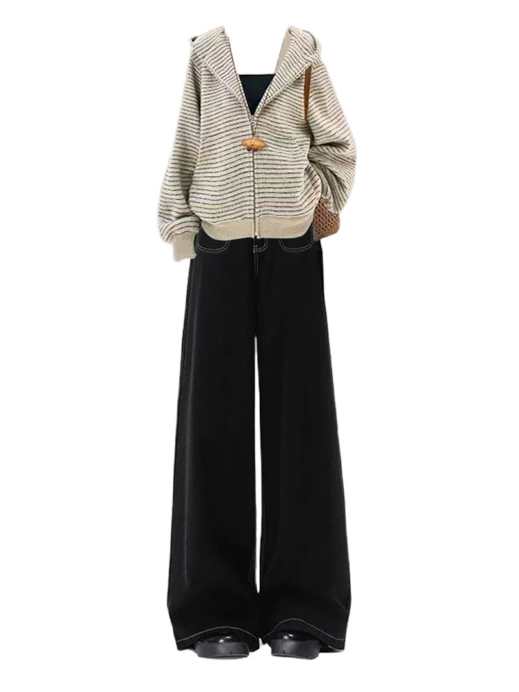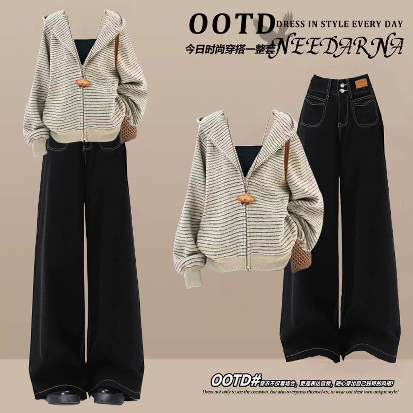 巨好看的韩系秋季搭配一整套ootd穿搭独特条纹连帽开衫卫衣套装裤