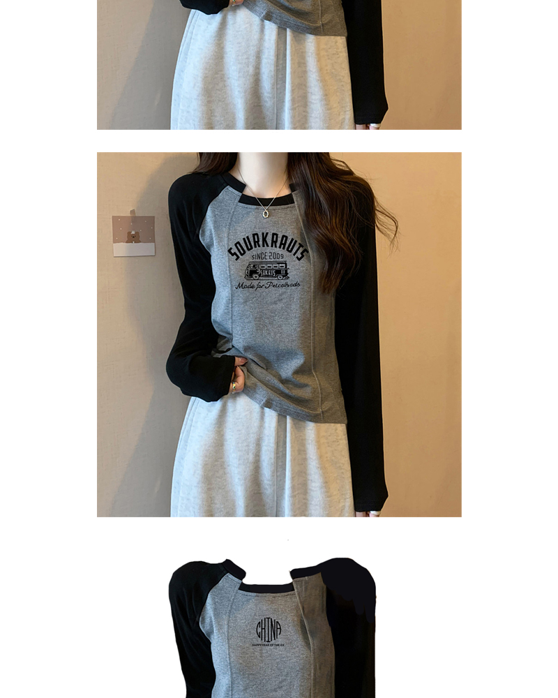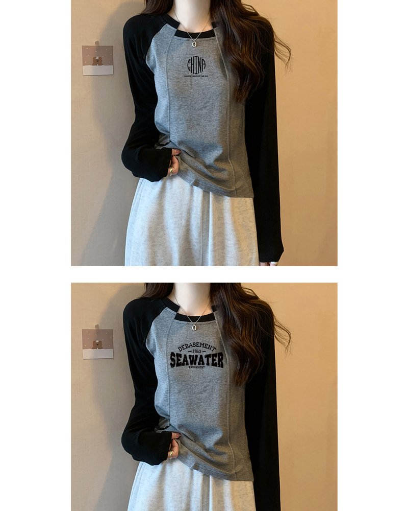 黑灰撞色女T恤显瘦遮肉打底长袖女上衣春秋时尚外穿胖mm大码女装