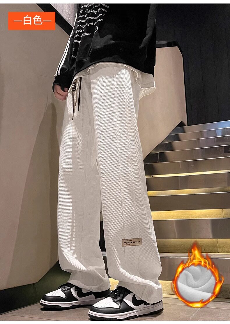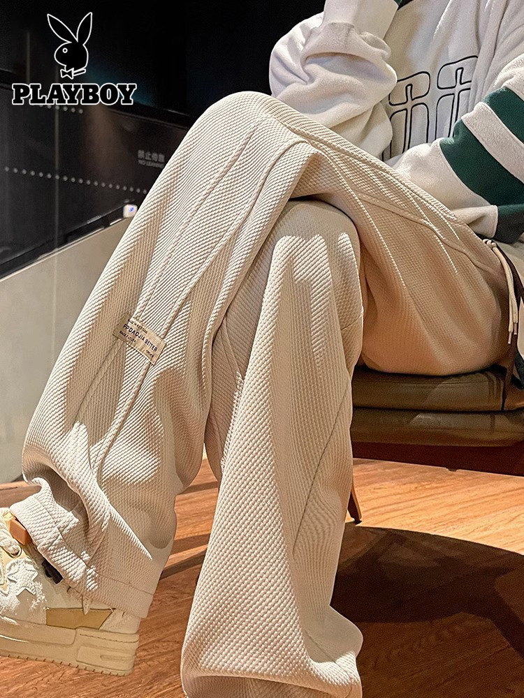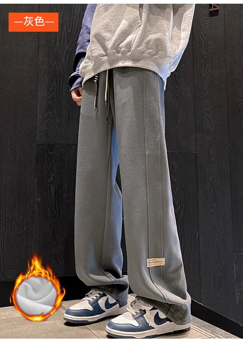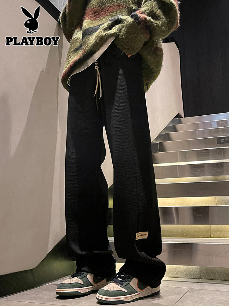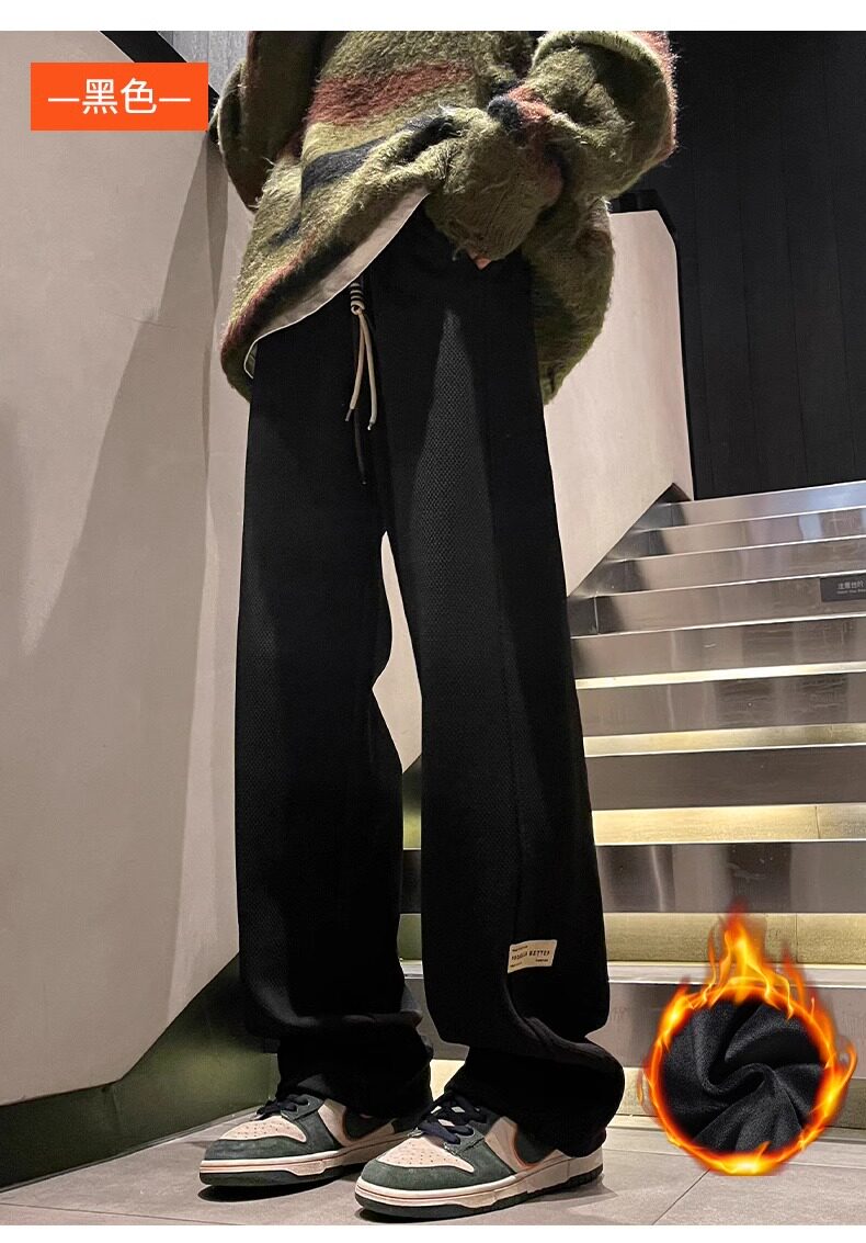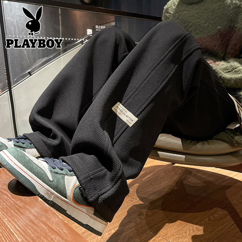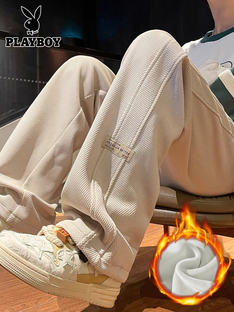 花花公子秋冬季新款卫裤男士运动宽松直筒加绒加厚阔腿休闲长裤子