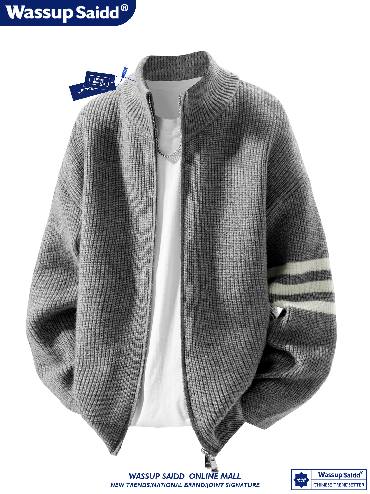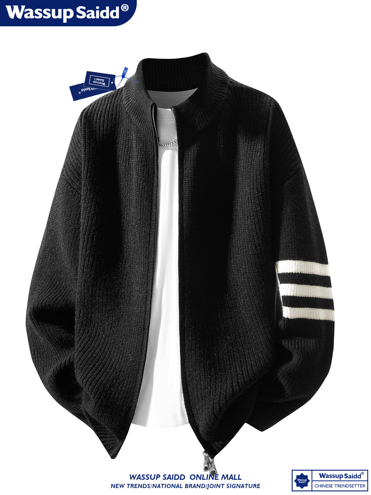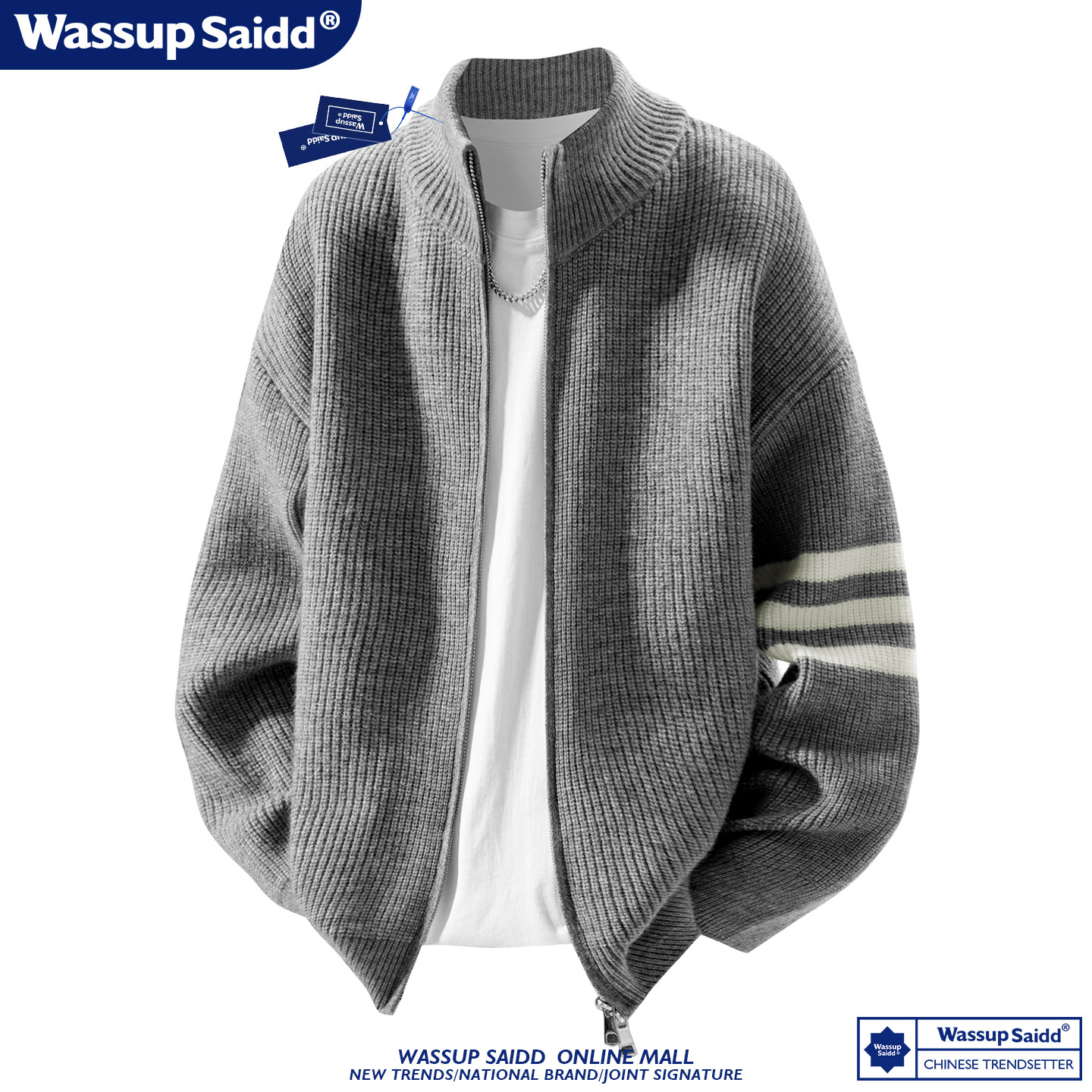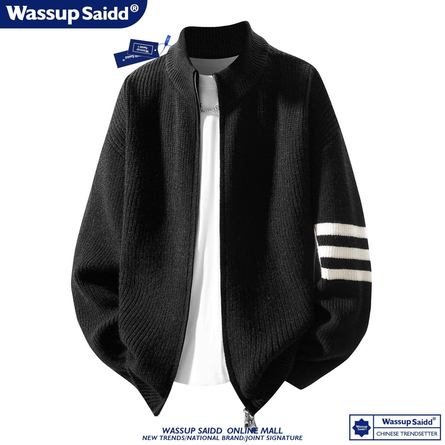 WASSUP SAIDD立领开衫毛衣男款秋季美式风条纹针织衫宽松休闲外套