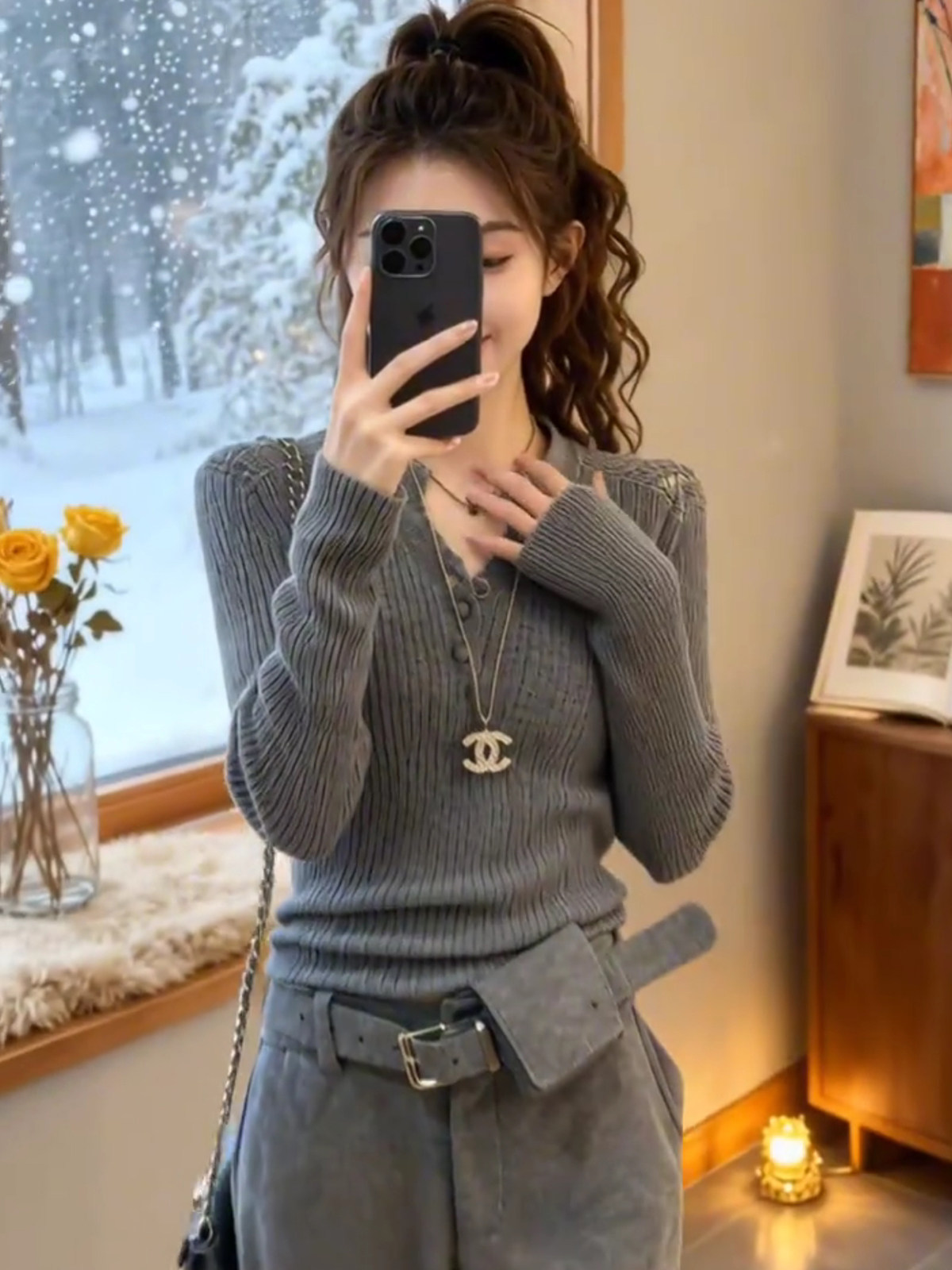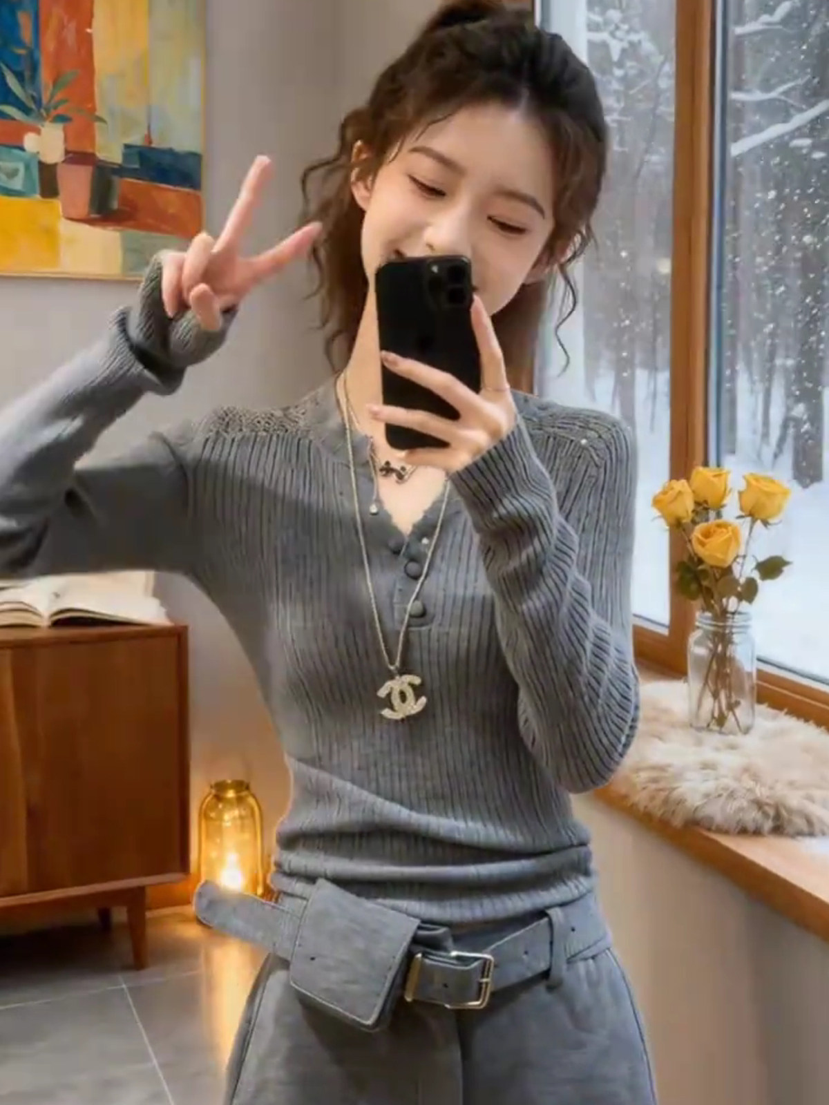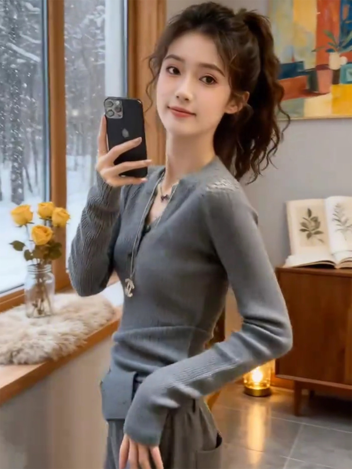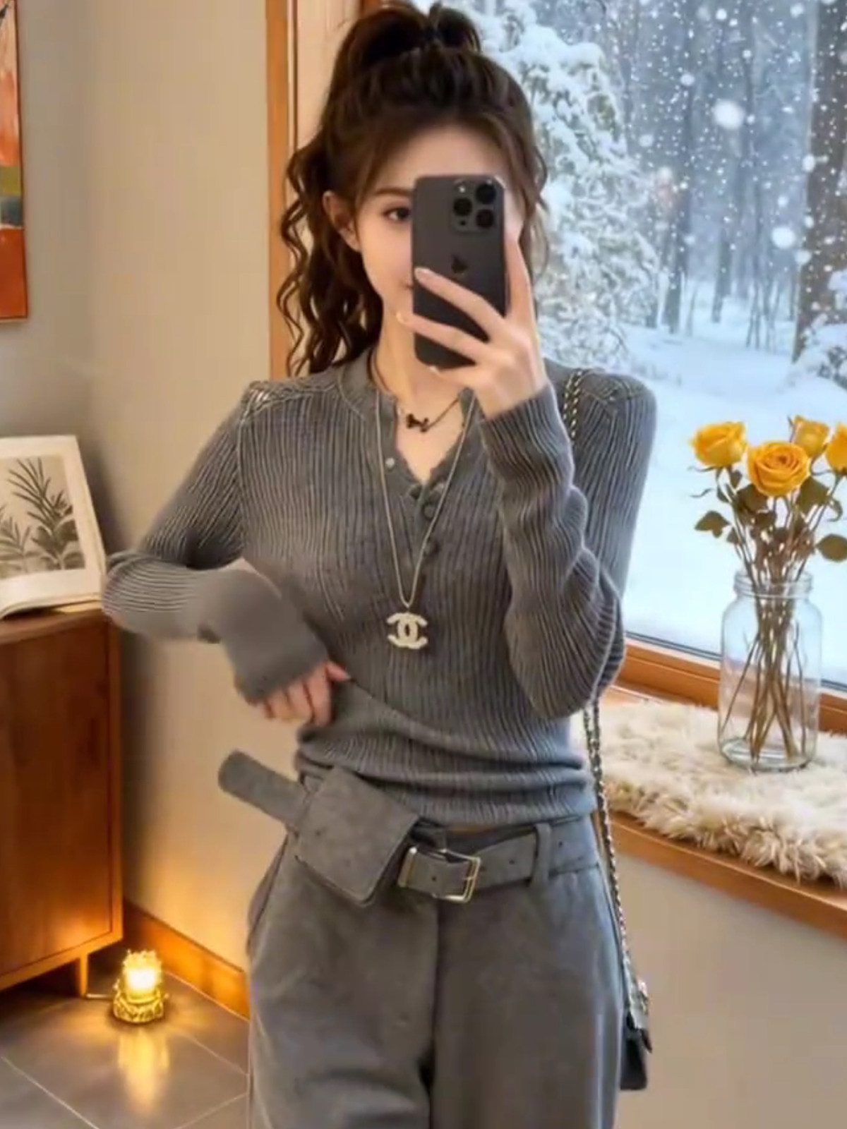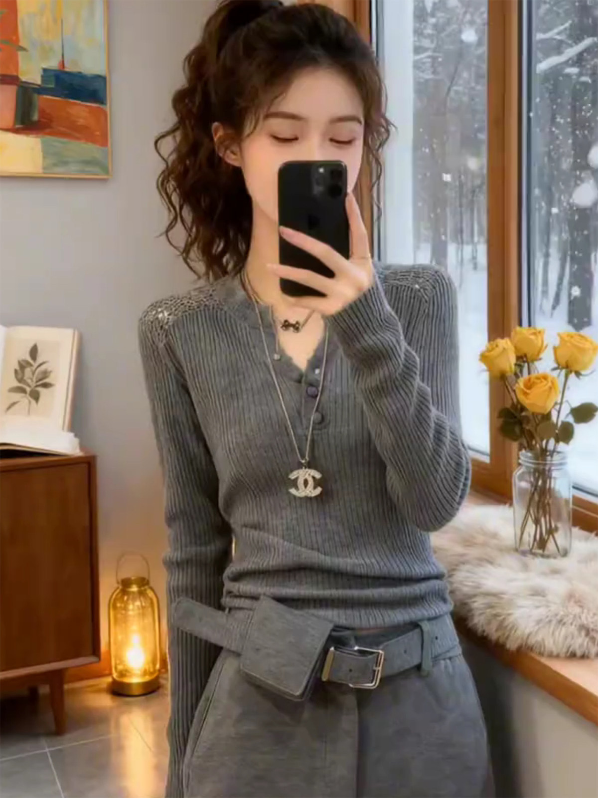 灰色镂空半开领长袖针织衫女秋冬新款设计感修身显瘦打底洋气上衣